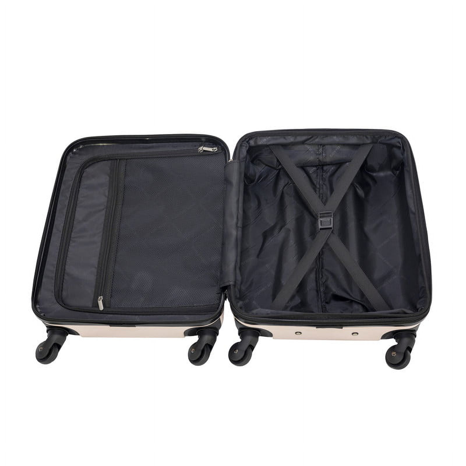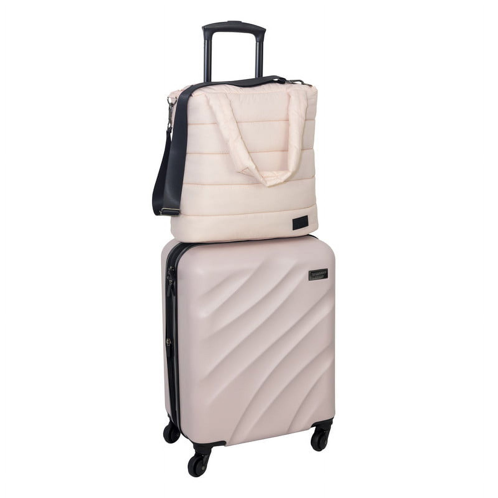 Consists of: 20” Hardside Exp. Vertical and 15” Puffy Quilted Carry-All The hardside piece is made of rugged ABS plastic and has a push-button telescopic handle, 360 spinner wheels and fully lined interior. It also expands for added packing capacity and has adjustable compression straps to hold contents in place The softside tote has thick, padded carry handles and can slide over your hardside carry-on luggage It also has an adjustable/removable shoulder strap and zippered interior pocket