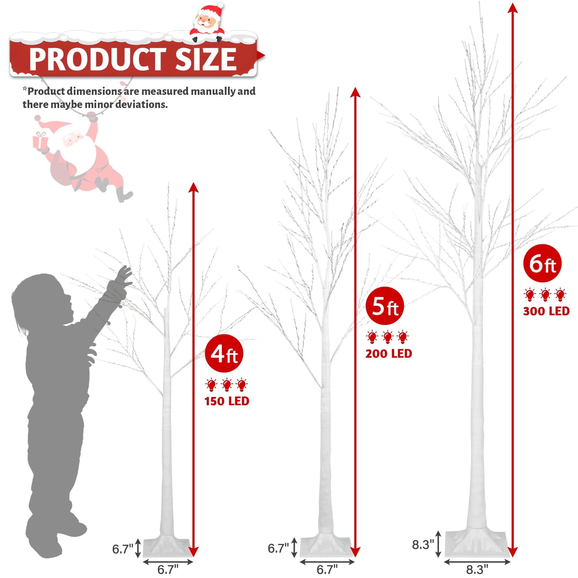 SEGMART latest upgraded version of the Christmas tree set adds timer and Velcro functions, making it more user-friendly and stable to use. The Christmas tree set adopts superior PVC material as well as fine workmanship, this tree is of great durability. The Christmas tree set comes with a 6Ft/5Ft/4Ft height, plug-in to use. The warm LED light and natural white stems combine for the perfect accent in your yard, front door, or living room for year-round decor. Each branch is embellished with realistic LED lights. LED lights meet the need for brightness, energy-saving and a long life span which is up to 30,000 working hours. It is also a new bright spot in home decorating for Christmas night. Come on, do not miss this valued Snowflake Christmas tree. 1. 3 Piece Christmas Tree Set The prelit white birch Christmas tree sets include heights are 6ft, 5ft, 4ft, including but not limited to Christmas, Easter, Valentine’s Day, weddings, restaurants, family, bedrooms, courtyards, etc. Suitable for indoor and outdoor. 2. Real White Artificial Birch Tree The luminous birch Christmas tree has a solid trunk, and curved branches entwined with warm yellow light, the branches can be customized to any shape as needed, and the holes on the base are convenient to fix the trees on the outdoor lawn or other places. 3. Eco-friendly Material The blades of our Christmas tree are made from high-quality PVC material, which not only makes the tree looks more real and more full but also adds anti-crush capacity to the tree. 4. PE Stand with Velcro The SEGMART Christmas tree uses a PE stand instead of a cheap plastic stand, and add a plastic cover on the end of the stand. In order to make the tree light stand more stable, we added Velcro at the base to increase stability and protect your floor. 5. Energy Saving & Timer up to 30,000-hour bulb life. Durable and break-resistant, cool to the touch when lit. And we have added a new timer, you can set the duration of the light, so you no longer have to worry about the problem of always being on. 6. Easy Setup Assembly only requires four steps! The lightweight LED is easy to carry and store, has a long service life, and can be reused for a long time. 7. Elegant Decorations Artificial silver birch, bring nature’s beauty into your home. The stable base of the square stand. As lights, Mini Cute Bonsai, jewelry holder, Night Light used for Home, Office, Wedding, Party, and Bedroom. 8. 100% Warranty We offer you a 100% risk-free satisfaction guarantee to let you buy with confidence. We are quite sure that you will be super-impressed with the high quality of our Christmas tree. Features: 1. New and high quality 2. Christmas tree looks full of energy 3. Surely you had a happy Christmas 4. Made of PVC, durable in use 5. Exquisite appearance and safe design Specifications: Item Name: 3 Pieces White Birch Christmas Tree Material: PVC + LED Height: 4FT&5FT&6FT Weight:7lbs Number of LED lights: 150 LEDs (4FT), 200 LEDs light (5FT), 300 LEDs (6FT) Light color: warm Power supply: 24V adapter power supply Package Includes: 1 x 6FT Birch Tree 1 x 5FT Birch Tree 1 x 4FT Birch Tree 1 x Adapter