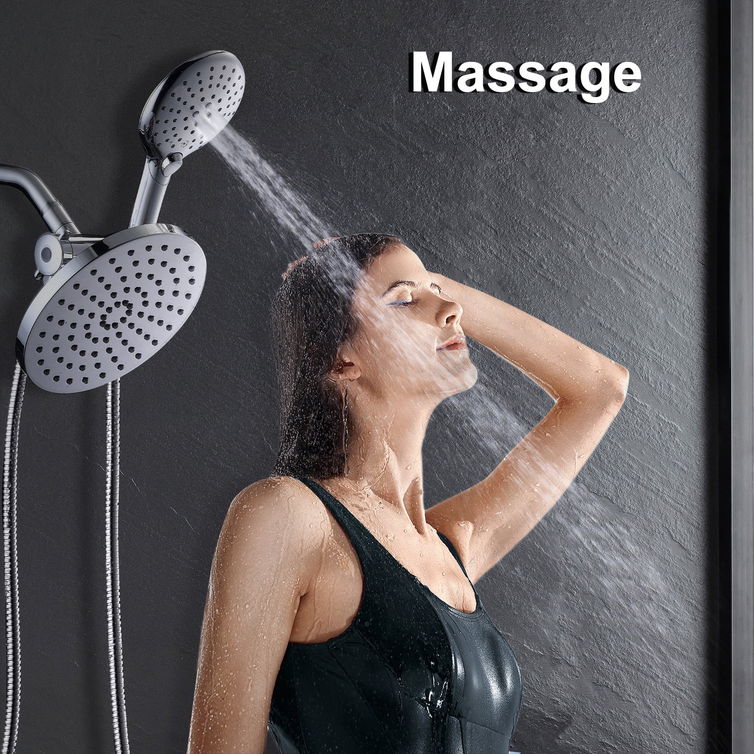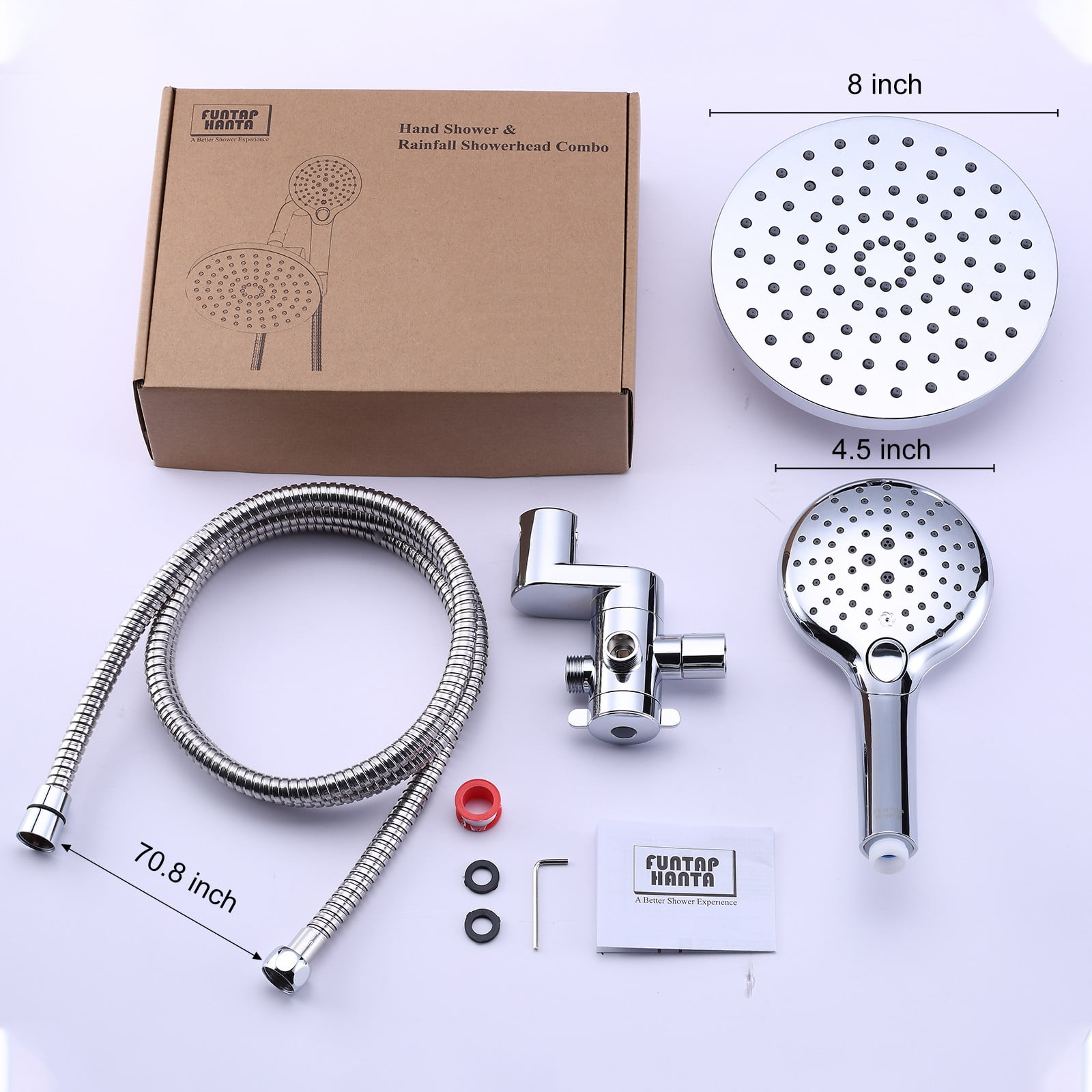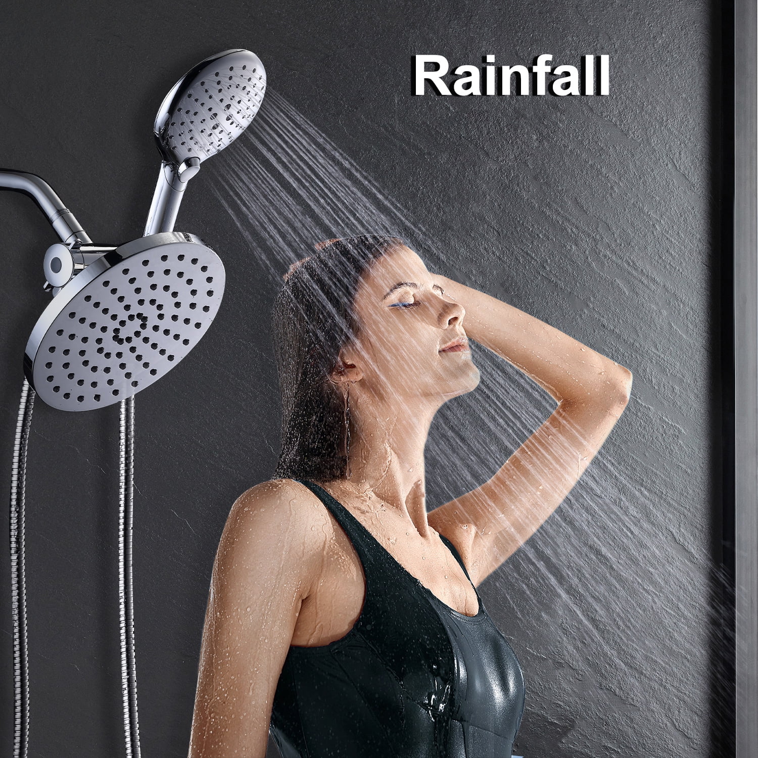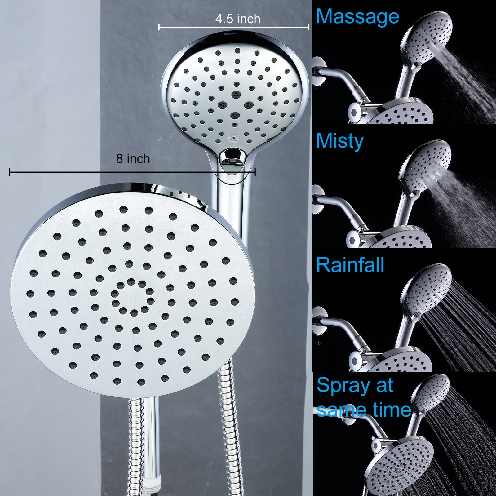 High Quality Durable High Pressure Dual Head Shower head – The shower head is made of sturdy ABS material with chrome finish to prevent rust and the connector is made of brass, always in the best condition to provide you with a high class showering experience. Shower settings – This shower combination has 6 shower combinations and 4 shower settings, you can switch between them at the touch of a button, you have massage, mist, rainfall and spray, while you always find what you want. 360° Rotatable Metal Fittings – Fixed shower heads have brass made swivel ball fittings that can be adjusted at any angle. With the high quality brass adjustable fittings, you can always find the right angle for you. Large Surface High Coverage – The luxurious high coverage of the large 8-inch round rain shower head and 4.5-inch hand shower with high pressure water flow path is designed to truly feel the “rain shower” shower experience, allowing your whole body to relax as the hot water falls. Anti-clogging nozzle- Soft TPE anti-clogging nozzle with up to 64 nozzles allows the shower to provide an excellent rain shower, squeeze the nozzle to easily remove the clog and refresh. 1 * Shower Head 1 * Handheld Shower 1 * 70.8in Stainless Steel Hose 1 * 3-Way Diverter Valve 1 * Teflon Tape 2* Rubber Washer 1 * Screwdriver 1 * Installation Manual 4 Modes Installation Method: Wall-Mounted Special Features: High Pressure, Easy to Install, Angle-Adjustable, Self-cleaning Jets