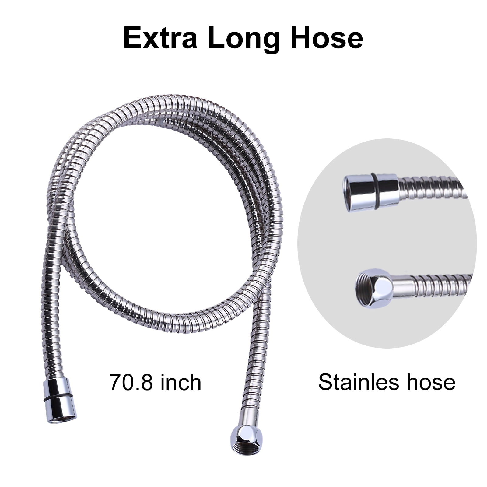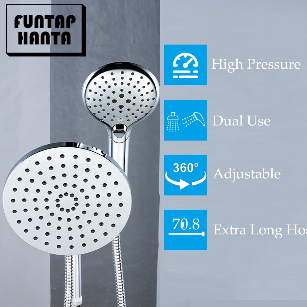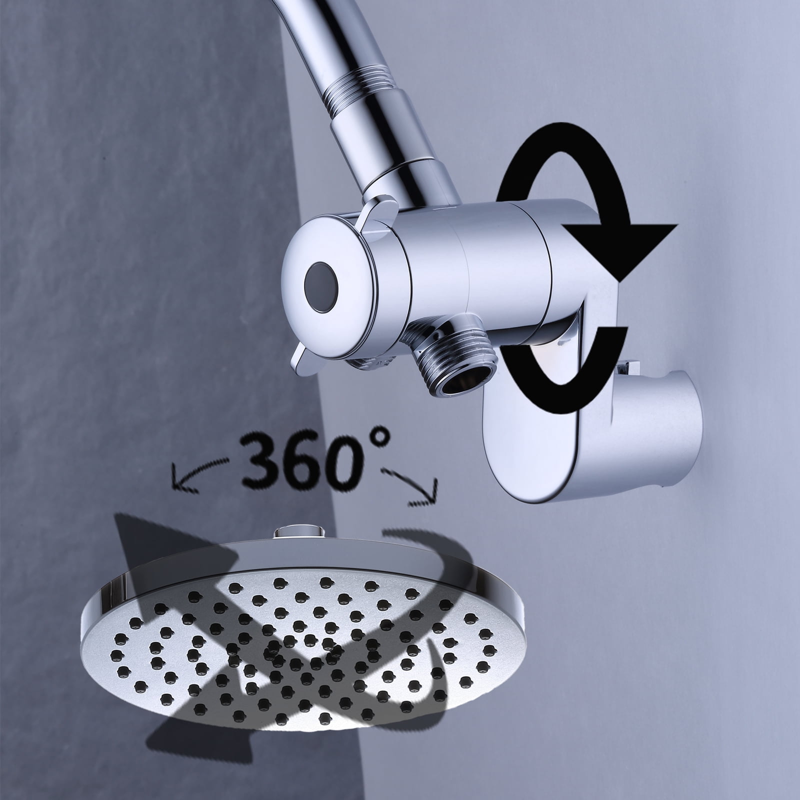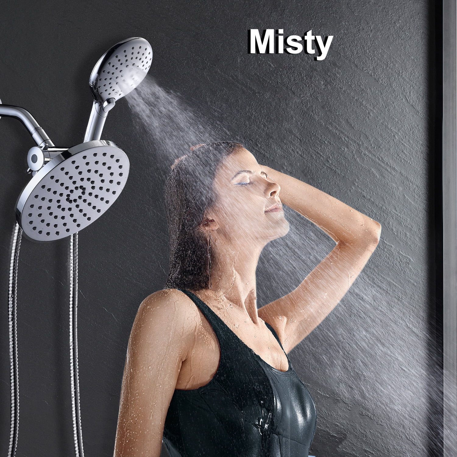 High Quality Durable High Pressure Dual Head Shower head – The shower head is made of sturdy ABS material with chrome finish to prevent rust and the connector is made of brass, always in the best condition to provide you with a high class showering experience. Shower settings – This shower combination has 6 shower combinations and 4 shower settings, you can switch between them at the touch of a button, you have massage, mist, rainfall and spray, while you always find what you want. 360° Rotatable Metal Fittings – Fixed shower heads have brass made swivel ball fittings that can be adjusted at any angle. With the high quality brass adjustable fittings, you can always find the right angle for you. Large Surface High Coverage – The luxurious high coverage of the large 8-inch round rain shower head and 4.5-inch hand shower with high pressure water flow path is designed to truly feel the “rain shower” shower experience, allowing your whole body to relax as the hot water falls. Anti-clogging nozzle- Soft TPE anti-clogging nozzle with up to 64 nozzles allows the shower to provide an excellent rain shower, squeeze the nozzle to easily remove the clog and refresh. 1 * Shower Head 1 * Handheld Shower 1 * 70.8in Stainless Steel Hose 1 * 3-Way Diverter Valve 1 * Teflon Tape 2* Rubber Washer 1 * Screwdriver 1 * Installation Manual 4 Modes Installation Method: Wall-Mounted Special Features: High Pressure, Easy to Install, Angle-Adjustable, Self-cleaning Jets