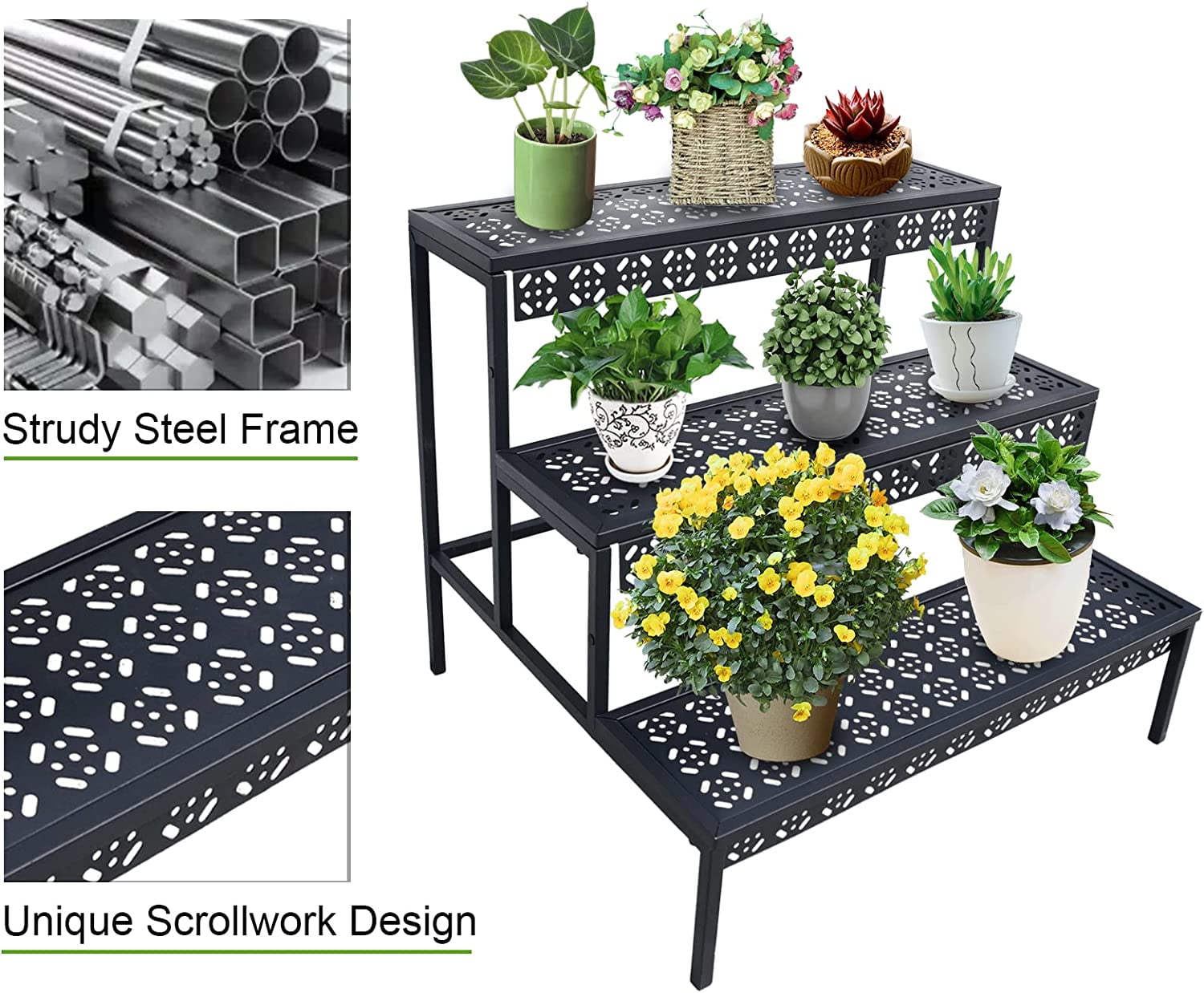 3 Tier Stair Style Metal Plant Stand, Garden Shelf for Large Flower Pot Display Rack Indoor Outdoor, Black