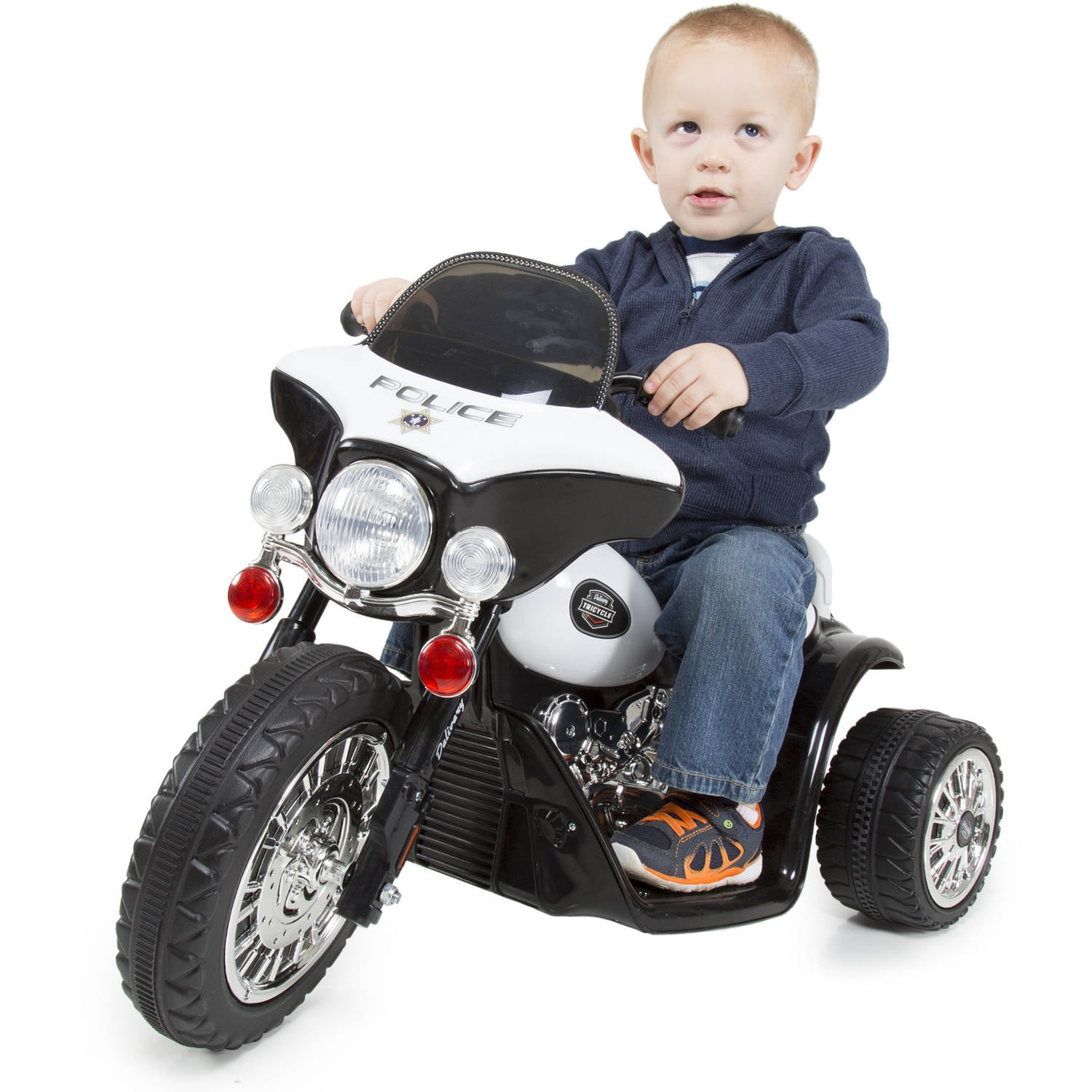 USE IT ANYWHERE ? All you need is a smooth, flat surface to have your kids on-the-go! Perfect for both outdoor AND indoor playing and can easily be used on any hard, flat surface. EASY TO RIDE ? The 3-wheel designed motorcycle is smooth and simple to ride for your toddler or young child. Charge the battery according to the included instruction manual- then simply just turn it on, press the pedal, and go! Also comes with realistic police car details that your future little officer will surely love: Sharp colorful decals, Car sound effects, Reverse ability, and Headlights that turn on and off. SAFE AND DURABLE ? Rockin? Rollers makes kids toys that are not only fun but safe. All toys are safety tested, free of banned phthalates, and provides healthy exercise and plenty of fun! Made from rugged high-quality plastics that can hold up to 55 lbs. of weight. Makes for great toys for boys and girls. Recommended ages: 2 ? 5 years old. PRODUCT DETAILS ? 3 Wheel Motorcycle is completely washable and easy to clean. Usage should always be under direct supervision of an adult. Battery: 6v 4.5ah, Speed: 1.75 mph, Motor:15 w, Dimensions: 31 inches (L) x 17 inches (W) x 21 inches (H), Materials: Plastic and Carbon Steel, Adult assembly required (with instructions), Color: Black and White SATISFACTION GUARANTEED ? Rockin? Rollers is committed to providing consumers with the absolute best price and value on our entire line of products. NOTE: This is an exclusive product of Rockin? Rollers and ONLY 3 Wheel Mini Motorcycle Trike by Rockin? Rollers are GUARANTEED to be genuine.