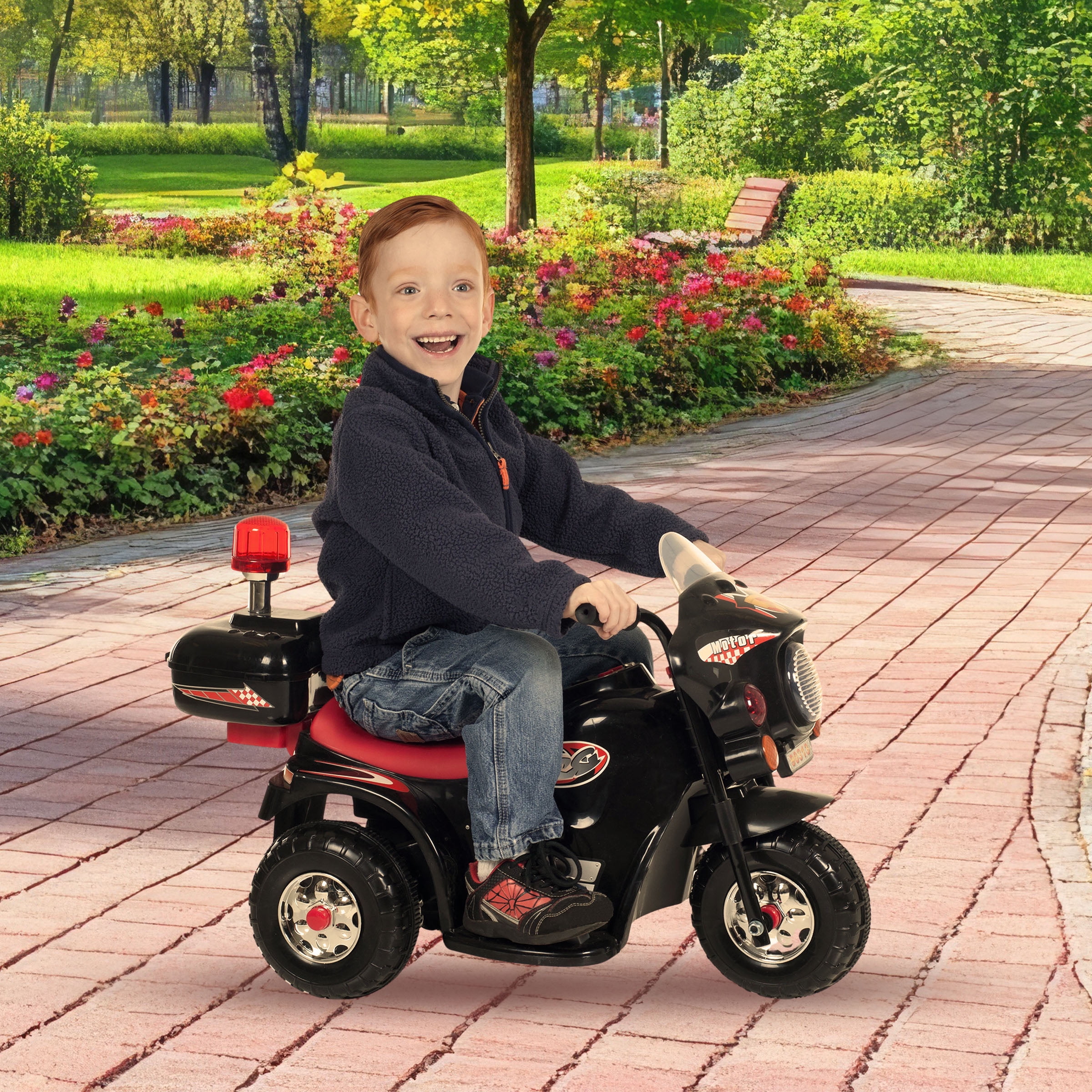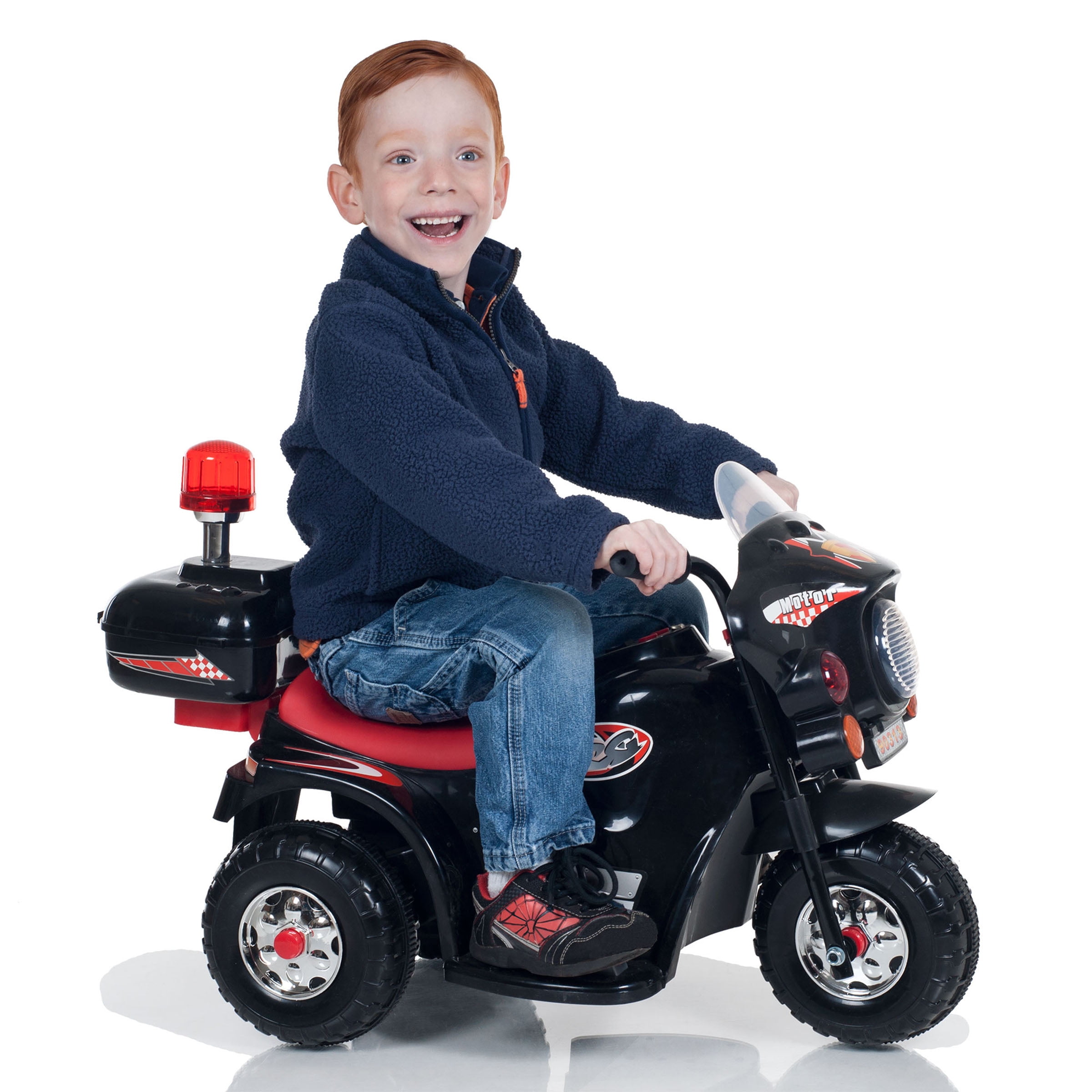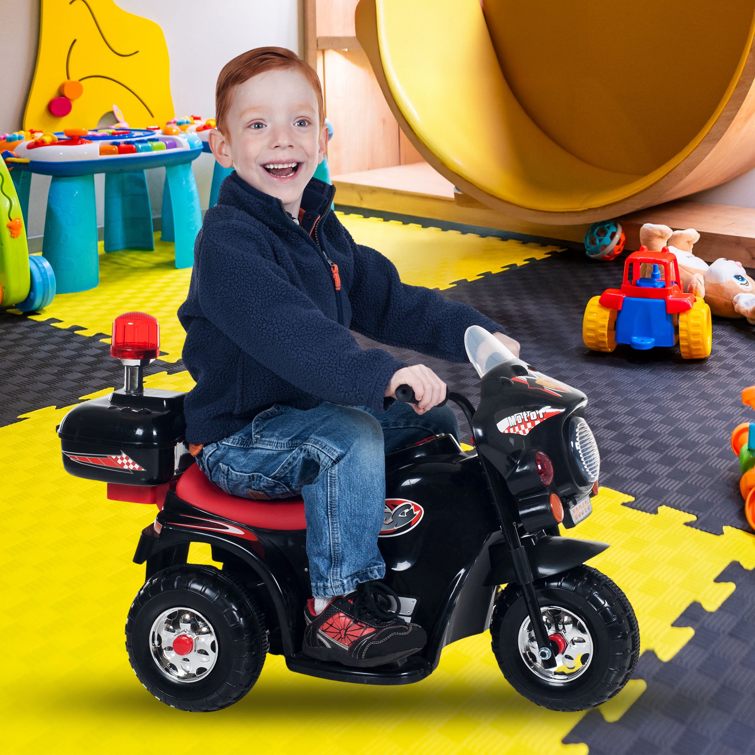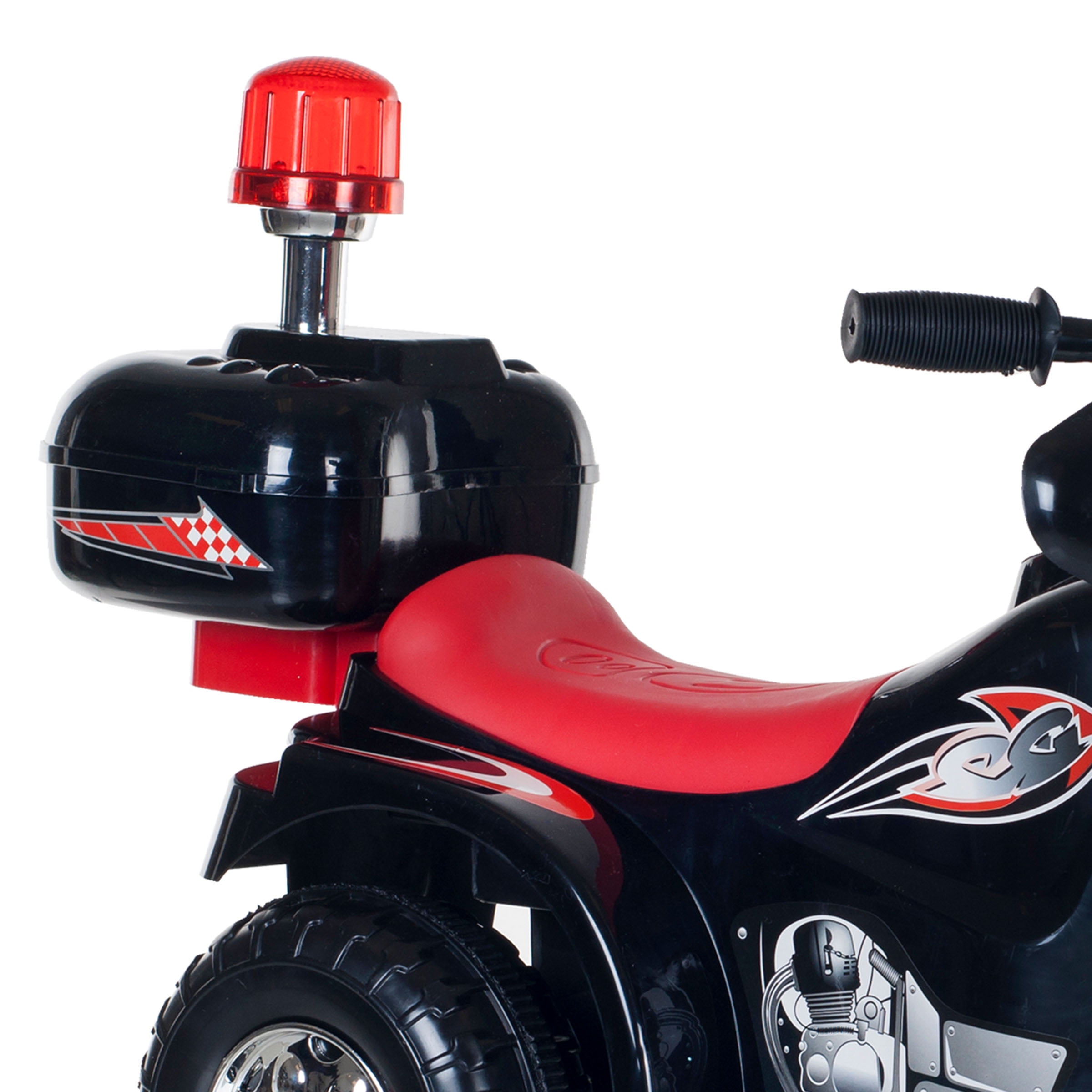 MOTORCYCLE FOR KIDS – Satisfy your child’s need for imaginative play with this electric bike for kids. Perfect for indoors and outdoors, the toddler motorcycle works on any hard, flat surface and has a compact, lightweight design for easy transport. REALISTIC FEATURES – The kid’s electric bike features engine sound effects, working headlights, behind the seat storage, and police decals for extra fun. The toddler ride on has both forward and reverse functions, with a cruising speed of up to 2mph. EASY TO RIDE – Recommended for kids aged 3 to 6, this 3-wheel kid’s electric motorcycle is easy to operate by simply switching it on and pressing the pedal to go. The ride on toy includes a 6-volt rechargeable battery for hours of smooth driving. DURABLE AND SAFE – Made from high-quality plastic and carbon steel, the kid’s motorcycle ride on toy is built sturdy enough to support kids up to 55lbs. The motorcycle is free of phthalates, allowing your child to have fun in a safe and healthy way. PRODUCT DETAILS – Materials: Plastic and Carbon Steel. Dimensions: (L) 31.5″ x (W) 14.2″ x (H) 20.5″. Weight Capacity: 55lbs. Specs: 6V Battery, 18W Motor, 4.5ah. Max Forward or Reverse Speed: 2mph. Some Assembly Required. For Ages 3 to 6. Color: Black.
