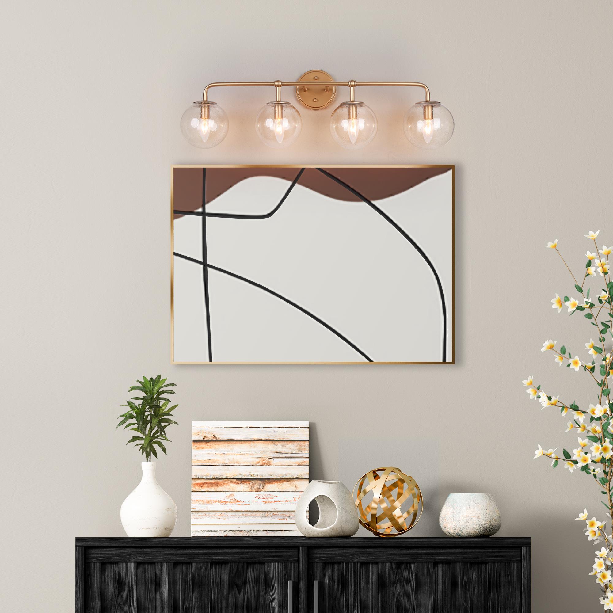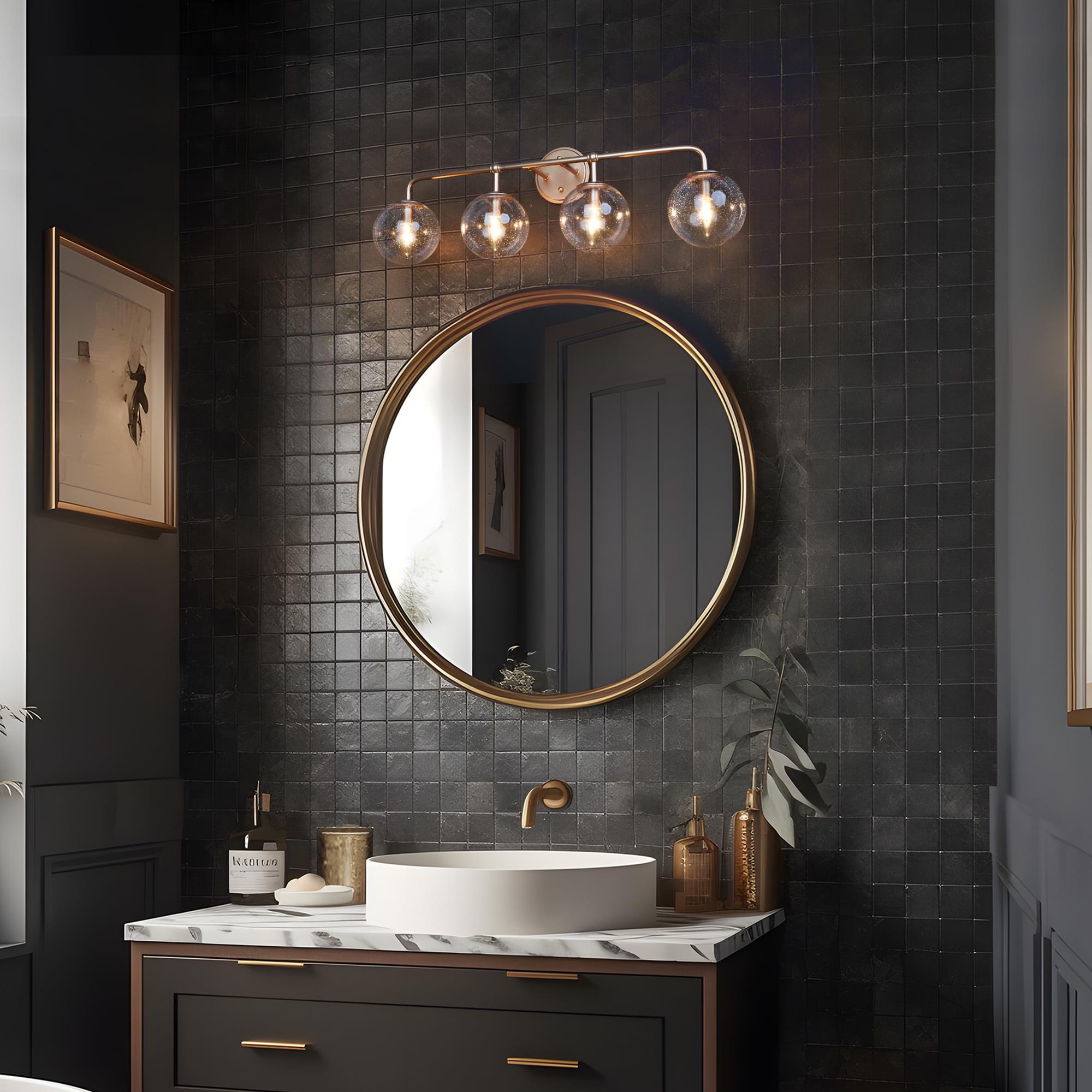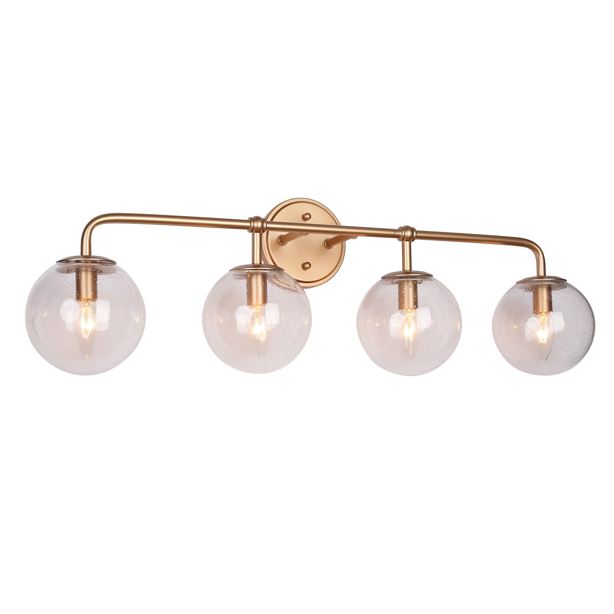 Incorporate urban modern style into your living space with this uniquely elegant Matte Gold with Clear Seeded Globe Glass Wall Sconce Bathroom Vanity Light by Uofin Lighting, safely rated for damp locations. This vintage vanity light features clear seeded glass shades that serve the purpose of subtly diffusing the lamping while allowing the exposed bulb to be a central design element. This classic mid-century gold wall sconce has a traditional design with a brass finish and four clear globe glass shades that let the light shine through to illuminate your space. The Uolfin globe collection vanity light can adjust the direction of the light up and down to fit different renovation plans. Whether you are searching for an event or retail lighting for a business space, or want to refresh your home’s hallway, bathroom vanity, powder room, bedroom, or living room, this transitional light fixture will help you distinguish your style.