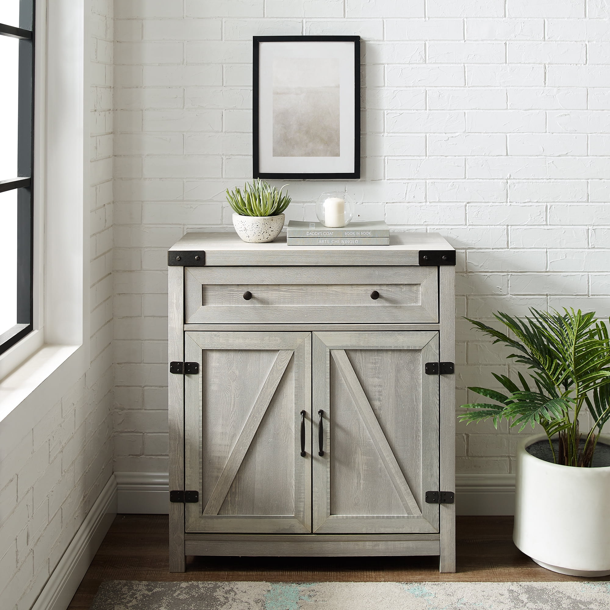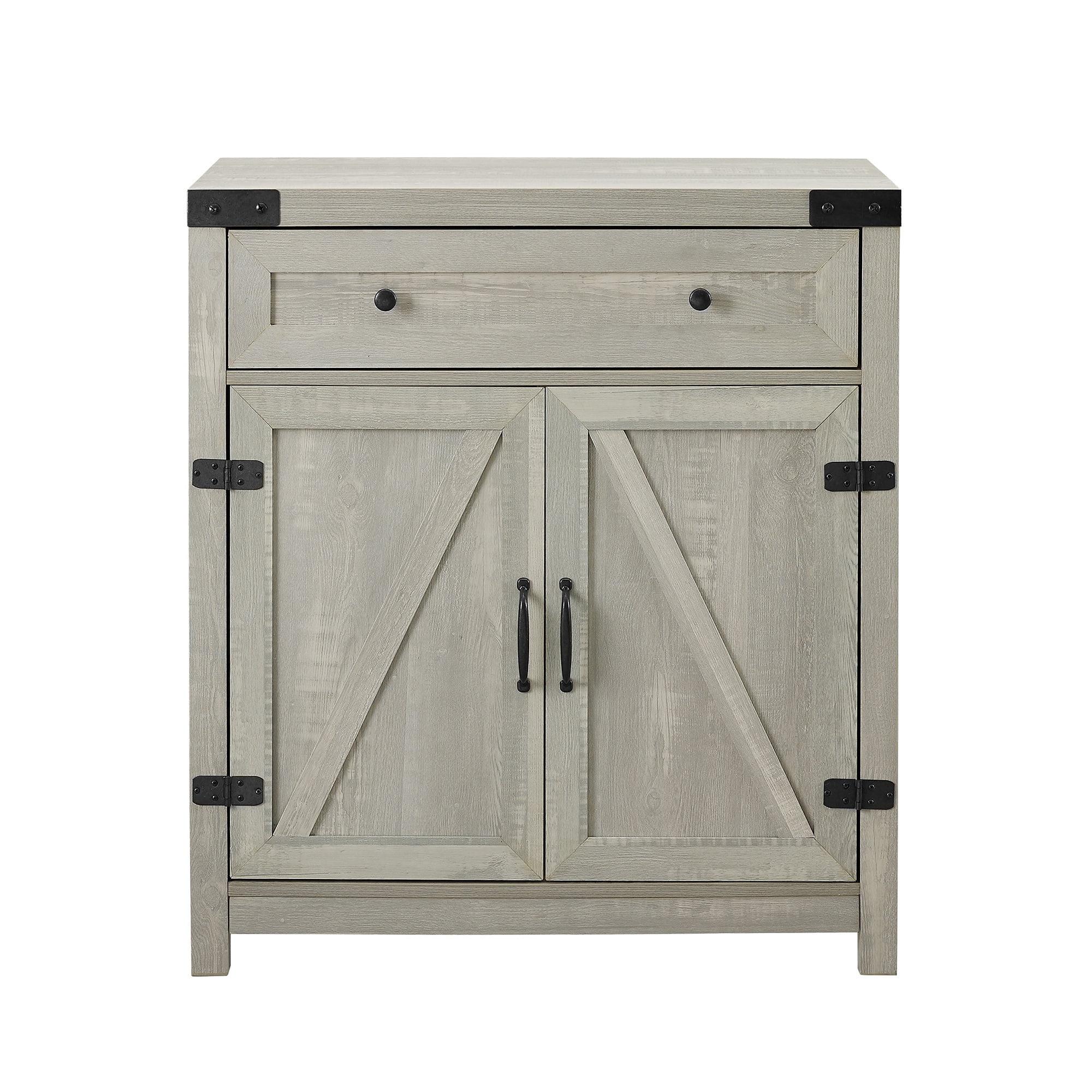 Bring the countryside to your home with this 30 inch farmhouse barn door accent cabinet. Picture your entryway transforming into a darling cottage entrance or a rustic ranch. Complement the accent cabinet with a mirror, a painting, or some greenery on top of it. Go for a wild country scene, a calm chateau glow, or a fancy farmhouse soiree. Use the cabinet’s drawer for easy access storage such as car keys, notebooks, or phone charges. And with adjustable shelves, this cabinet can be arranged to fit all your storage needs. Place it wherever you want a sprinkle of pastoral pleasantry, whether it’s in your living room, bedroom, home office, or entryway. Features: Color: Stone Gray Photo-ready laminate finish warp-resistant MDF wood core 2 barndoor cabinets for farmhouse flair 1 drawer with telescoping metal drawer glides 2 adjustable interior shelves Exposed metal accent hinges Specifications: Cabinet Dimensions: 33″H x 30″L x 15.5″W Drawer Dimensions: 24.5″x 12.5″x 4″W