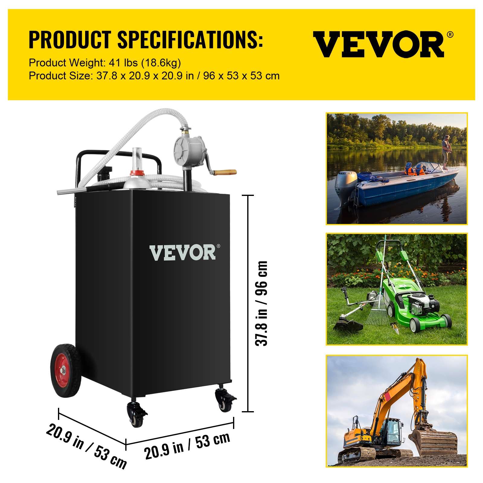 30 Gallon Fuel Caddy: Rotary Manuel Pump and Move It Around and Sturdy Construction; This large capacity 30-gallon fuel caddy is easily maneuverable, making it efficient and effortless to refuel during various applications, with less spilling and waste of fuel; It is a piece of ideal equipment for an auto repairs, farms, gardens, small engines, motorcycle/ATV, marine uses, and more; This quick and clean fuel caddy is handy to have around; Our caddy will always be by your side, no matter the conditions; High Volume 30 Gallon Fuel Caddy; Two Way Rotary Pump; Moveable and Easy to Use; Speedy and Convenient Fuel Filling; Highly Robust Steel Tank; [Package Content] 1 x Fuel Caddy