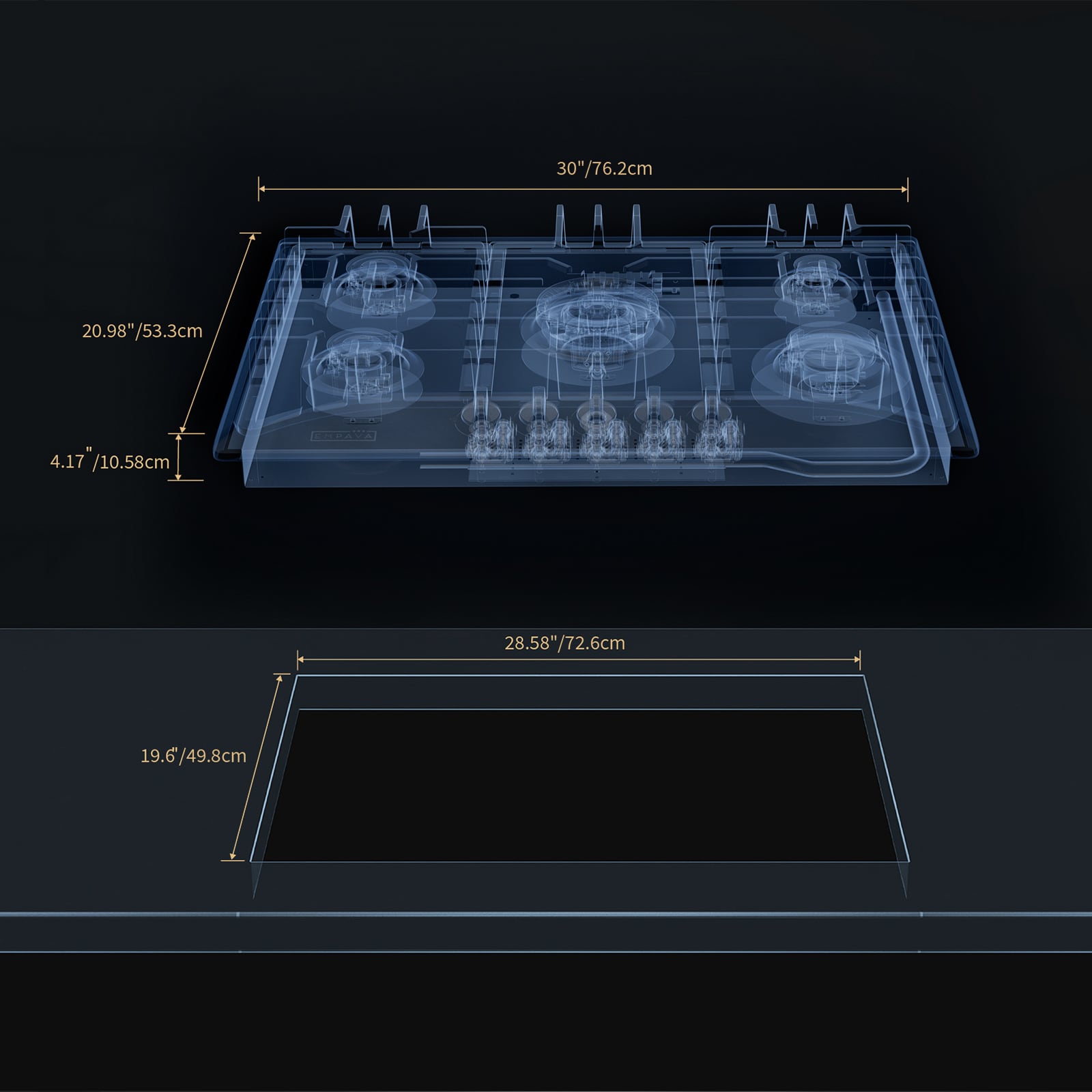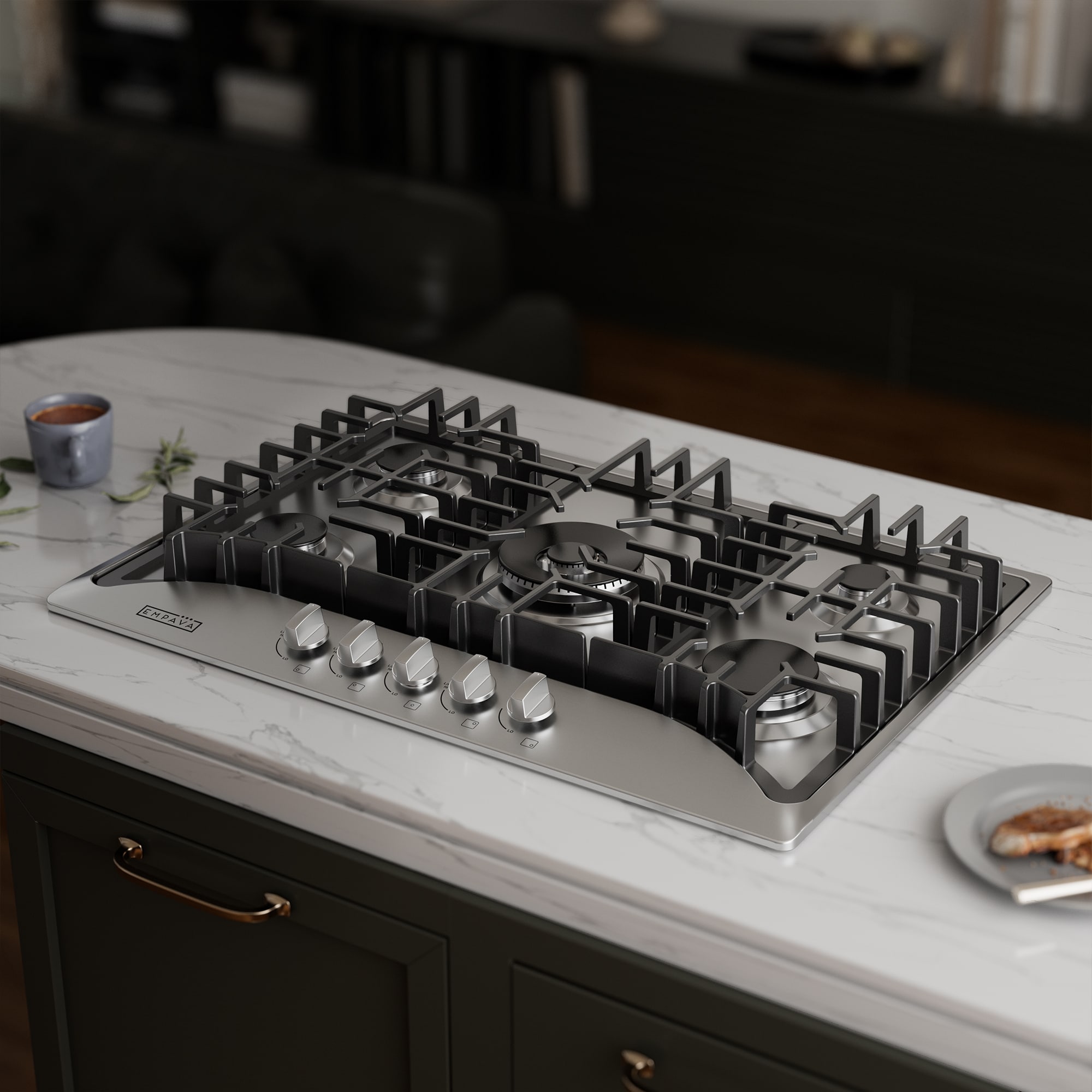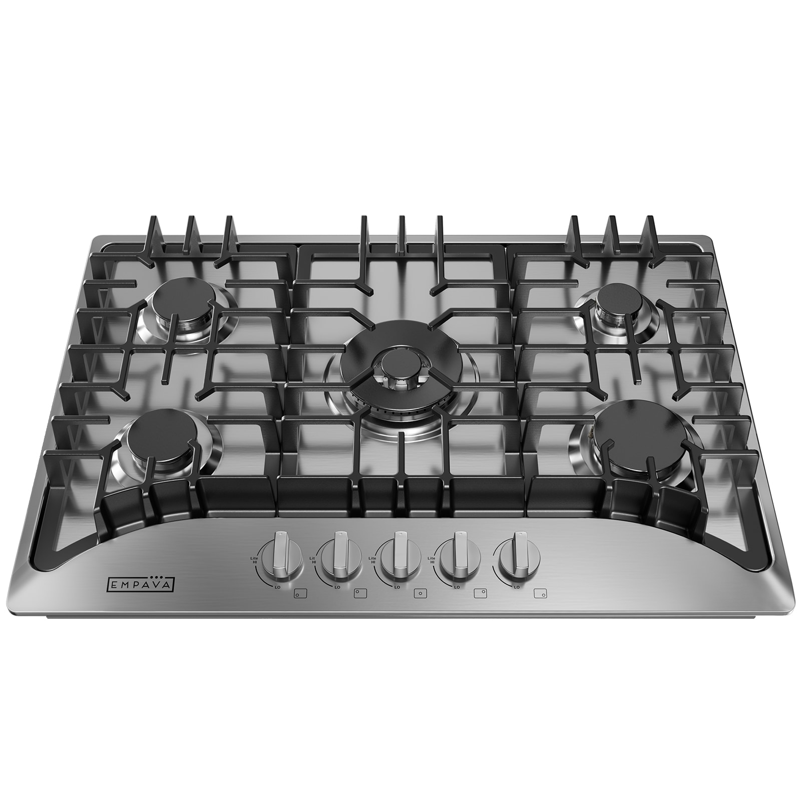 The Empava 30-inch gas cooktops with the CSA certified is a perfect combination of style and practicality. Constructed with 18-gauge stainless steel for exceptional resistance to corrosion and rust. Handcrafted brushed satin finish to prevent dents and scratches for long lasting use in your busy kitchen. The gas cooktops feature commercial-grade components (1x 12000-BTU burner, 1x 10200-BTU burner, 2x 6000-BTU burners and 1x 3400-BTU burner), the power burner designed to reach maximum temperatures quickly as well as a simmer burner for more delicate, controlled heat. The metal constructed knobs and the heavy-duty cast iron grates can be cleaned in the dishwasher. During the past years, 30-inch gas cooktops by Empava appliances have been a very popular choice for kitchen upgrades and new builds, allowing you to cook restaurant quality meals from the comfort of your own home.
