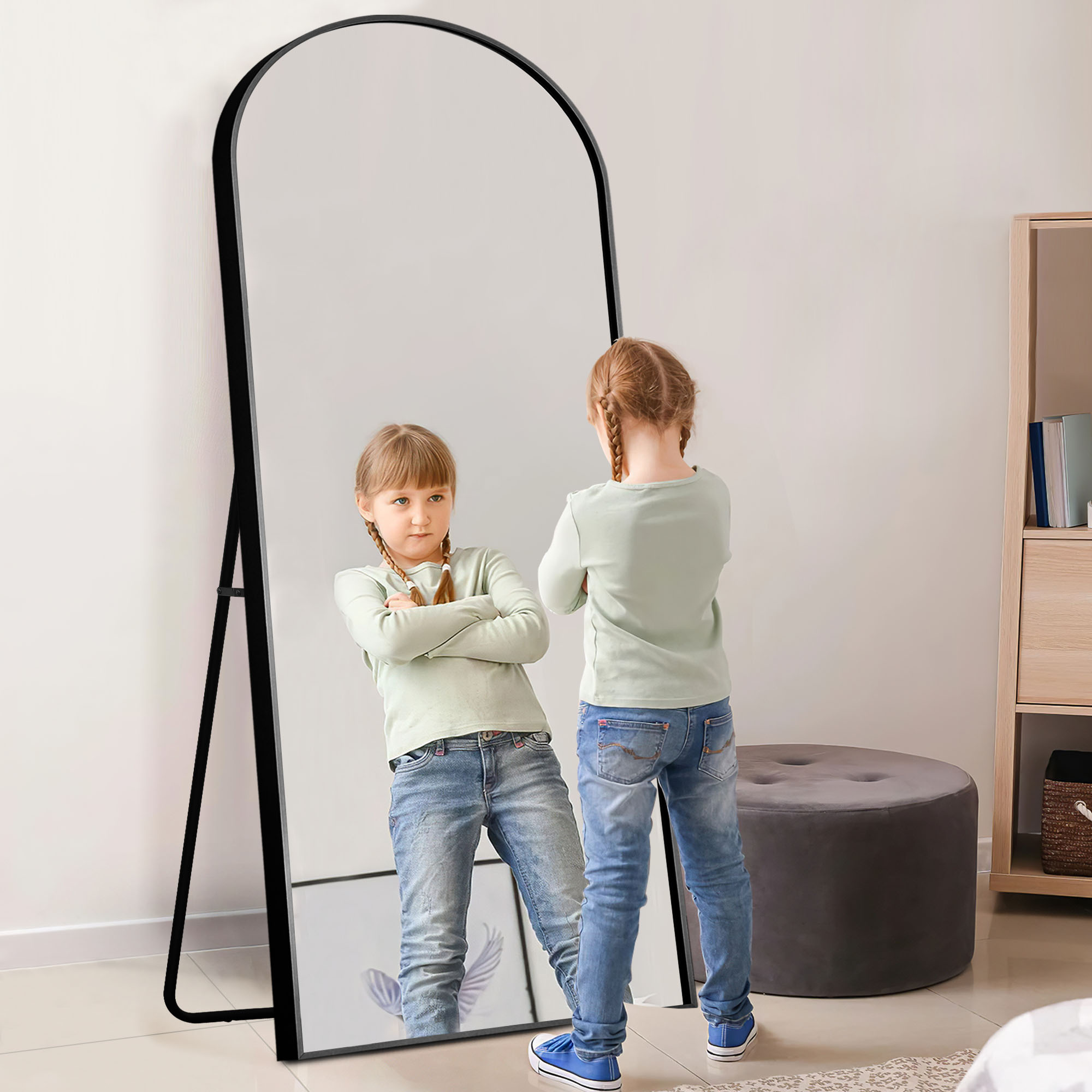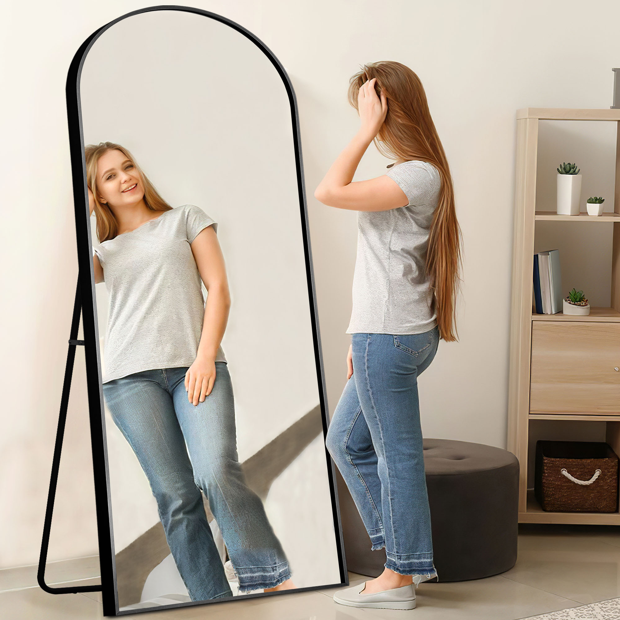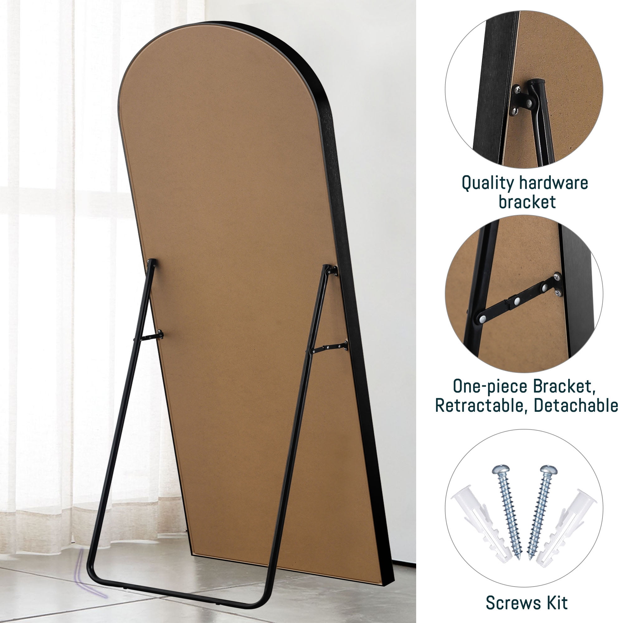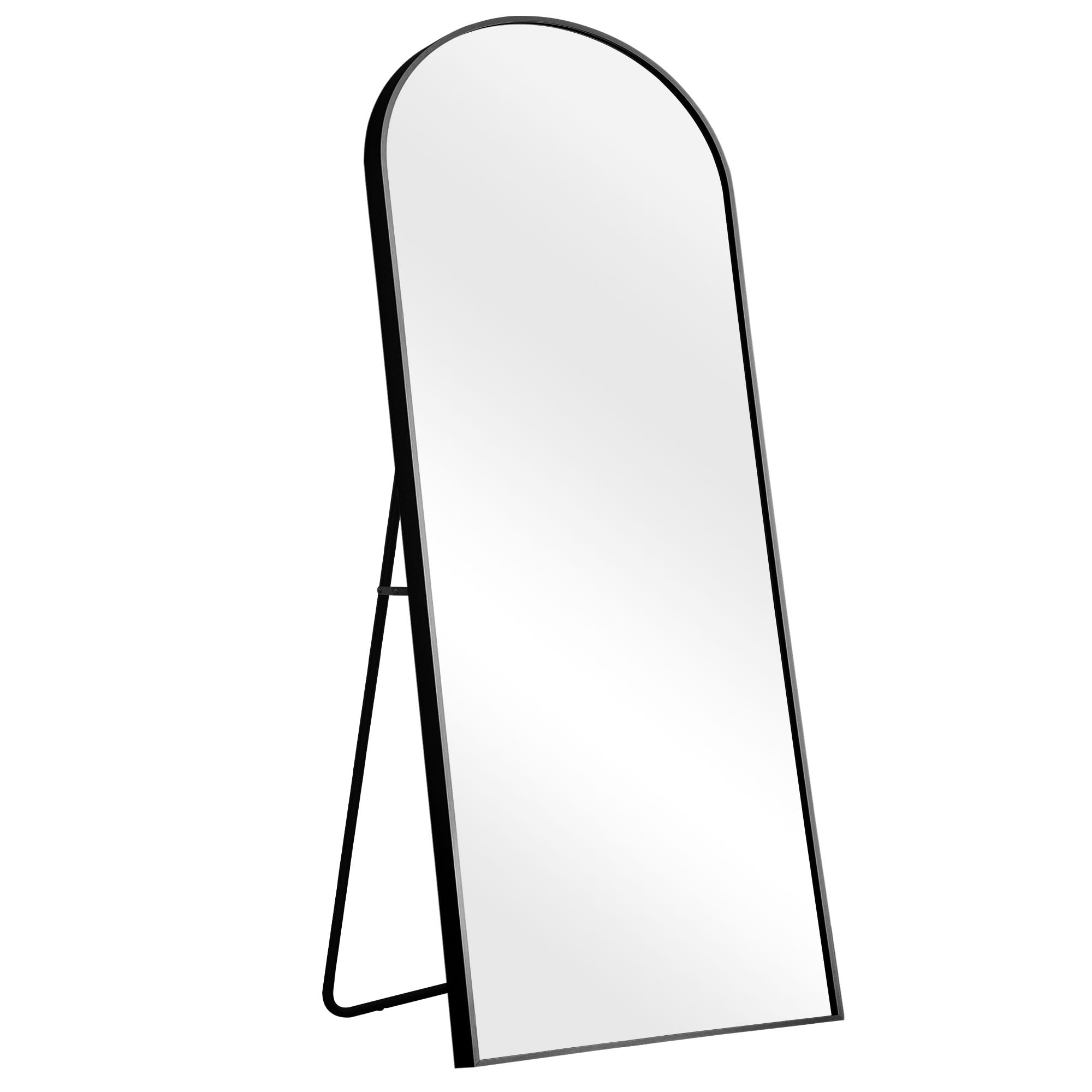 Arched Design: The top of the full body mirror uses an arched top frame design. Aluminum alloy frame, the entire glass mirror is not surrounded by the frame, it is independent of the frame, making the entire mirror look very unique and upscale. Full Size: 70″x30″ Large full length dressing mirror enough for you to see your full body. Expand the visual space of the room. Shatterproof Glass & Aluminum Alloy Frame: Shatterproof Glass & Wood Frame: The door mirror use scatter-proof and shatter-proof glass, safer, more reassuring. The frame is made of aluminum alloy, and the corners of the frame are fixed by solid metal screws. When the H-shaped bracket is opened, triangular support will be formed between the bracket and the mirror, which is very stable Multifunction: The dressing mirror can leaned to the wall or standing anywhere with the stand, greatly saving your space, easy to operate, no need to worry about taking too much time and effort, The hook on the back is suitable for almost all places indoors or outdoors Satisfaction Shopping: We are confident in the quality of our products and packaging. Just reach to us with any questions or concerns and we will be happy to help in less than 24 hours