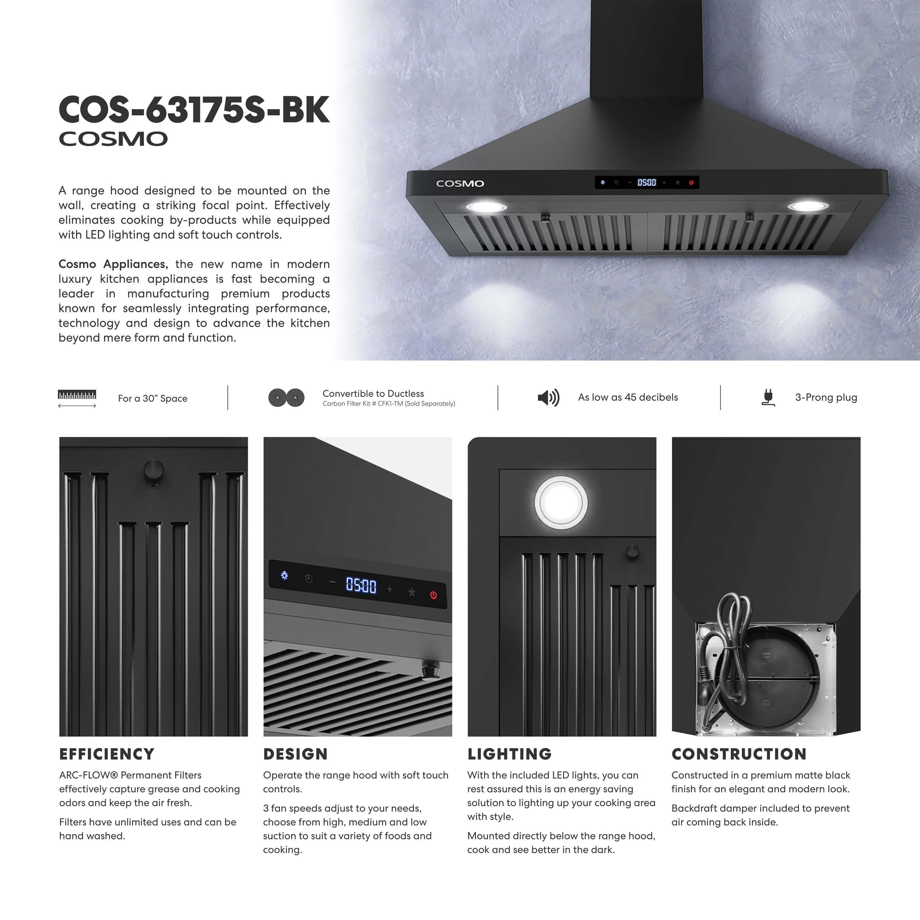 Upgrade your kitchen with Cosmo’s COS-63175S-BK modern canopy wall mount range hood. Our contemporary styling will feel right at home with modern kitchen decor. Experience the quality of matte black construction, built to withstand high heat, grease, oil and steam. Our range hood includes a seamless three sided chimney for clean, elegant lines. The motor provides 380 CFM of air flow, and our Cosmo ARC-FLOW permanent filters are easy to clean. This range hood is quiet and energy efficient, utilizing high lumen LED lighting for cost savings. The 3 prong, 120V power cord is included for easy use. Trust Cosmo for your next appliance for premium quality at factory direct prices. Part of the Vista Collection, bringing enhanced functionality and design, offering a well-rounded option for those looking for more convenience and style in an appliance.