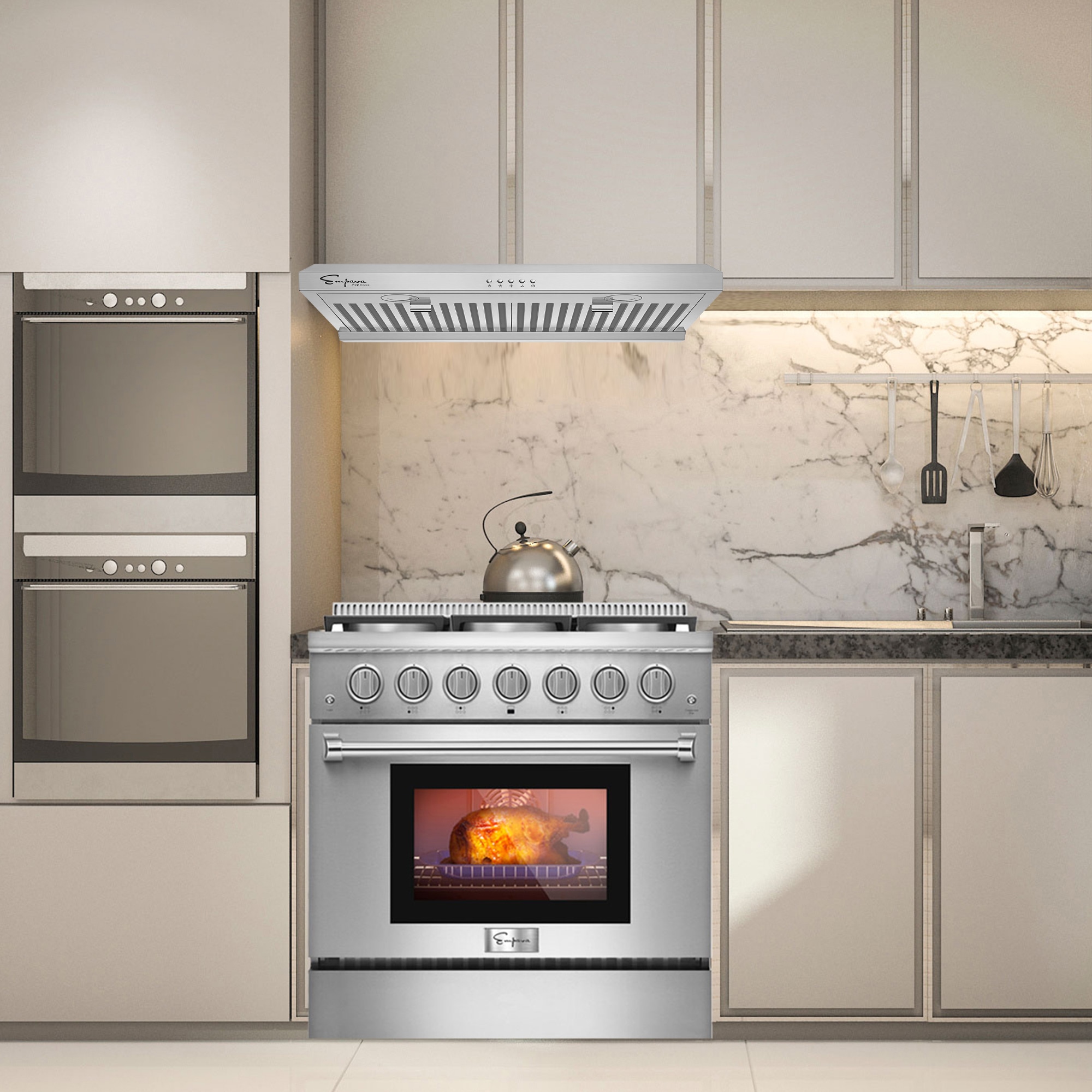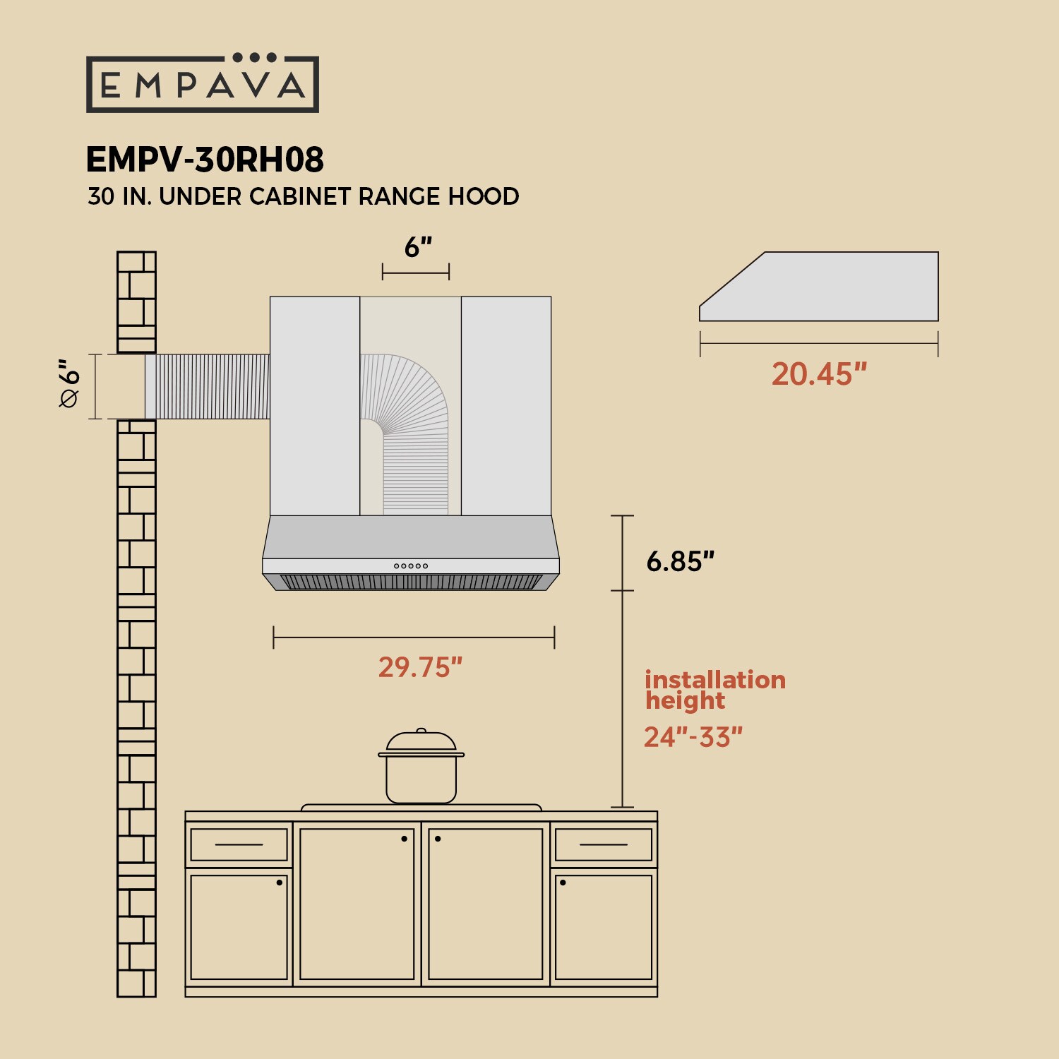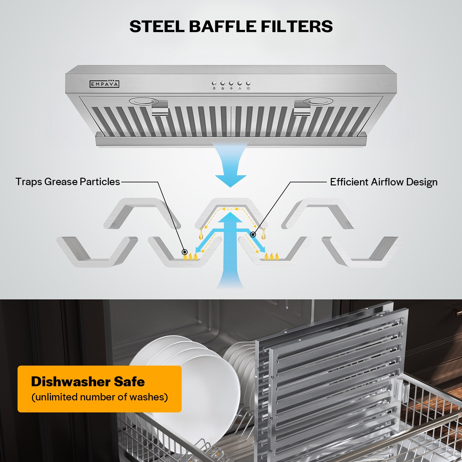 The 30-in 400 CFM ducted under cabinet range hood with the USA and Canada certified is a perfect combination of style and practicality. The slim and light vent hood will transform your kitchen into a modern, tidy, and cozy space. The ultra-quiet dual sealed motor do an incredible job at quickly remove smoke and other cooking odors from the air. Come with a gently rounded corners design, creates a focal point with a distinctive modern look. Removable, reusable, dishwasher-safe stainless-steel filter for easy cleaning and maintenance. Two bright LEDs shine light on your stove top for better cooking visibility. During the past years, Empava range hoods have been a very popular choice for kitchen upgrades and new builds.