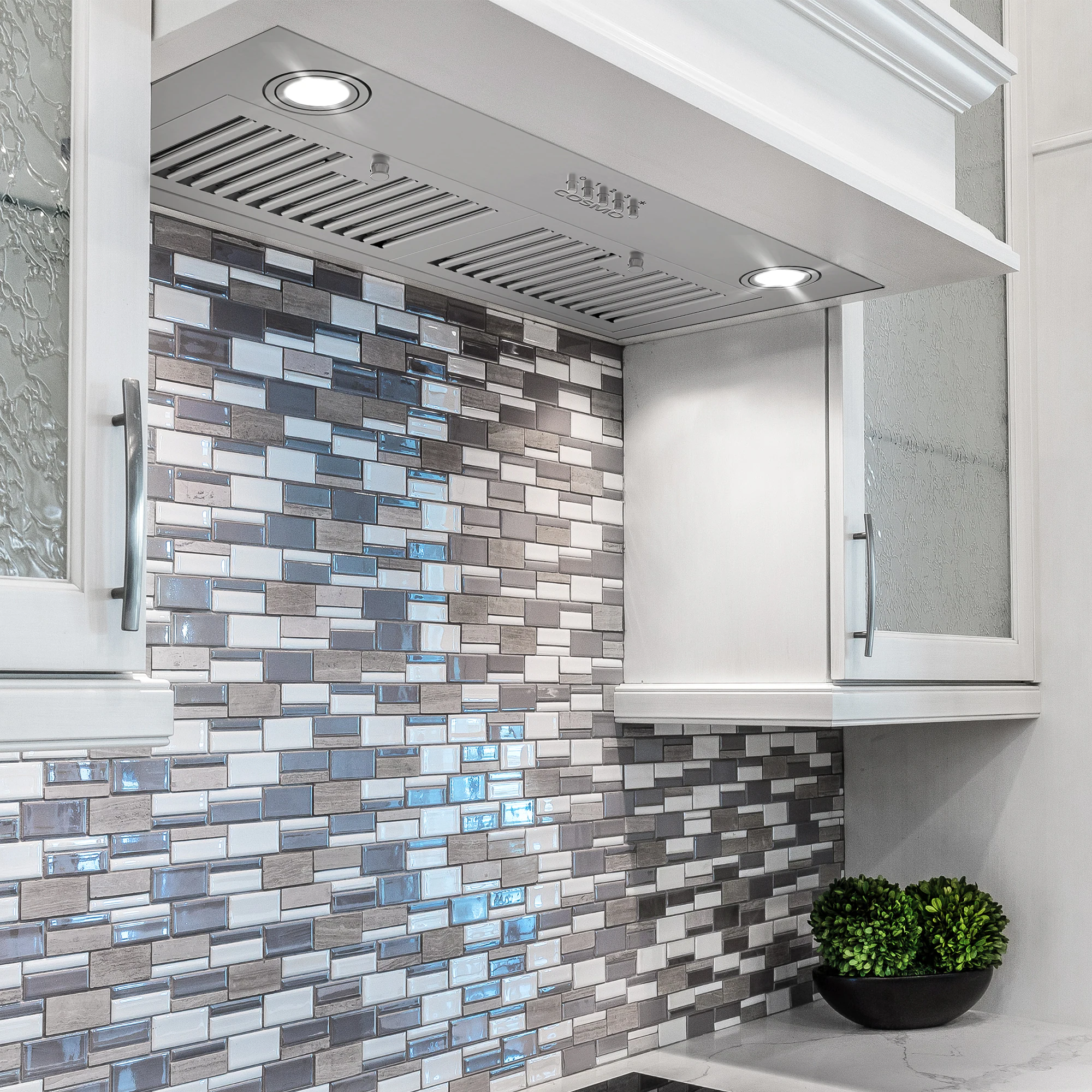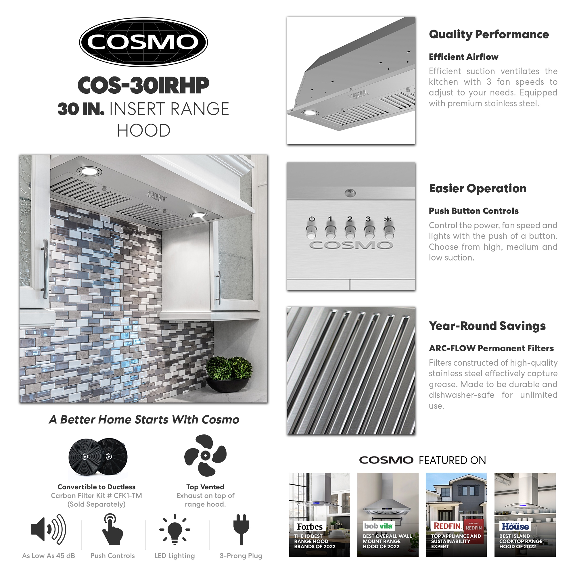Upgrade your kitchen with Cosmo’s COS-30IRHP-DL insert range hood for a modern and seamless design. Fits easily into a custom cabinet enclosure with premium brushed stainless steel built to withstand high heat, grease, oil and steam. Trap grease and cooking odors with 3 fan speeds and illuminate your kitchen with the built-in energy efficient LED lights for easier visibility. Clean-up is a breeze with easily removable, permanent, dishwasher-safe stainless steel filters. Save money year-round with unlimited uses on these filters. A 3-prong power cord is included for easy installation. A better home starts with Cosmo. Part of the Lumin Collection bringing enhanced functionality and design, offering a well-rounded option for those looking for more convenience and style in an appliance.