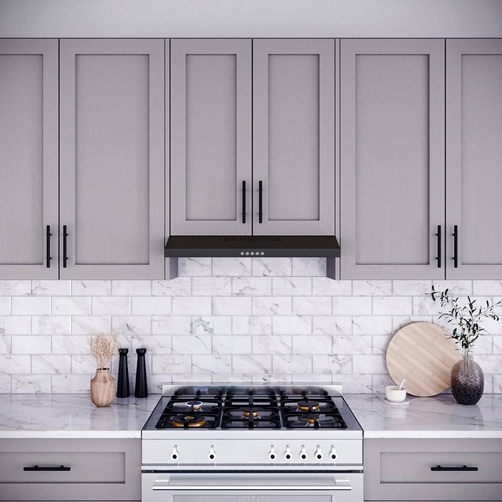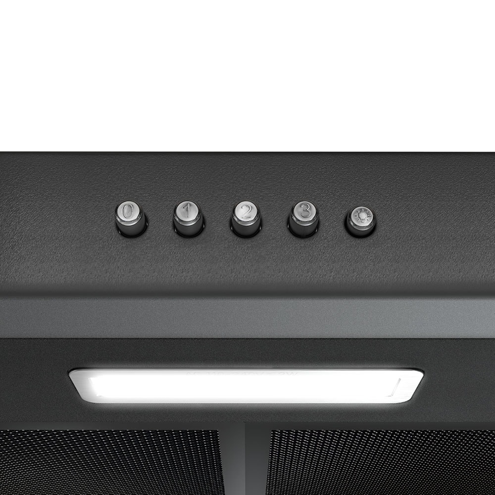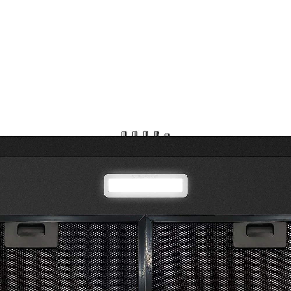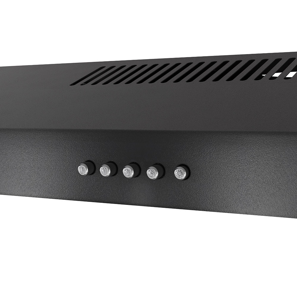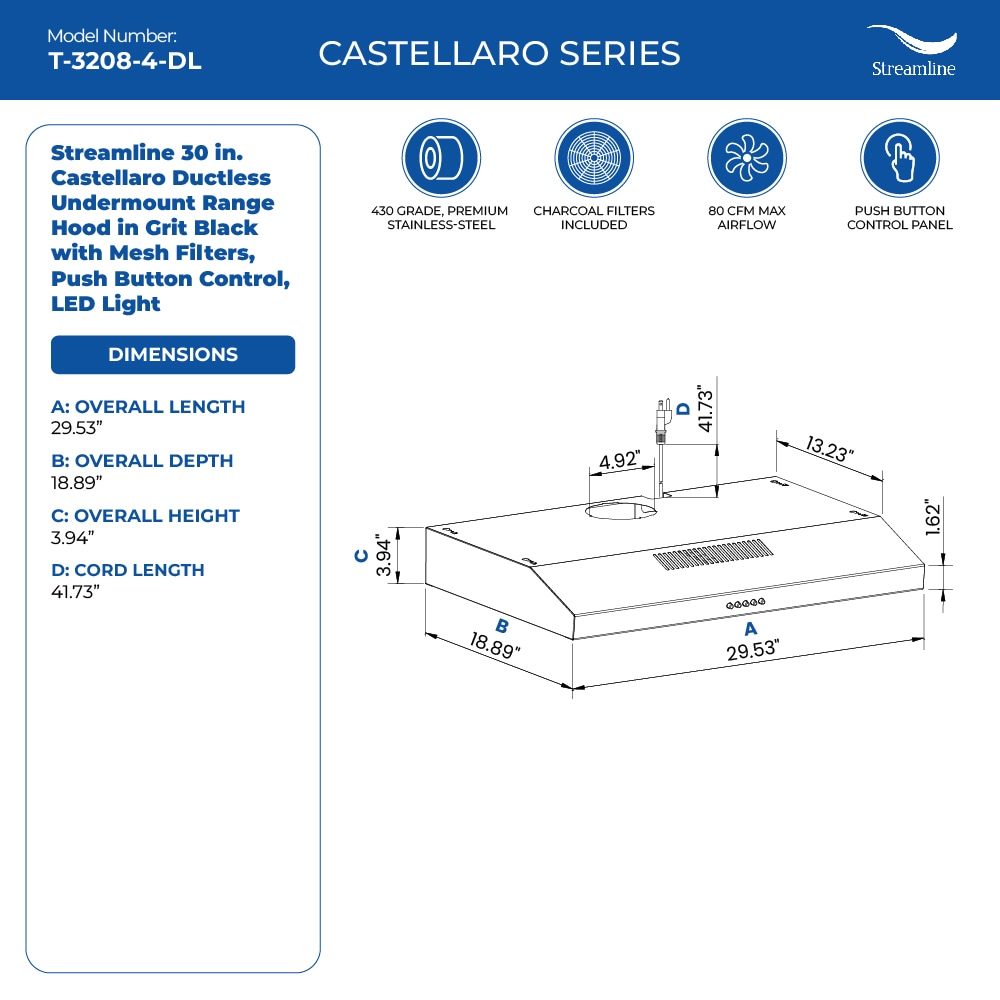 Elevate your culinary experience with our premium Streamline 36 in. Castellaro Ductless Undermount Range Hood in Grit Black. With a potent 80 CFM airflow, it provides a 3-speed push-button control for precise ventilation customized to your needs. Illuminate your cooking space with the integrated LED light, while the sturdy aluminum mesh filters efficiently capture grease and impurities. Thanks to the convenience of a 3-prong 120-volt power cord, installation is a seamless endeavor. This range hood combines sleek aesthetics with unmatched performance, embodying the essence of modern kitchen luxury.