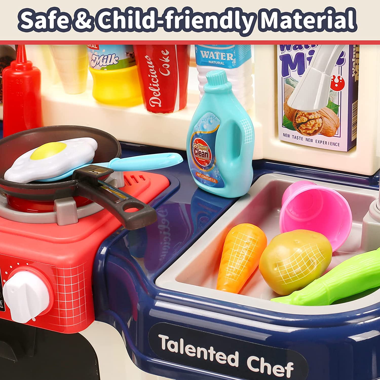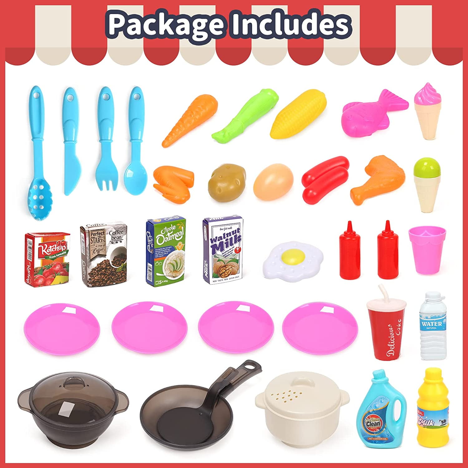[Toy Kitchen Set for Kids] With incredibly lifelike equipment and accessories, such as an electronic burner with steam, a play sink with running water, play food, several types of kitchen accessories, and different cooking tools, this kitchen playset provides an authentic cooking experience for your kids. For hours of pretend play enjoyment, kids can pretend to cook as though they are using actual appliances. [Kitchen Sink with Water Circulation System] Fun steam function is included on the pretend stove burner. There will be white vapour when your child cooks. A water circulation system is used by the water sink toy to conserve water. Kids can clean up after themselves and wash pretend food. A musical toy is also placed in the kitchen’s range hood toy. It can provide music, lights, and a sound. Role play is made more enjoyable by these simulation features. [Fun Kids Kitchen Toy for Educational Entertainment] Children may learn while having fun with this pretend kitchen set. Improve their practical, imaginative, linguistic, and social abilities while learning about cooking through fun role-playing games. Playing with the sink to increase environmental awareness. Children can tidy up and organize themselves after playing with the kitchen toys thanks to their storage space, which helps them form a habit of keeping things organized. [Easy to Assemble] Installation instructions are provided in the manual for this kitchen playset. Additionally, this page contains installation tutorial videos for your reference, so you won’t have to worry about any installation issues. [Ideal Gift Option for Age 3+] This play kitchen food set is an ideal addition to any play area. It makes a fantastic gift for birthdays, holidays, role-playing games, and special celebrations, offering endless fun and creativity for kids.
