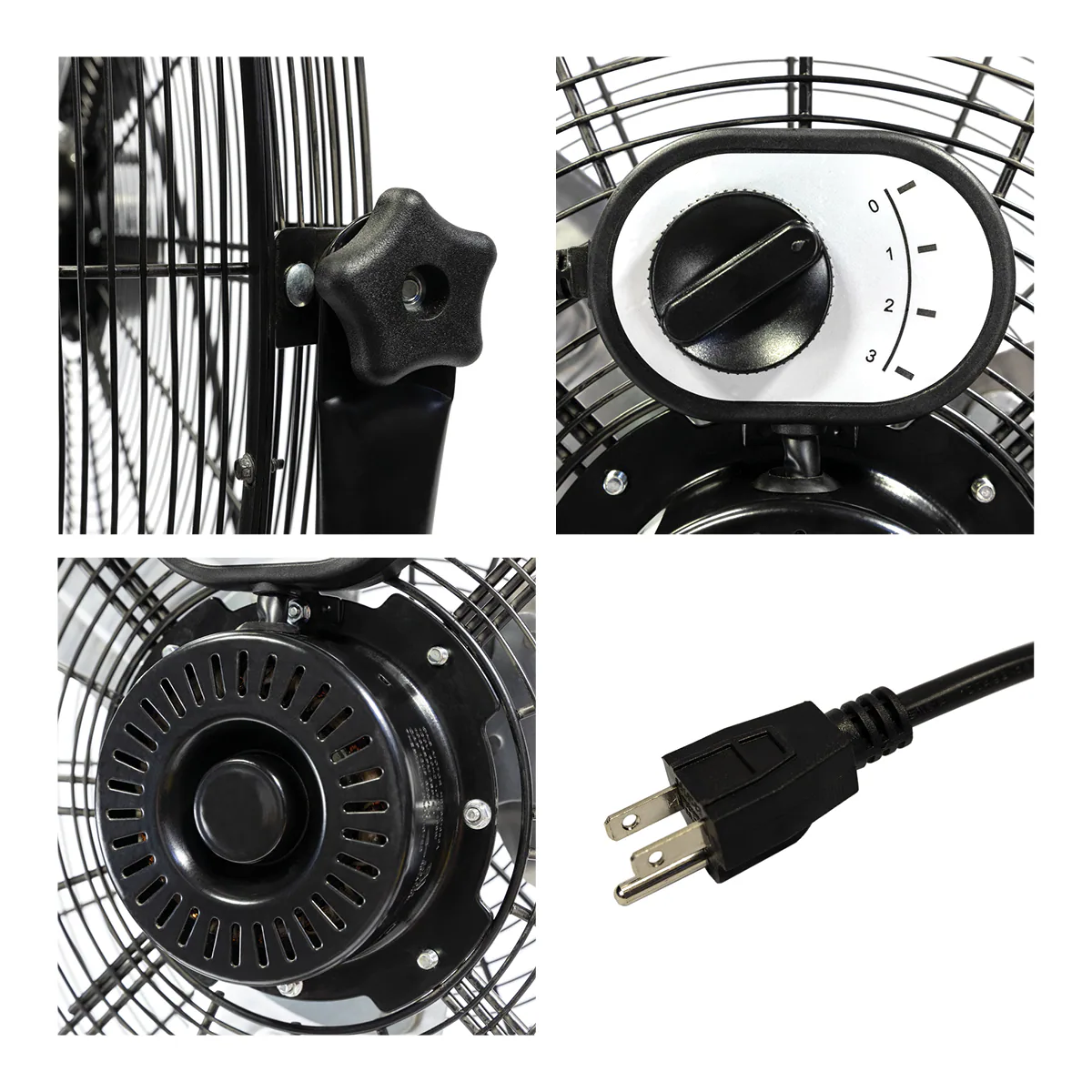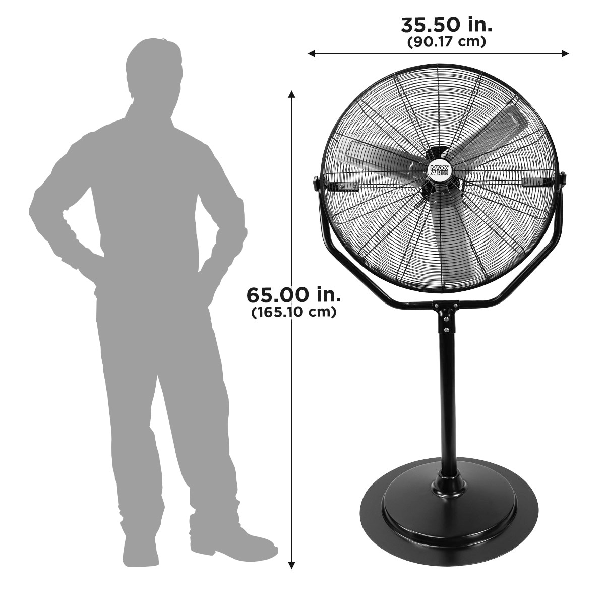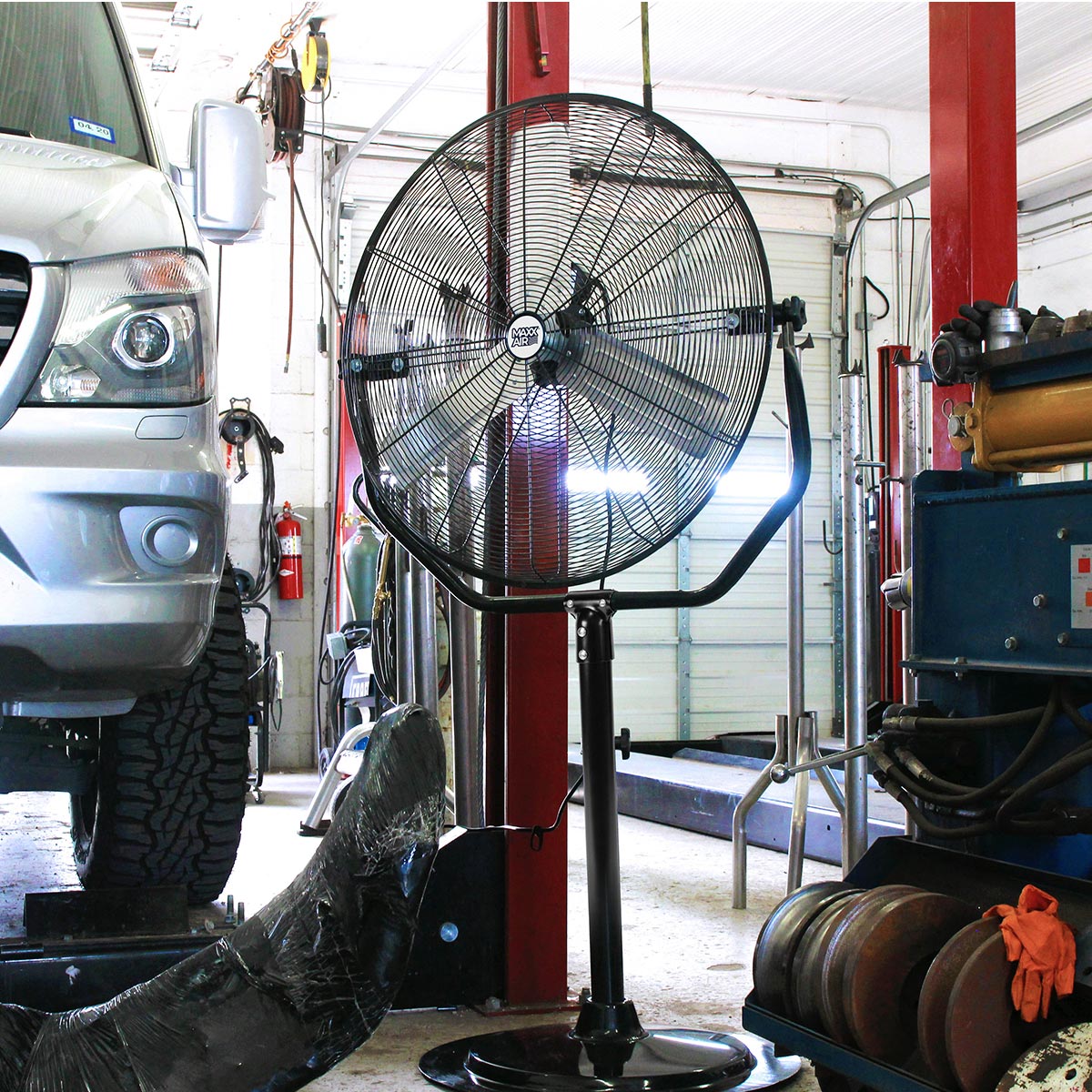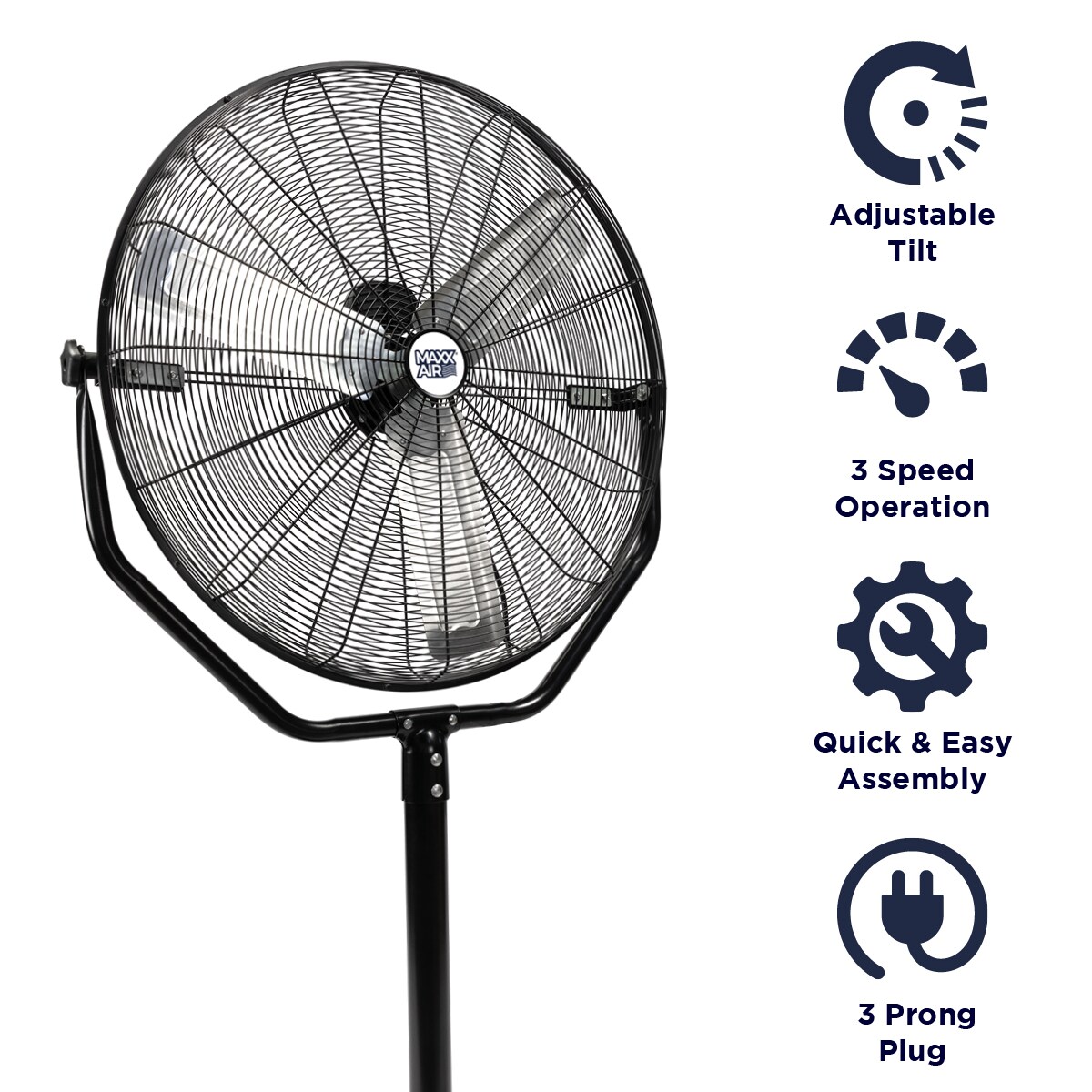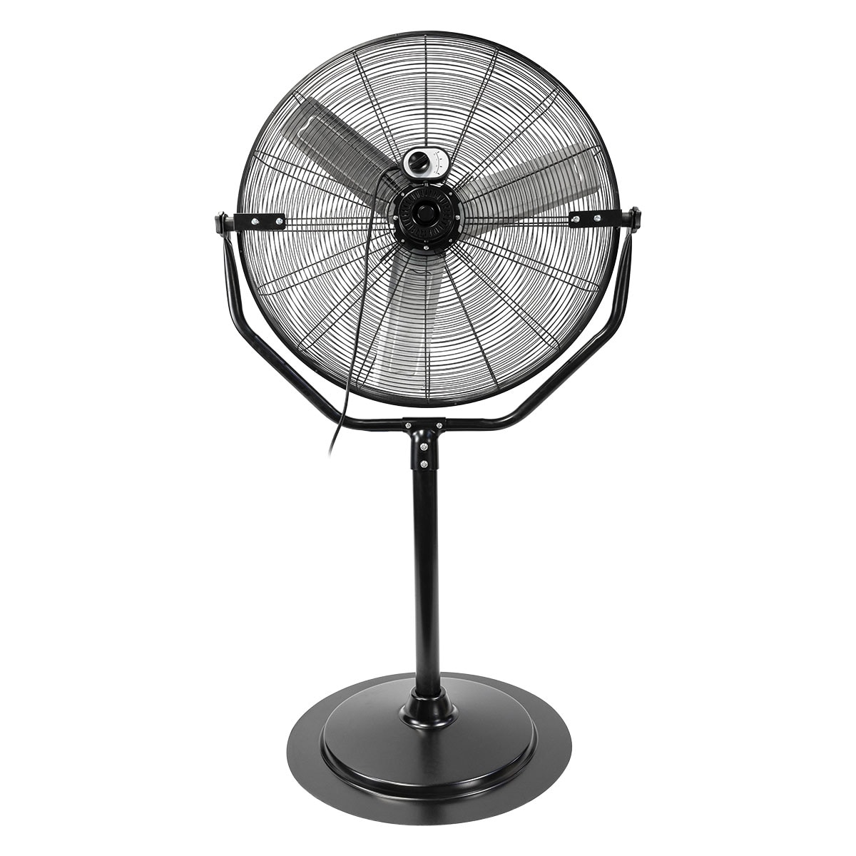 The 30 In. Yoke Stand Fan is a powerful commercial grade solution for cooling a garage, workshop, warehouse, gym, and other indoor commercial or industrial rooms. An all metal construction in a black satin powder-coated finish offers the greatest durability in heavy duty applications while requiring little maintenance. This shop fan requires minimal assembly with common household tools, and the fan head is pre-assembled to get you up, running, and cool in no time. Cycle between the speeds using the convenient rotary switch to experience all 3 adjustable comfort levels. This high velocity pedestal fan uses a unique yoke style design allowing it to easily pivot a full 360° and set tilt using tool-free adjustment knobs for user-friendly operation.