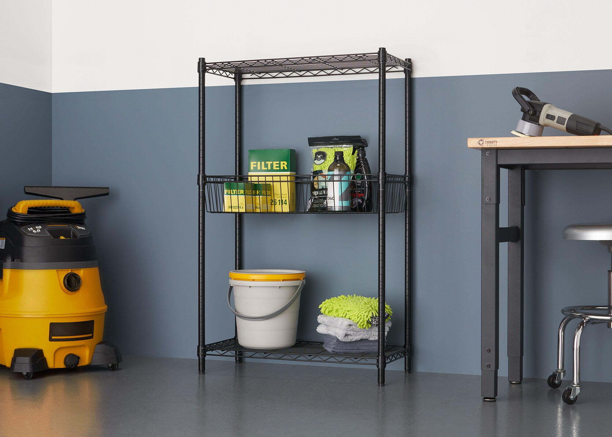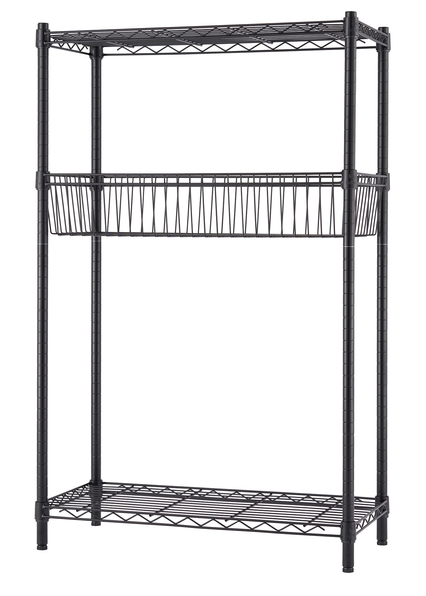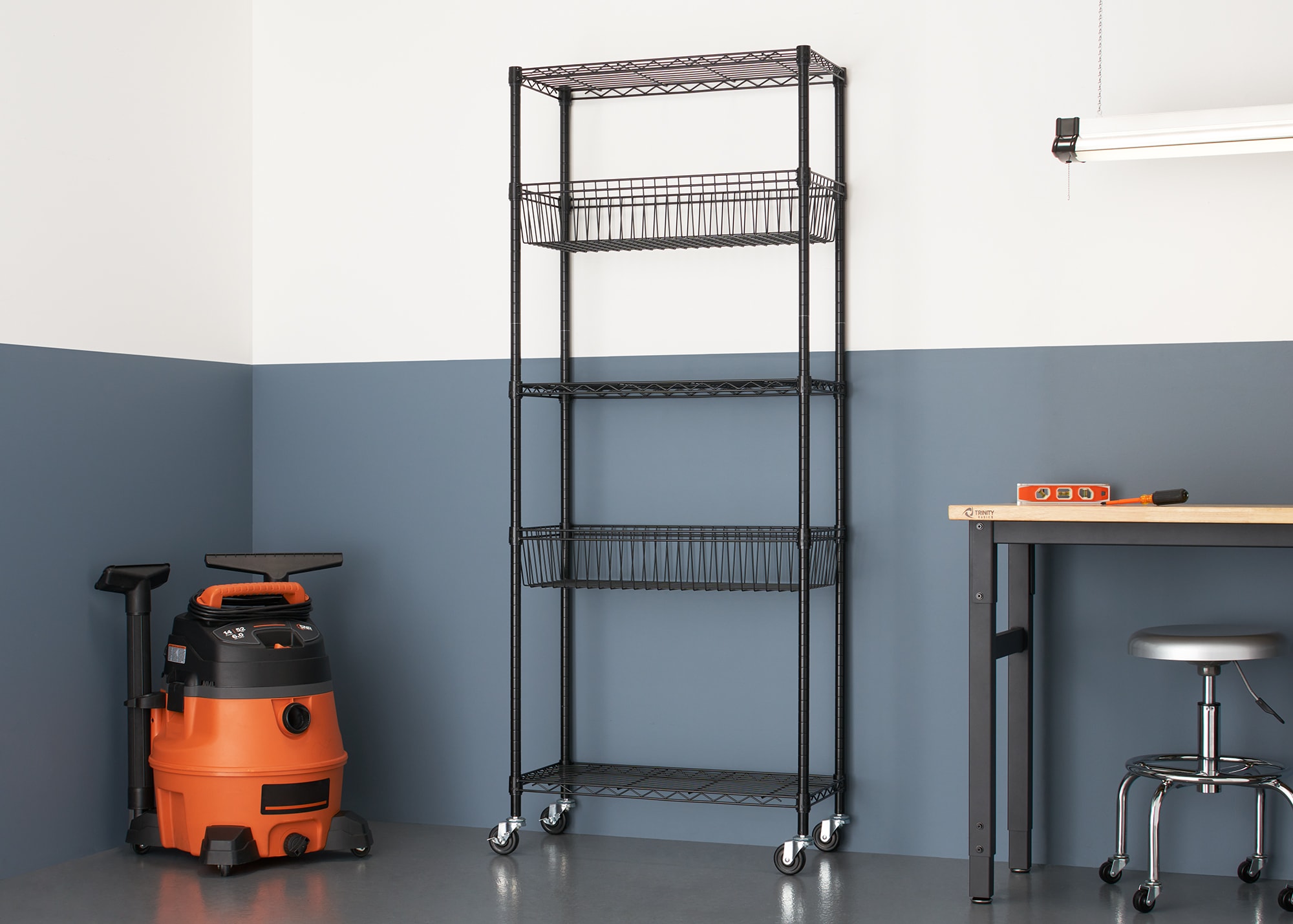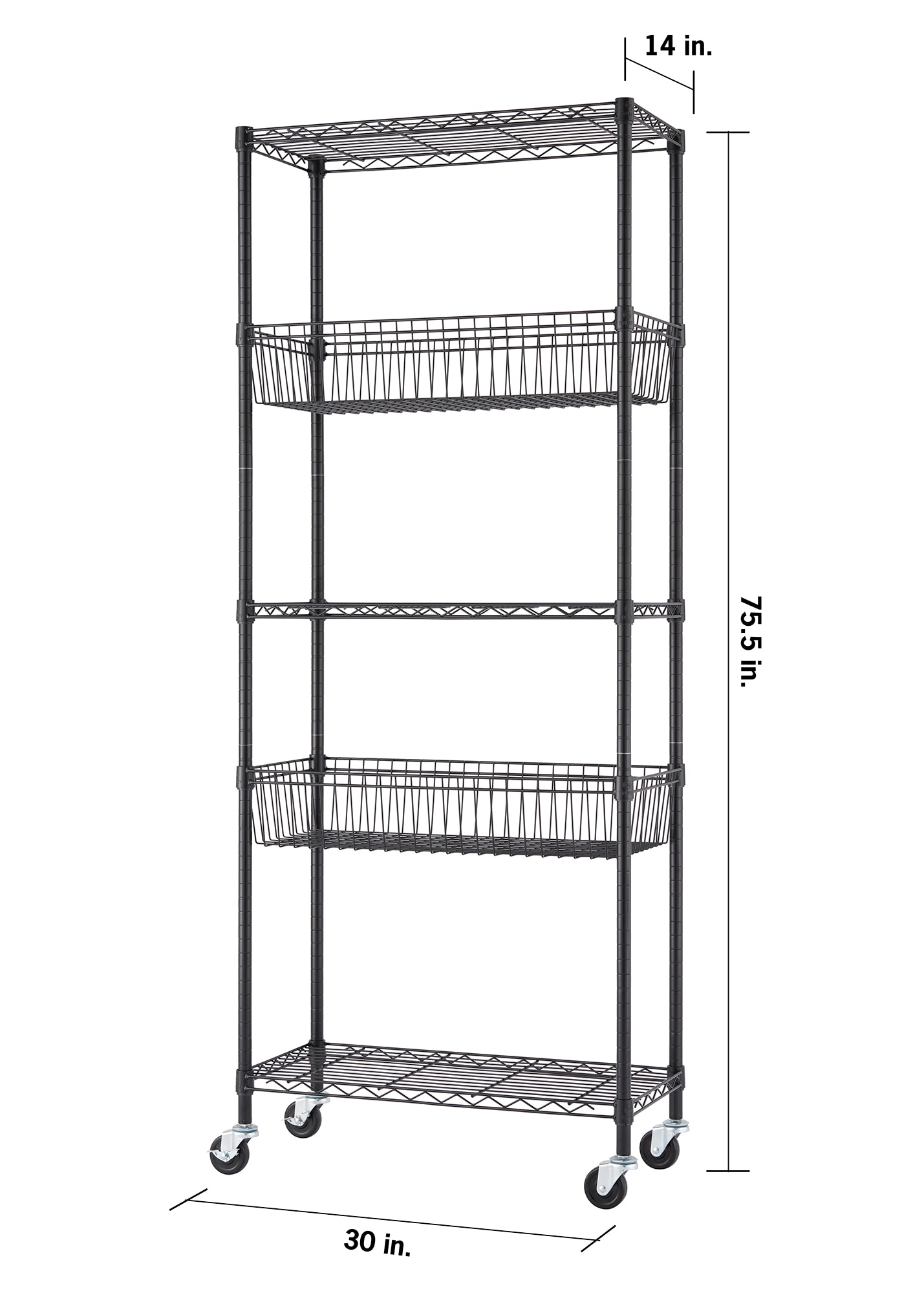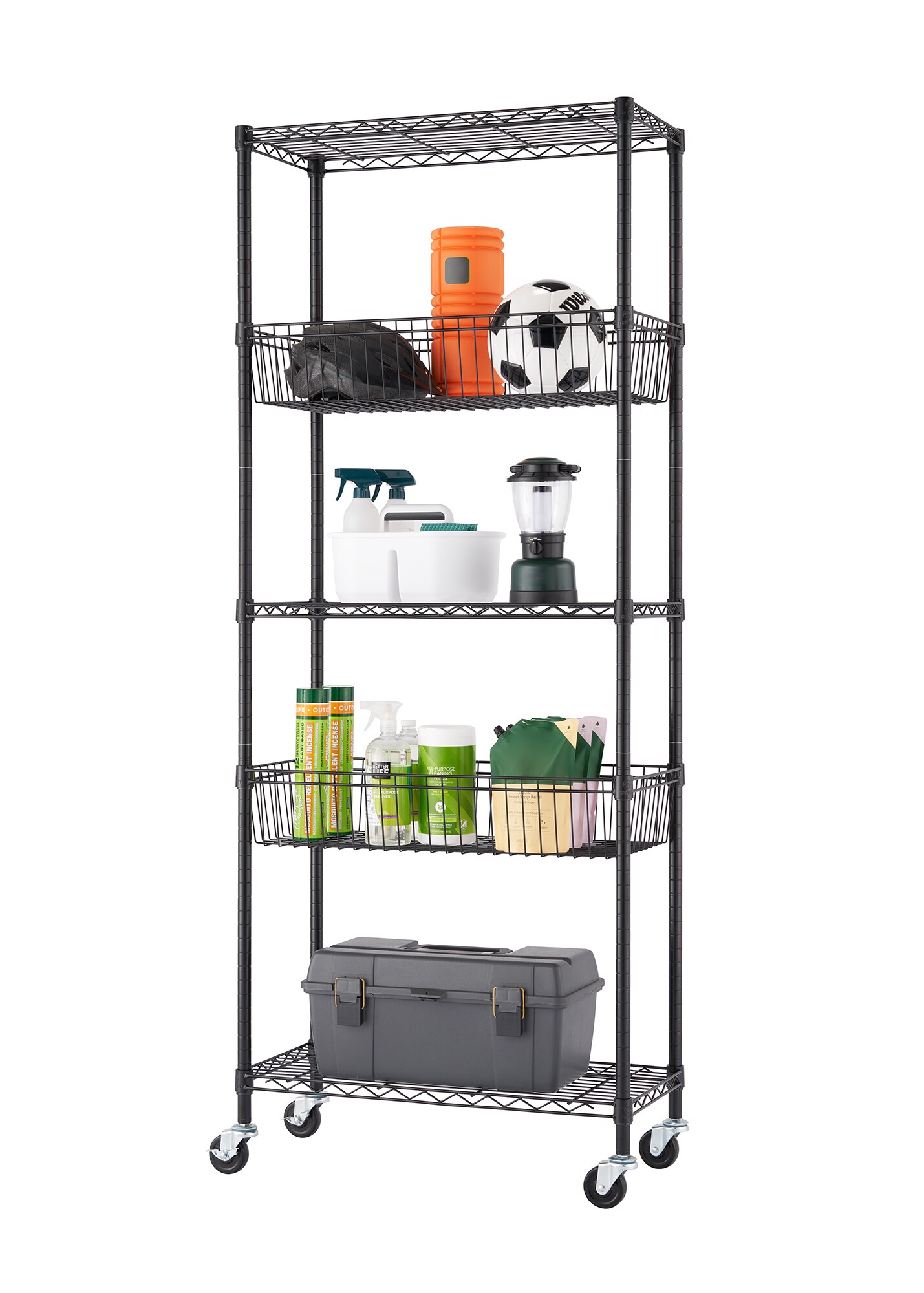 TRINITY’s 5-tier NSF wire shelving w/ baskets & wheels is ideal for any business, home, garage or kitchen needs. Its unique alternating shelf/basket design combines the best of aesthetically-pleasing form and ultra-useful function. Users can choose to build the product into a 5-tier rack or can break the unit into two — (1) 2-tier rack and (1) 3-tier rack. Includes hardware to assemble the rack as well as anti-tipping hardware.