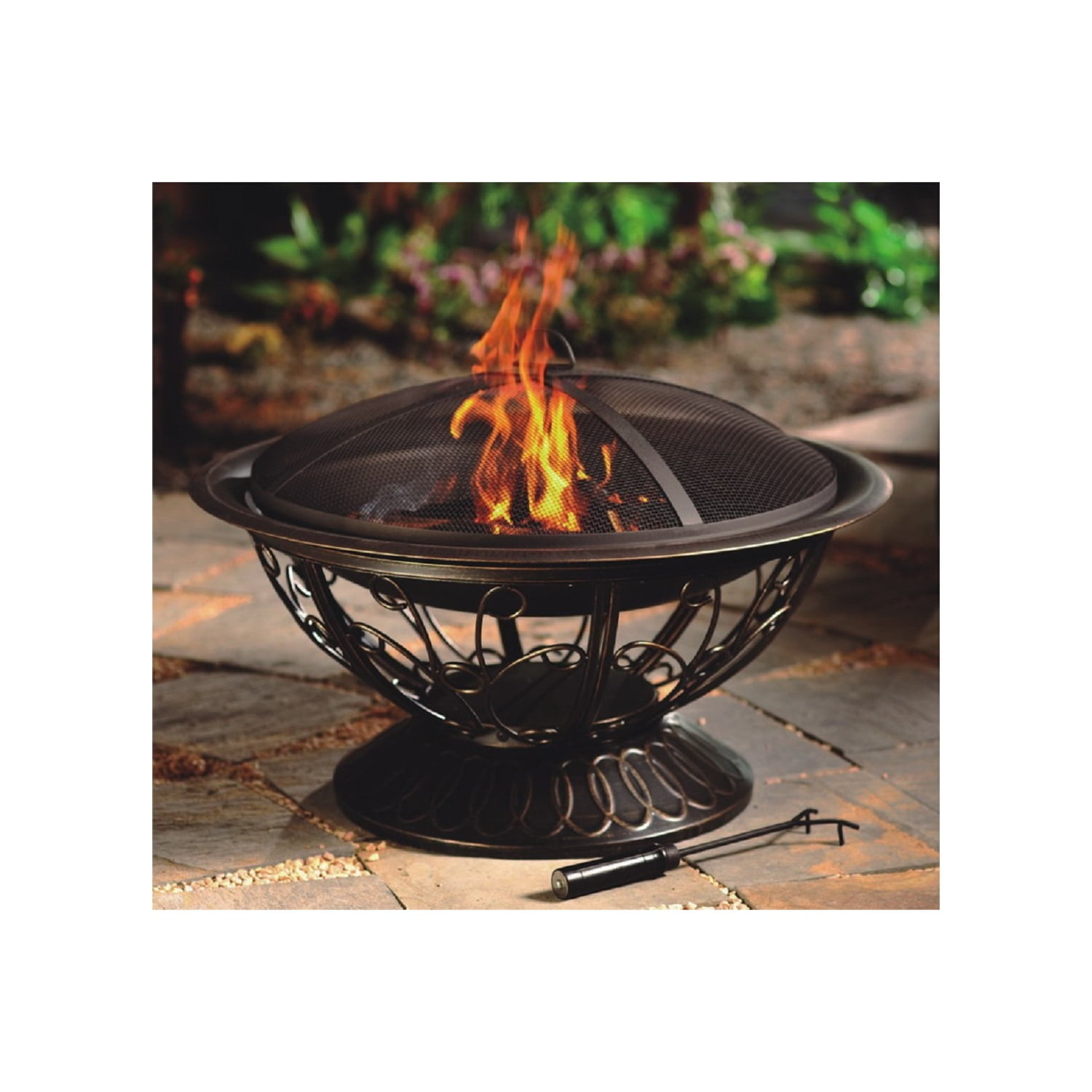 30″ Wood Burning Firepit with Scroll Design Mesh screen Wood grate Includes 18″ fire poker 30″ diameter, 18″ high Bowl dimensions: 5″ depth, 23″ width, 23″ length