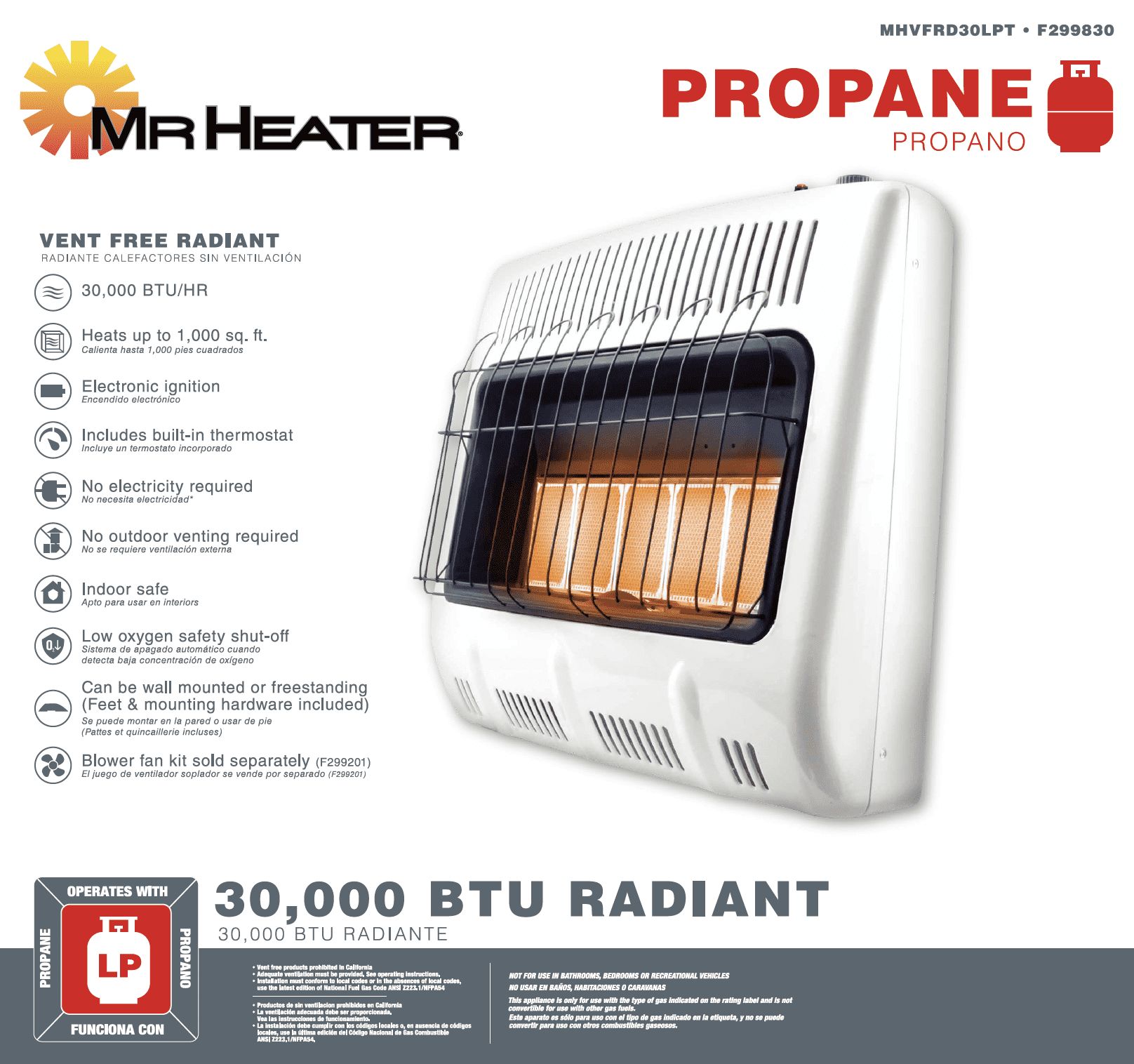 Emits 30,000 BTU/hrRadiant burner for direct infrared heat For use with propane gas 4500 ft high altitude restriction Battery operated electronic ignition (battery included) Includes built-in adjustable thermostat No electricity required No outdoor venting required Indoor safe Automatic low oxygen safety shut-off Can be wall mounted or freestanding (feet and mounting hardware included) Optional blower fan kit sold separately Not for use in bathrooms, bedrooms, or recreational vehicles Not for sale in California CSA Certified Heats up to 1,000 square feet