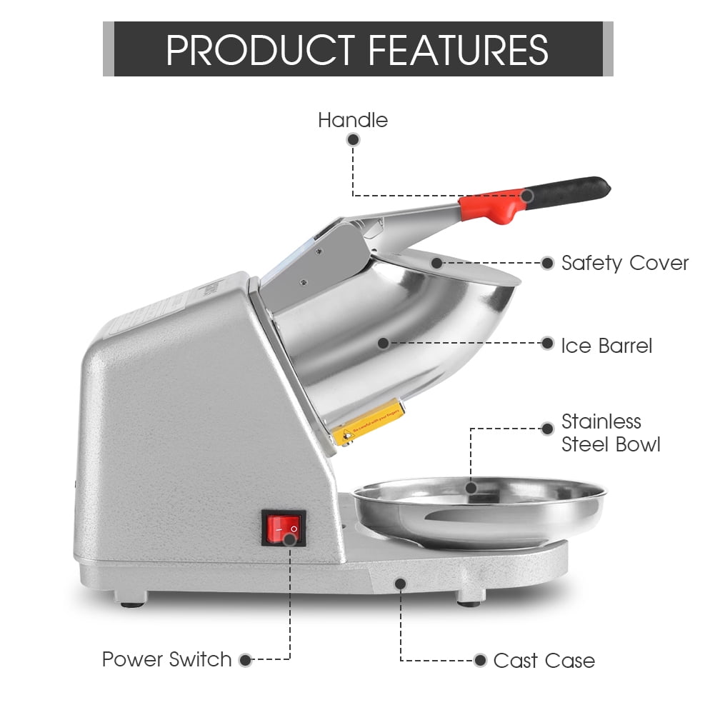 HIGH EFFICIENCY – Electric (plug-in) power does the work for you; Rapidly shaved ice (143 lbs. of ice per hour) to meet large demands easily; The powerful motor and sharp blade provide you soft, fluffy, and powdery snow ice; Higher crusher body and elbow give the machine better aesthetics while allowing more space for containers like goblets, cups, bowls, and so on HIGH-QUALITY MATERIALS – Built with food-grade corrosion-free stainless steel hopper and blade; Rust-proof and hygienic conditions guarantee food safety; Easy-clean mechanics design makes your life easier, saving you energy and time; The food-grade stainless-steel bowl is included for catching shaved ice; Note: please rotate the ice bowl during use COMFORTABLE USE – Heavy cast sturdy base offers stable and quiet workstation; Vibration and noise minimized to keep a relaxed atmosphere and comfortable experience; The ice pick in the package is convenient for you to break up ice and the wooden cover is easy to store when you do not use it DETAIL ORIENTED – Water resistant on/off switch for convenience and peace of mind; Blades stop rotating and the power shuts off automatically when the hopper handle is open to avoid injury; The roller on the outlet is helpful to prevent ice from splashing, giving you an enjoyable ice-making experience AESTHETIC DESIGN – The elegant and clean appearance makes this ice machine more attractive in your kitchen; Perfect for homes, fast-food stores, restaurants, cafes, bars, clubs, canteens, snack stands, festivals, fairs, etc