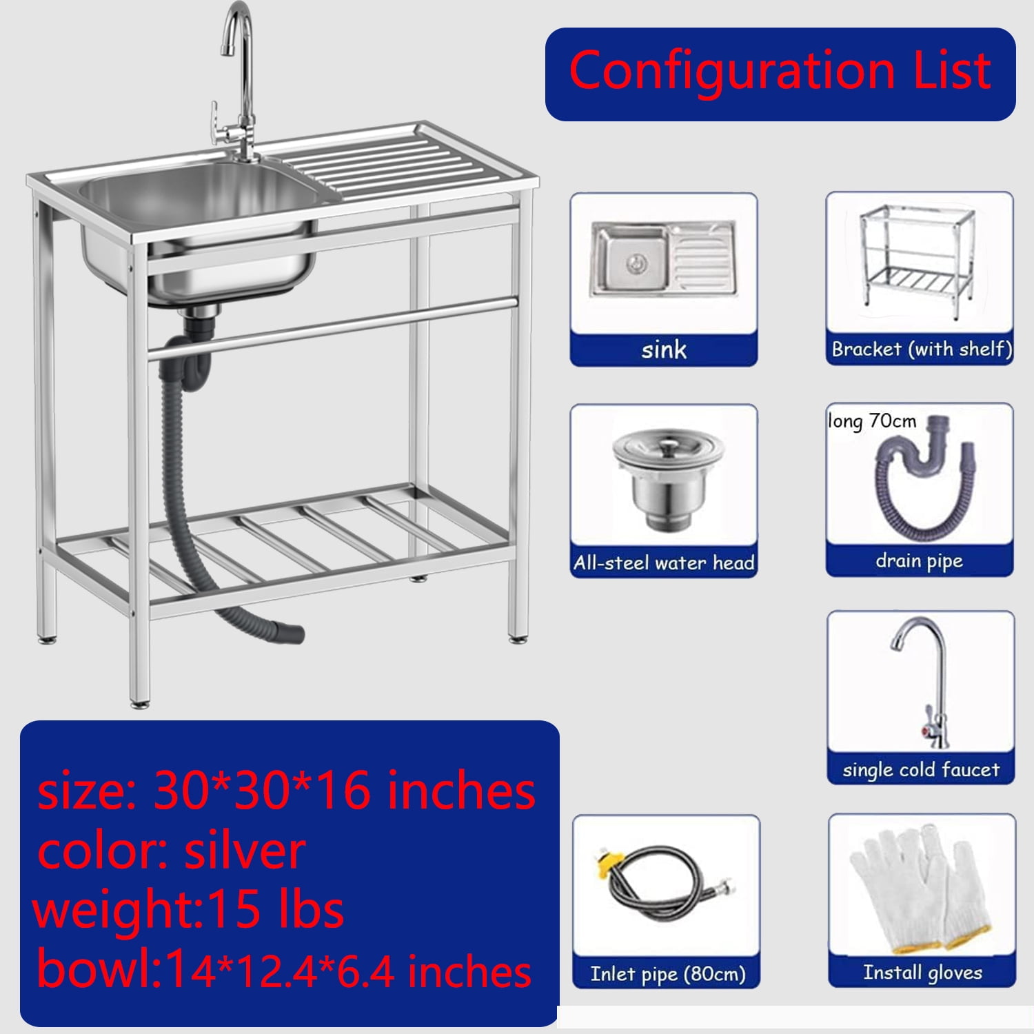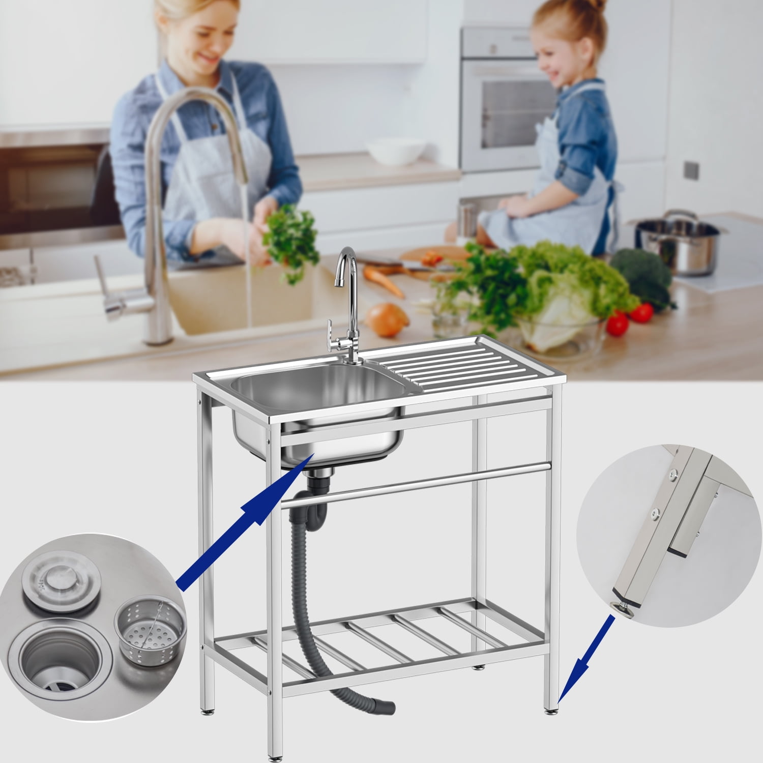 【Stainless Steel Sink with Hot&Cold Water Faucet】With streamlined rounded corners and edges, no dead corners, with taps and water inlets for easy daily cleaning, the spacious worktop gives you enough space to dry everything from utensils, plates to pots and pans Everything in the pot. 【Prep & Utility Sink Set】The double shelves can store cleaning equipment and accessories, the basin with stainless steel drainage devices with detachable filters can prevent food and debris from clogging the drainage pipe.360 degree rotation Faucet is convenient to use. 【Stand-alone sink】 Can be used in any environment to meet different needs, complete accessories, water head,S-type drain pipe,angle valve, can prevent food and debris from clogging the drain pipe and prevent odor. 【Premium Stainless Steel free standing sink】Made of high-quality stainless steel, stable in structure, with polished surface, rust and corrosion resistance, can withstand high-volume fast-paced commercial kitchen environments, with foot pads to protect your floors from scratches, long-lasting use. 【Scope of application】It is perfect for hand washing and cleaning of food, fruits and vegetables, it is perfect for use in commercial restaurants, garages, laundry rooms, basements, patio bars, kitchens, food trucks, etc.