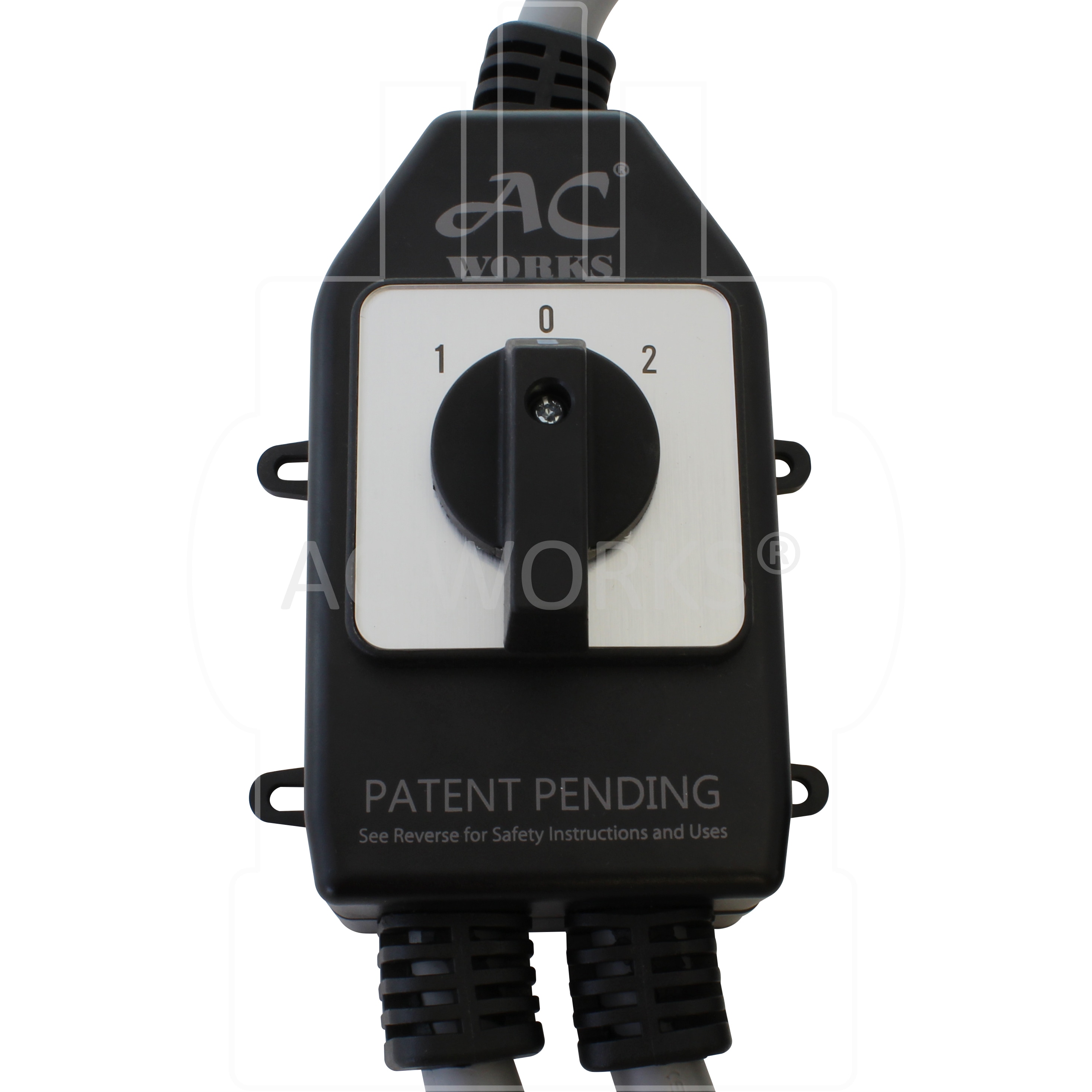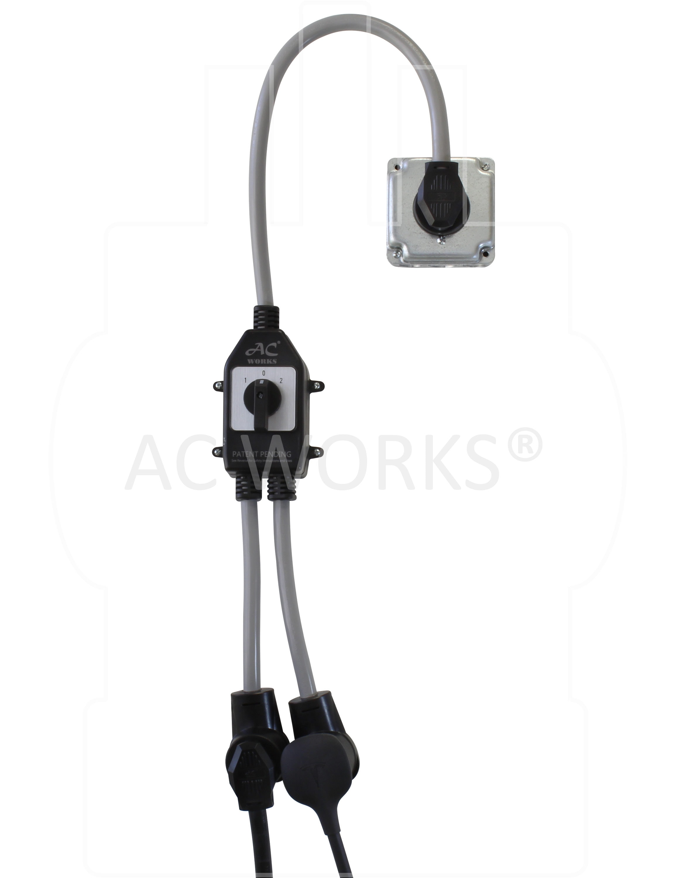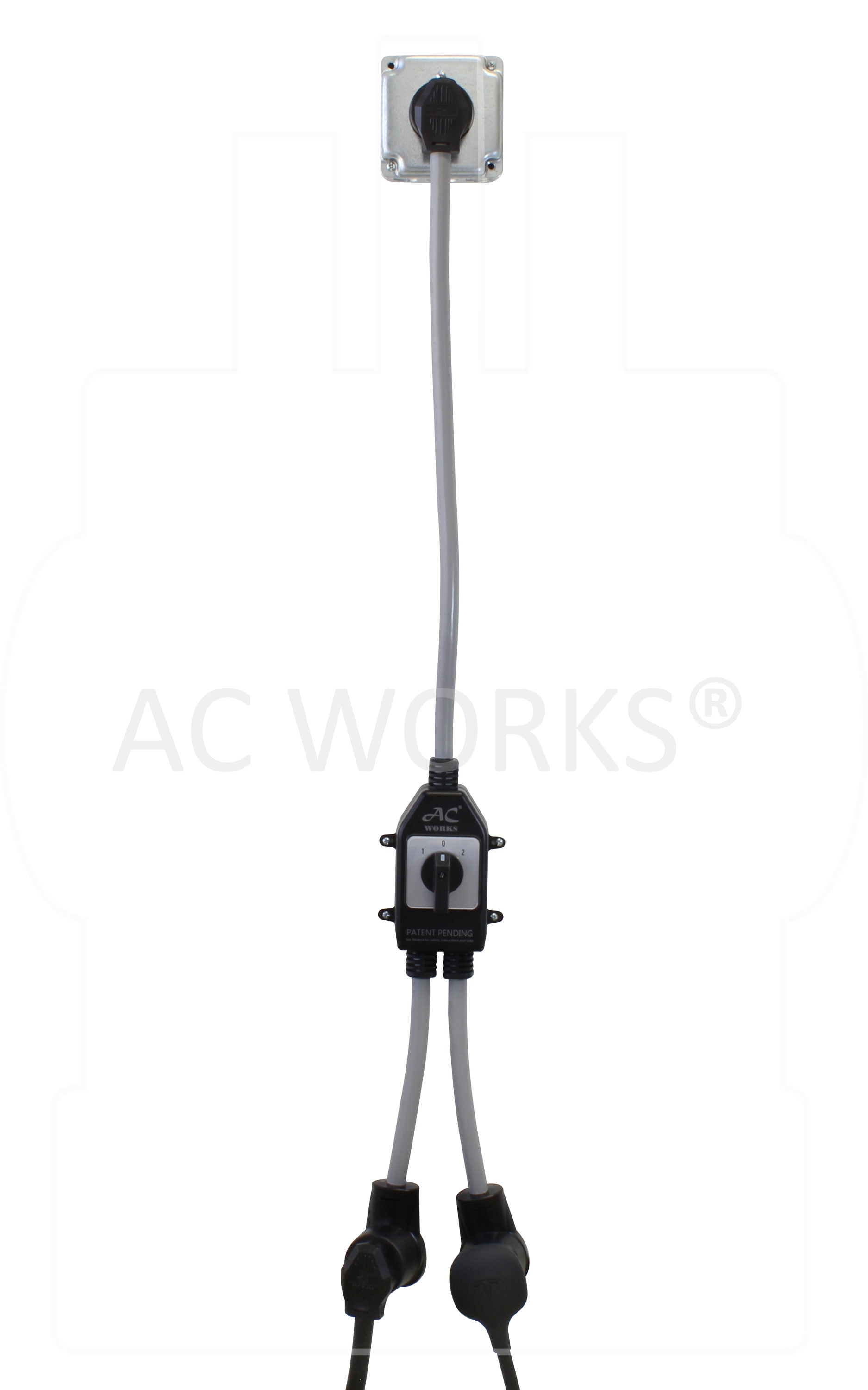 This AC WORKS® brand safety switch Y-cable is very durable with a length of 3 feet. It is a NEMA 14-30P to two NEMA 14-30R. The adapter is used to connect two different appliances, like a dryer and EV charging cable, at once without having to plug and unplug cords all the time. Using this switch, you can plug two appliances in at once and power one appliance at a time, without tripping the breaker. A common use for this product is switching between powering your 4-prong dryer and EV charger. Keep both items plugged in, one to each of the connectors, and then use the switch to power each one at different times. You can even label the switches for more convenience. This product includes a 5-year limited warranty.