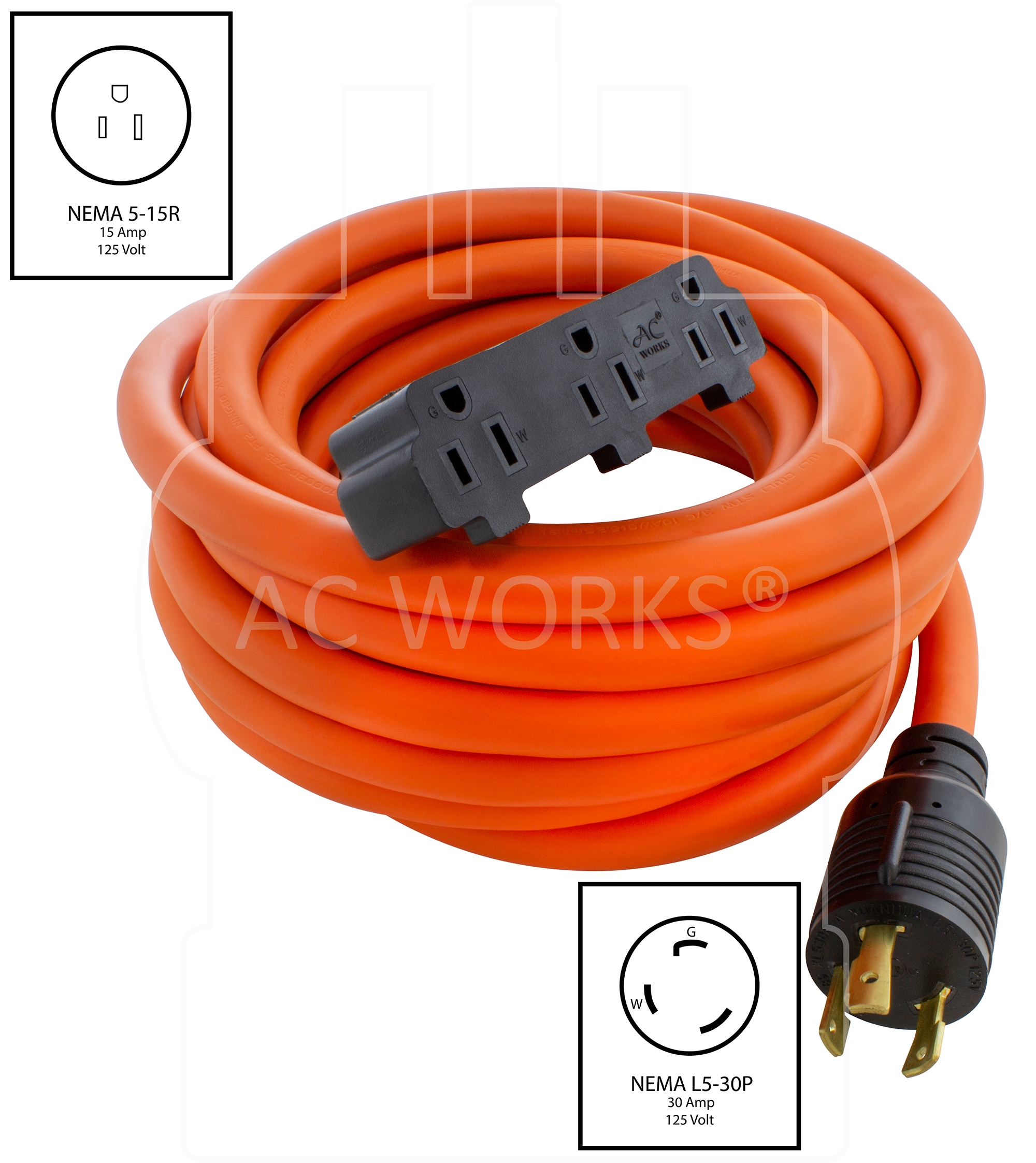 Introducing the AC WORKS Power Distribution Cord, a reliable solution designed to meet your power needs with convenience and durability. Spanning an impressive 25 feet in length, this cord offers ample reach for various applications. Its versatile design features a NEMA L5-30P plug, boasting 30 Amps and 125 Volts, ensuring robust power delivery. Equipped with three NEMA 5-15R outlets, it effortlessly accommodates multiple devices, transforming a single power source into a hub of connectivity. Crafted for resilience, the cord showcases an STW construction, fortified with 10/3 gauge wiring to withstand harsh weather conditions while maintaining flexibility, making it ideal for outdoor usage. The straight-blade household style connector end ensures easy compatibility with standard outlets. Plus, with the added assurance of a 5-year limited warranty, you can trust in the longevity and performance of your investment. Upgrade your power distribution setup with confidence, courtesy of the AC WORKS Power Distribution Cord.