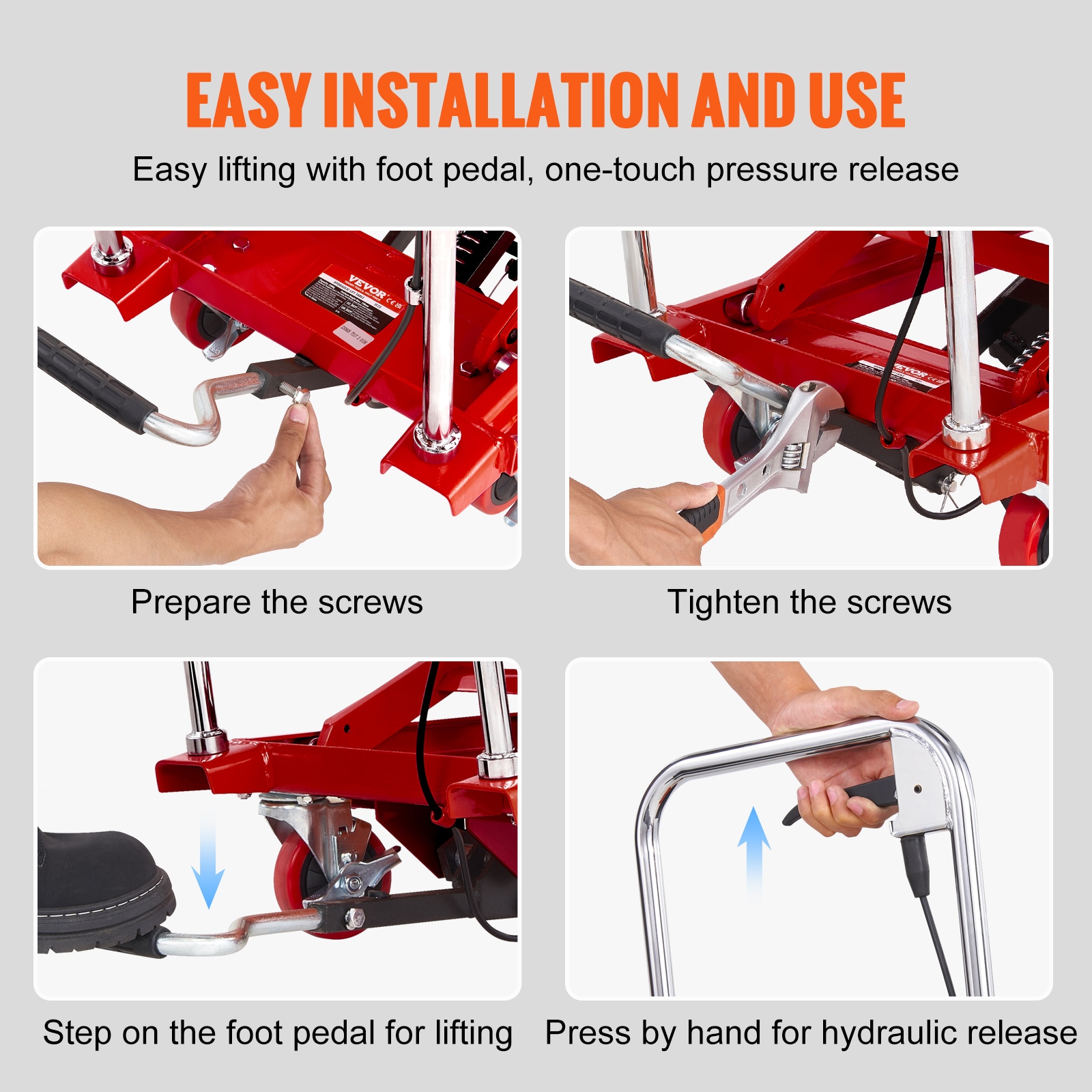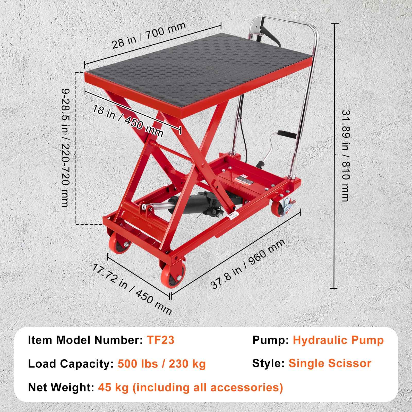 VEVOR Hydraulic Lift Table Cart: VEVOR, your trusted tool expert; Our hydraulic lift table cart can handle weights up to 500 lbs; Built with premium thickened steel for the scissor and platform, it ensures stability and reliability; The rust-resistant powder-coated surface prolongs its lifespan; Whether for home or industrial use, our product is an excellent choice; It provides you convenience, comfort, and efficient material handling in your work and daily life!; [Package Content] 1 x Hydraulic Lift Table Cart; 1 x Non-slip Pad; 1 x User Manual