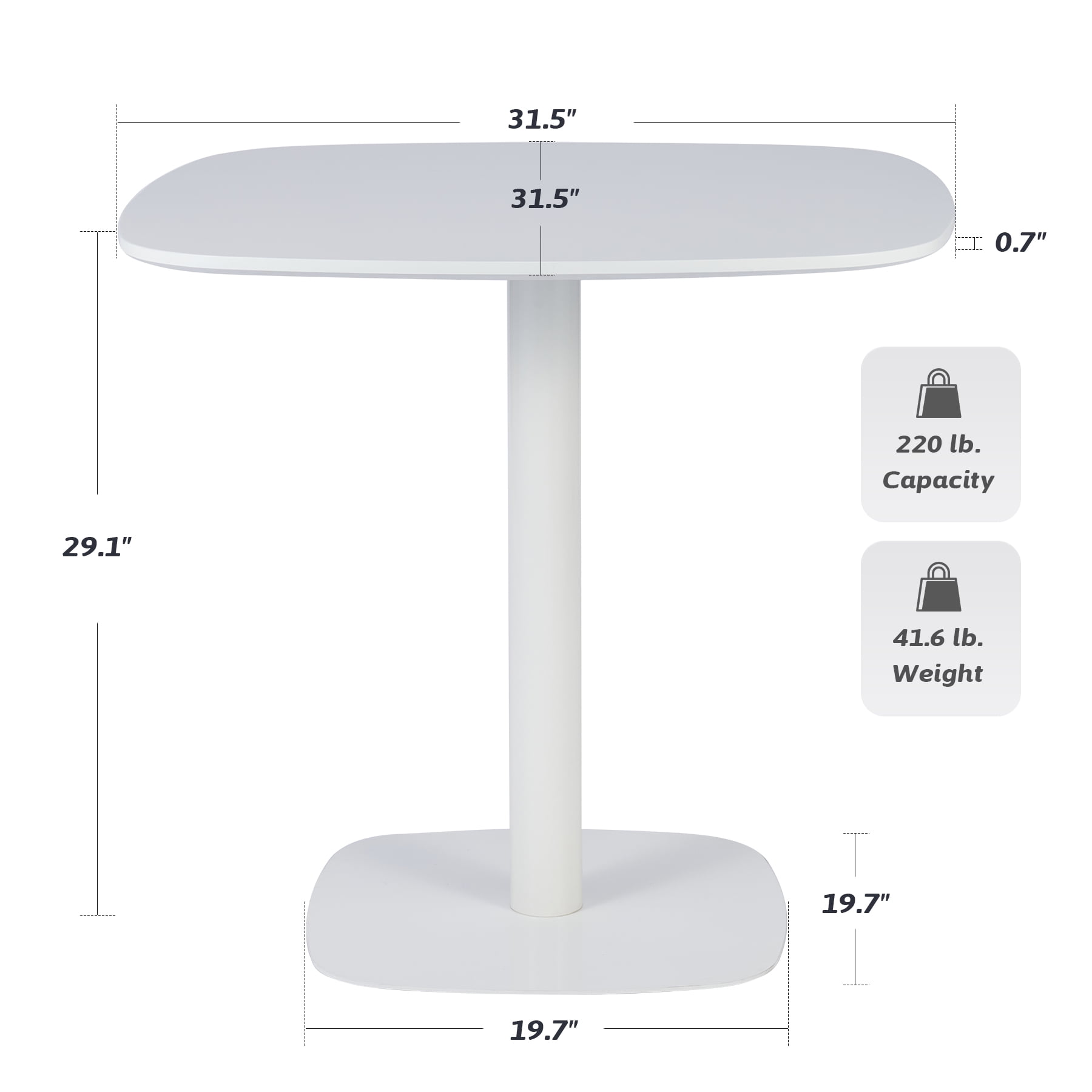 Description: Create an intimate setting while maximizing space with this matte white finished modern dining table. Measuring 31.5 inches in length, our mid century kitchen table can easily fit in any space. Comfortably fitting up to 4 people, this small pedestal table works well as a dinner table, dining nook, coffee table, and game table. This versatile square tulip table is built to last, easily supporting up to 220 pounds thanks to its MDF tabletop, sturdy cold rolled steel leg, and 19.7 inch wide base. Easy to assemble, this functional yet graceful modern bistro table sets up quickly to add a charming minimalist touch to your home. Features: MODERN DINING TABLE: This square tulip table offers a comfortable and stylish dining experience for up to 4 people, perfect for intimate meals, small family gatherings, and friend reunions ELEGANT STYLE: With its matte white finish, our small pedestal table adds class to your home decor, seamlessly blending with a variety of interior styles from modern minimalist to coastal STURDY BASE: The nearly 20″ square steel base with four soft pads is weighted to anchor your modern dining room table in place on any flooring while still leaving plenty of legroom underneath DURABLE CONSTRUCTION: Our kitchen table features a premium MDF tabletop, a sturdy cold-rolled steel leg, and a 19.7 inch wide base, with a weight capacity of 220 pounds for reliable strength and longevity SET UP IN MINUTES: With clear instructions and predrilled holes, you will be enjoying this bistro table in no time with its intuitive design Specifications: Material: MDF, Steel Color: White Seating Capacity: 4 Product Dimensions: 31.5 x 31.5 x 29.1 in. (80x80x74 cm) Base Dimensions: 19.7 x 19.7 in. (50×50 cm) Package Dimensions: 35.4 x 35.4 x 8.3 in. (90x90x21 cm) Weight Capacity: 220 lb. (100 kg) Net Weight: 41.6 lb. (18.6 kg) Package List 1 x Square Dining Table 1 x Instructions