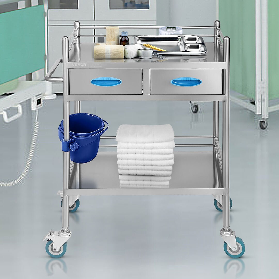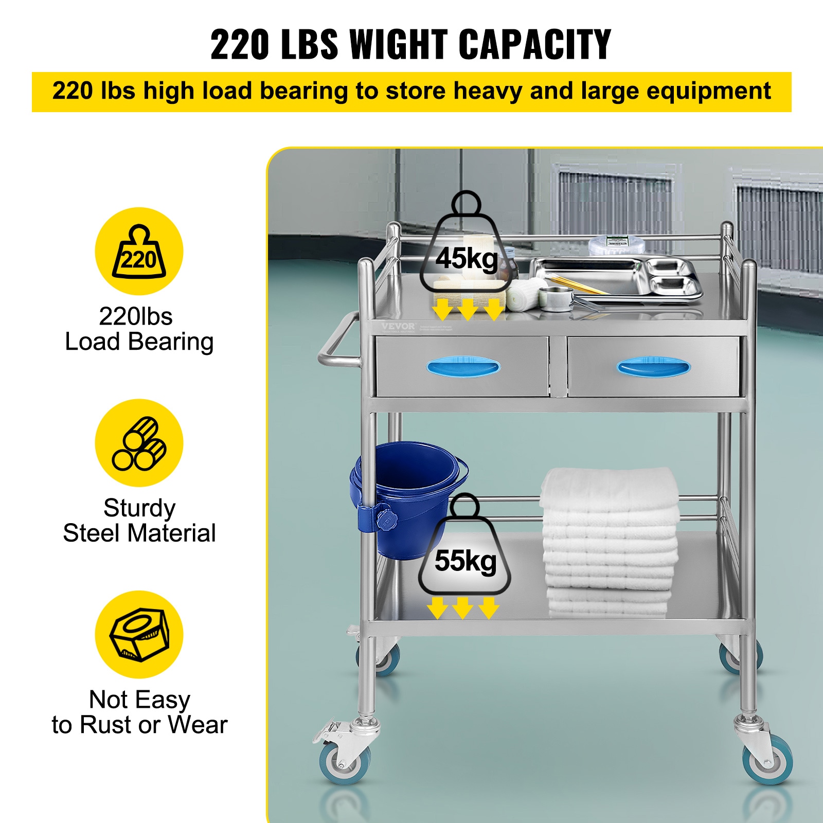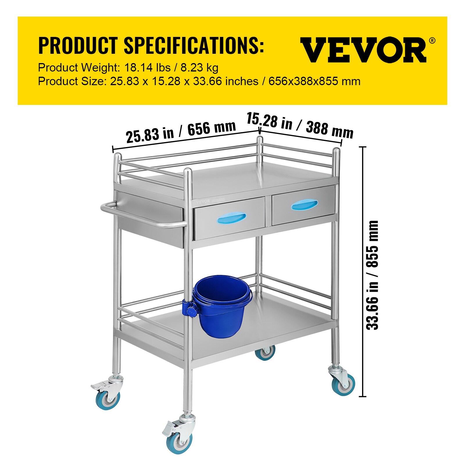 2 Shelves Mobile Lab Cart: The stainless steel laboratory trolley supports up to 220 lbs; This laboratory rolling cart is designed with 2 shelves, which optimizes your storage solutions; 4 rolling casters (2 lockable) provide smooth mobility; Suitable for laboratories, clinics, SPAs, beauty salons, etc;; [Package Content] 1 x Lab Medical Cart; 1 x Bucket