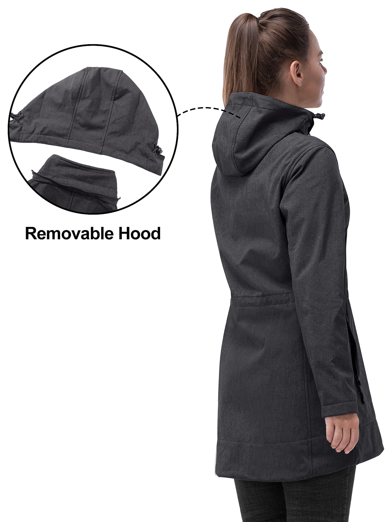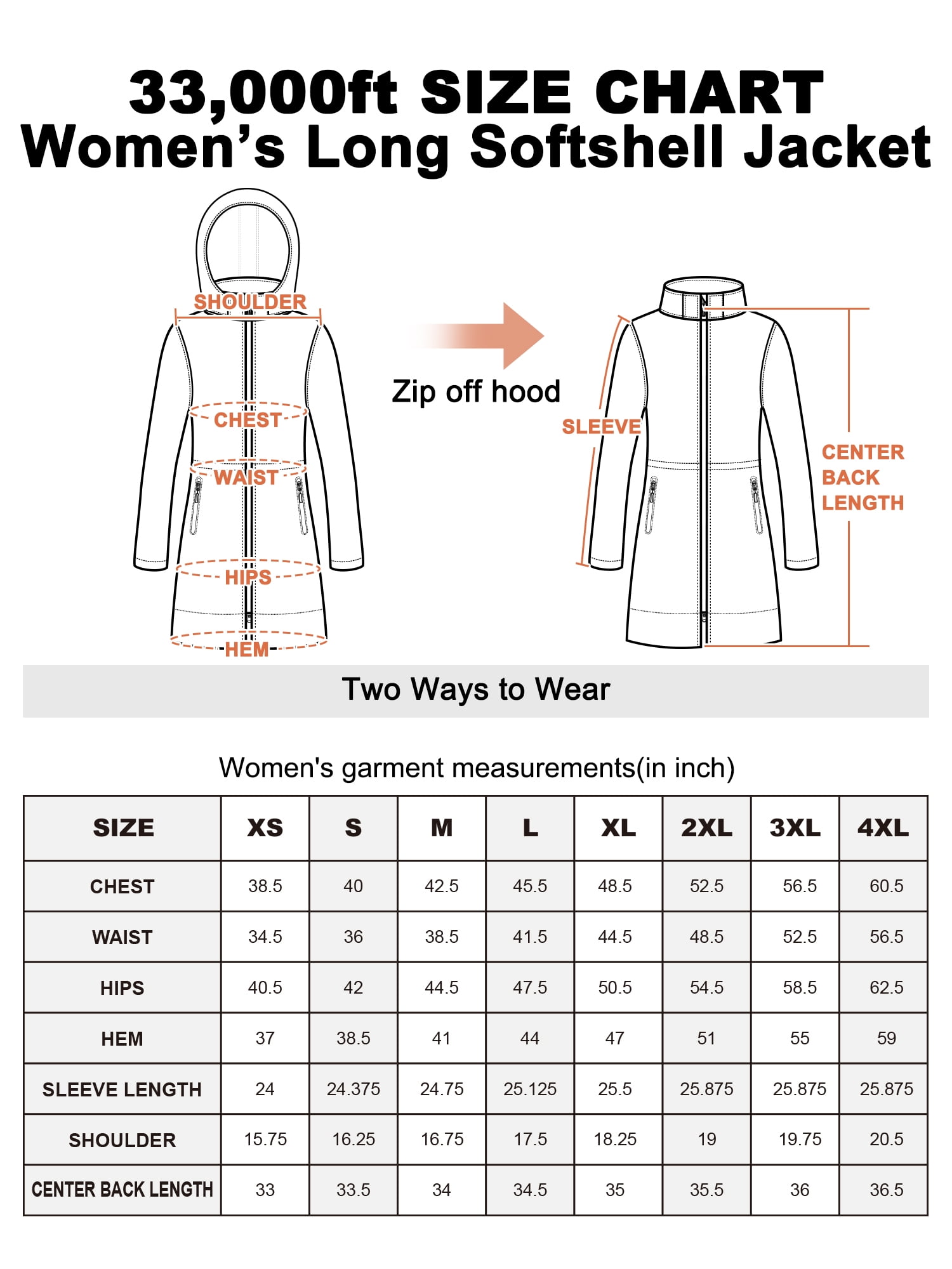 ADVANCED SOFTSHELL TECHNOLOGY: This 33,000ft women’s long softshell jacket with detachable hood features 3-layer high performance softshell fabric with a waterproof, windproof, and breathable shell, perfect for outdoor activities. Spandex synthetic material has great flexibility and lightweight comfort to keep you warm with inner soft fleece lining. 4 UTILITY POCKETS: This 33,000ft women’s insulated windbreaker has 2 outside zippered security pockets and 2 large inner patch pockets. They are generous sized for carrying your essentials such as a cellphone, wallet, keys, gloves etc. LONG JACKET WITH REMOVABLE HOOD:This women’s hiking jacket has adjustable removable hood to keep you well protected in rainy, windy and snowy weather. The stand collar with soft chin guard keeps your neck and chin comfortable and warm when the jacket is fully zipped up. MULTI-FUNCTIONAL DESIGN: This 33,000ft women’s long softshell coat with detachable hood has adjustable waist drawstrings inside offering a customized flattering fit and fashion style. It also comes with double zippers which provide enough room for your hips when sitting and getting in and out of a car.