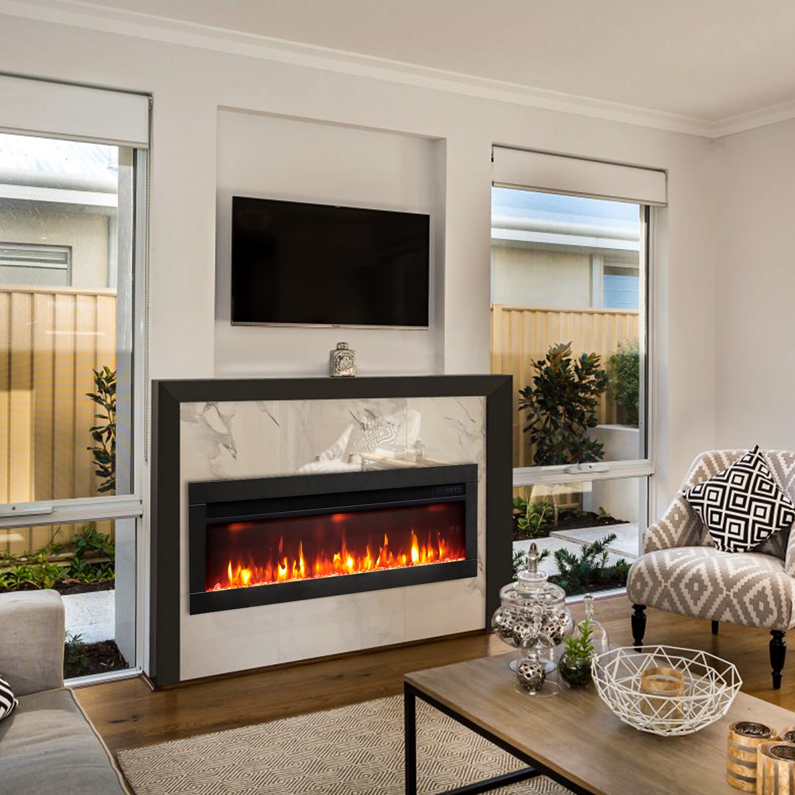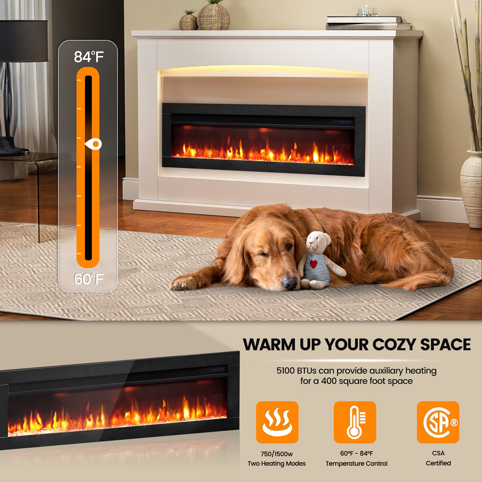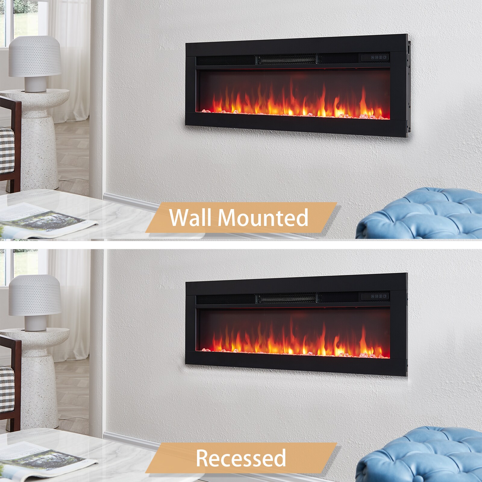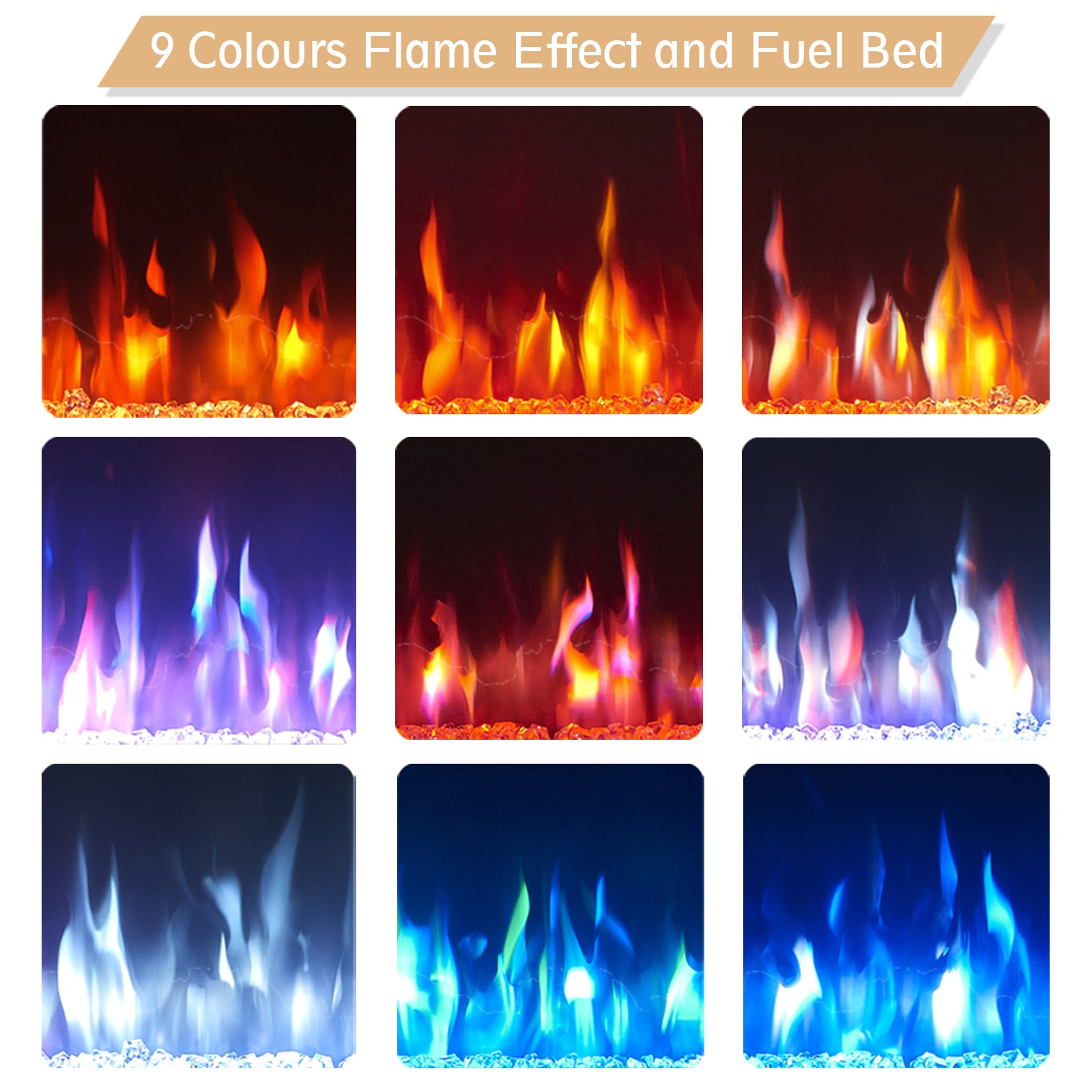 To create the cozy atmosphere of a traditional fireplace, this electronic unit emits authentic-looking flames that emulate a real fire; This fireplace has 9 color combinations, allowing you to set just the right mood; We offers two heat settings which quickly add heat to a room up to 400 sq ft. Please note the heater isn’t designed to be the primary heat source in your room or home. It’s designed to warm up a cool evening, or bring the temperature of a room up a few degrees. The visual appeal and heat emitted by your electric fireplace place in addition to your home’s primary heating source will provide your room with a cozy and calming aura. The over-heating protection system will automatically turn on.