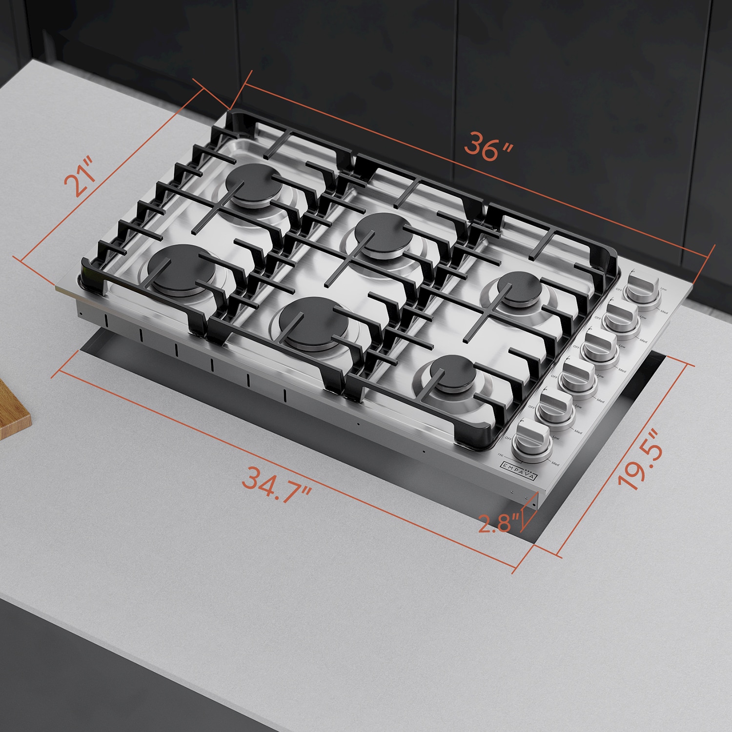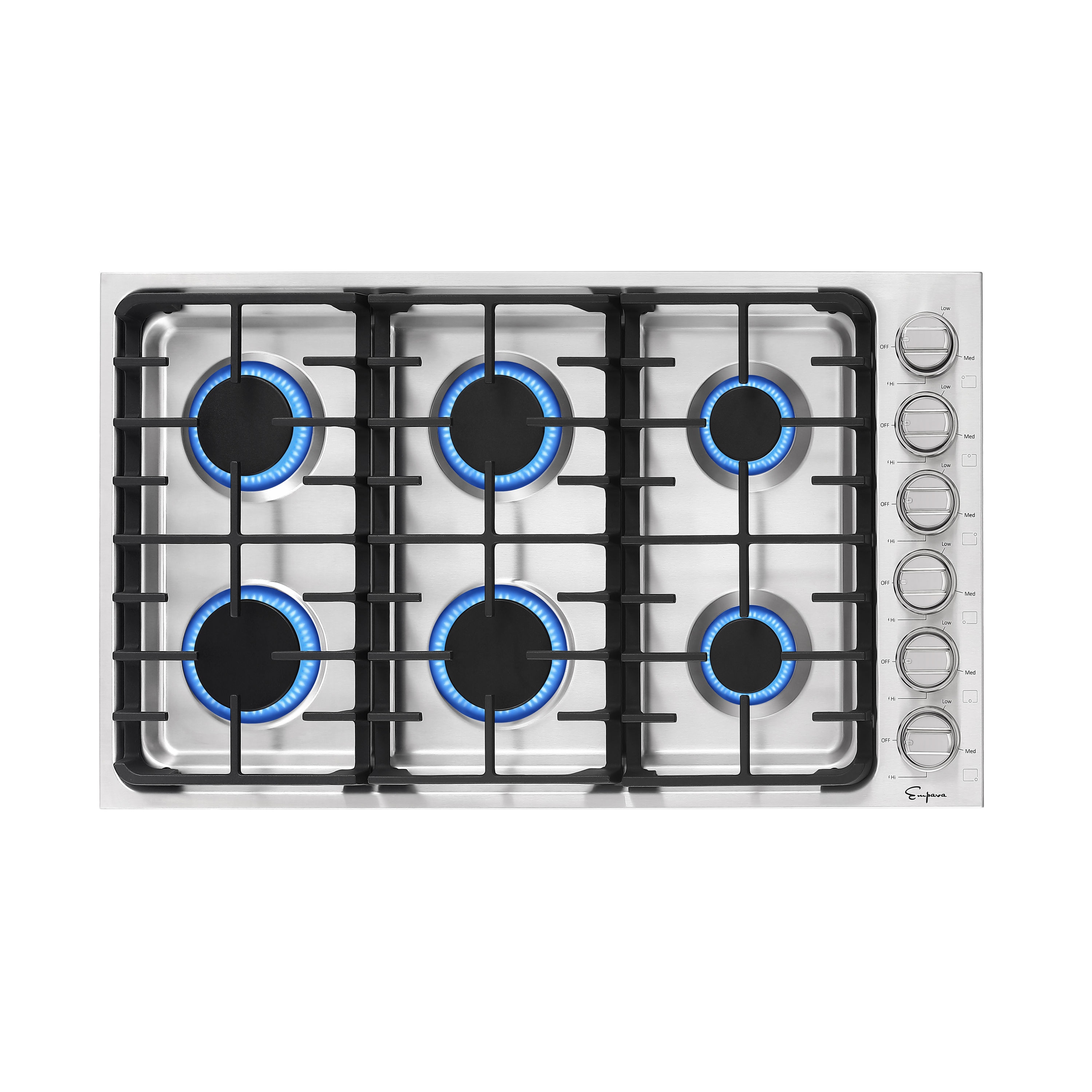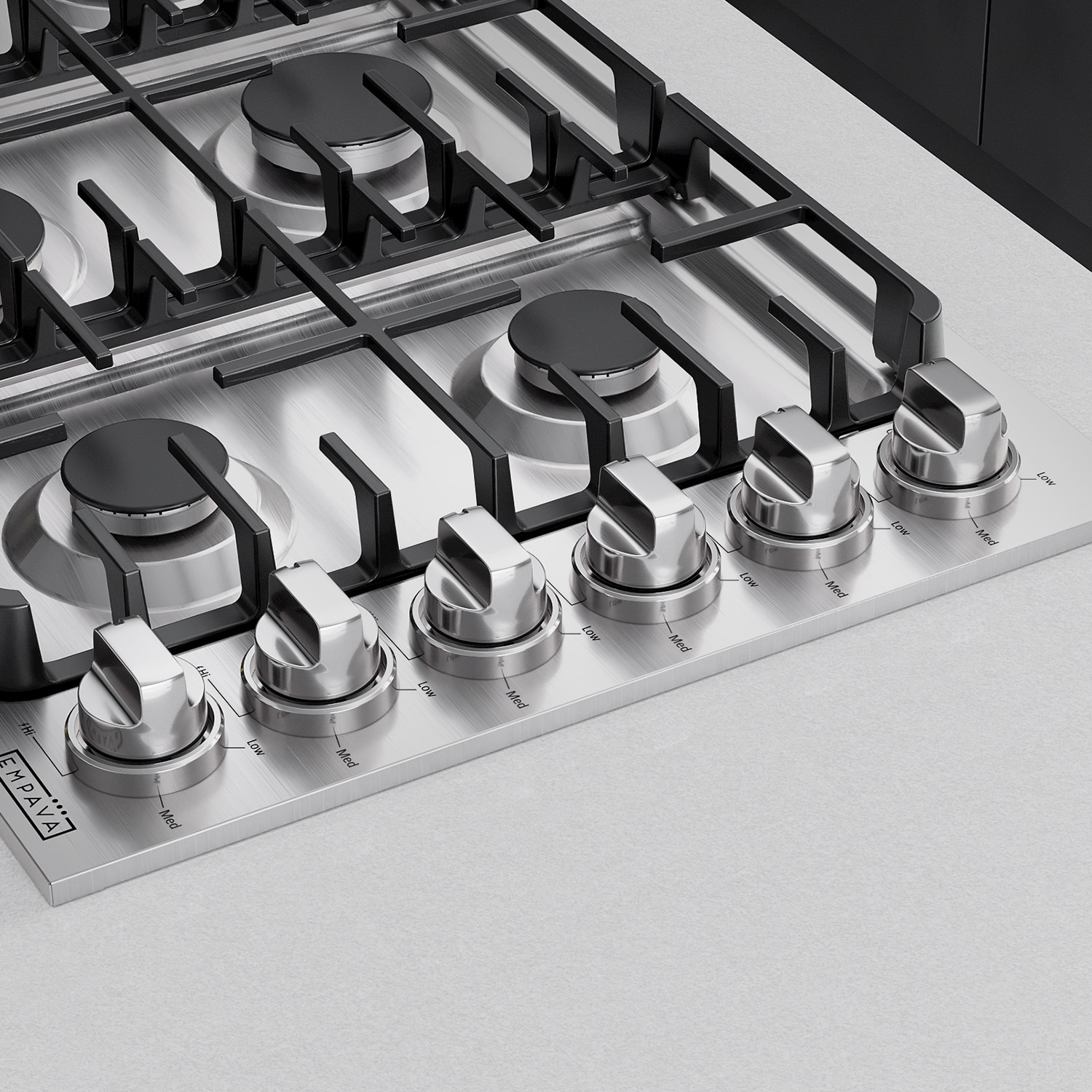 The Empava 36-inch gas cooktops with the CSA certified is a perfect combination of style and practicality. Constructed with 18-gauge stainless steel for exceptional resistance to corrosion and rust. Handcrafted brushed satin finish to prevent dents and scratches for long lasting use in your busy kitchen. The gas cooktops feature commercial-grade components (2x 18000-BTUs, 2x 12000-BTUs and 2x 6000-BTUs), the power burner designed to reach maximum temperatures quickly as well as a simmer burner for more delicate, controlled heat. The metal constructed knobs and the heavy-duty cast iron grates can be cleaned in the dishwasher. During the past years, 36-inch gas cooktops by Empava appliances have been a very popular choice for kitchen upgrades and new builds, allowing you to cook restaurant quality meals from the comfort of your own home.