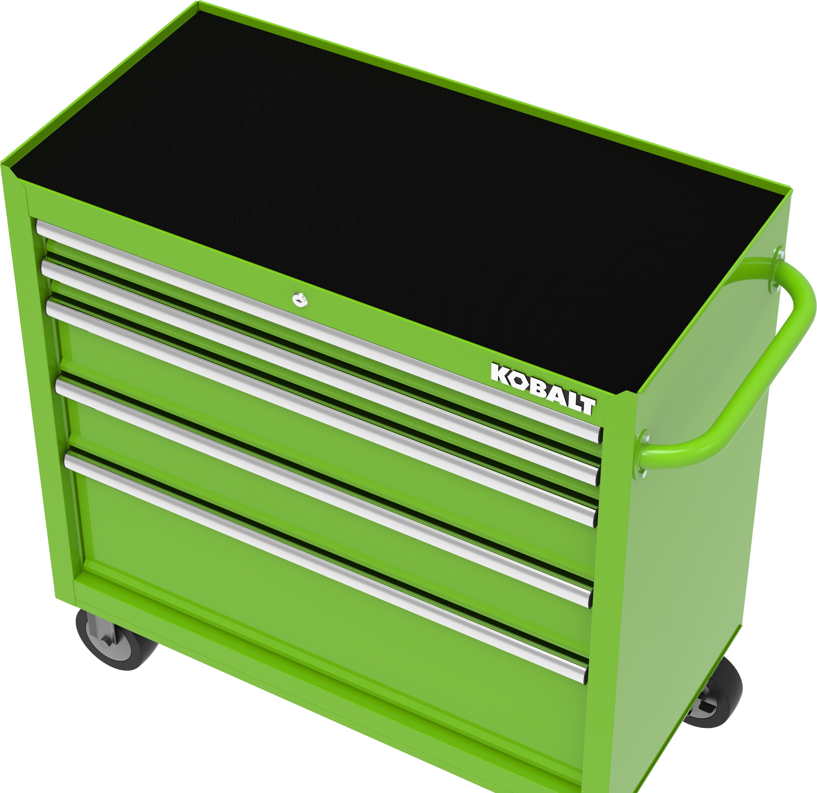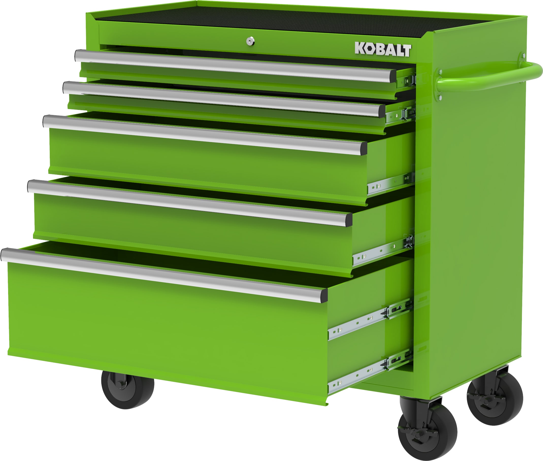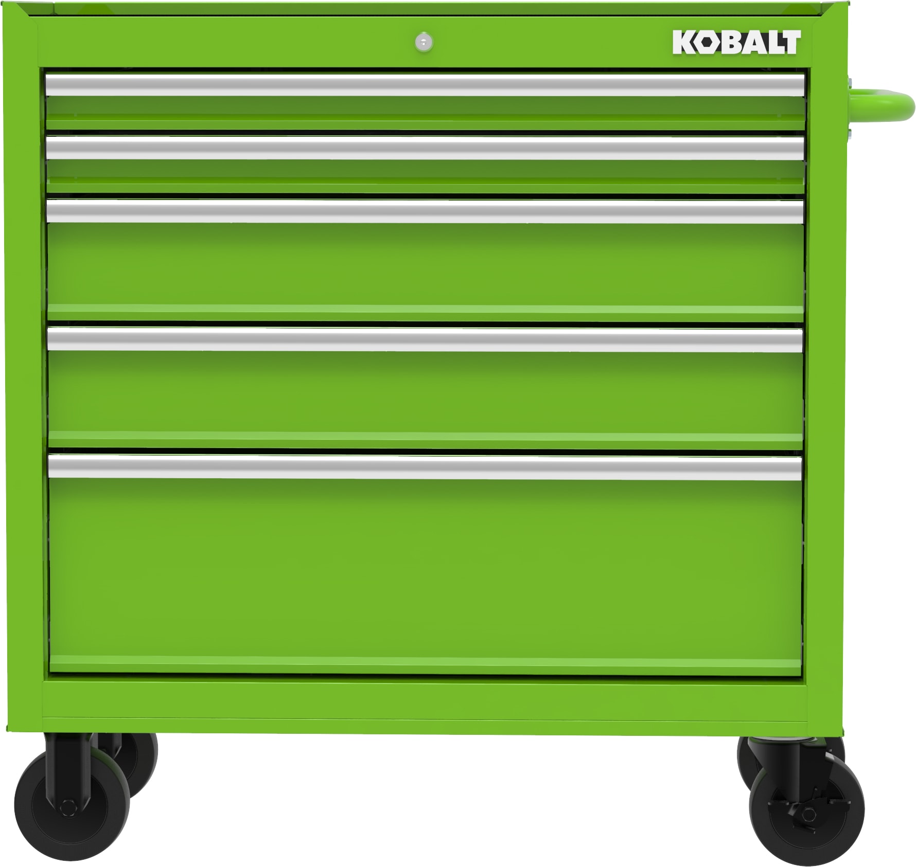 The Kobalt 36-In 5-Drawer Green Cabinet is great for storing and organizing all your tools and hardware. The unit is made from high grade all welded steel construction with a tough, rust-resistant powder coat finish. 5 Drawers are all soft-close full-extension and glide effortlessly on ball-bearing slides that can support up to 100 lbs. An ergonomic handle and 5 in. x 2 in. casters allow you to easily move your cabinet around your workspace. Total weight capacity of the unit is 1,200lbs. The cabinet has lock system for added security. Pair this cabinet with the Kobalt 36-In 6-Drawer Green Chest (item: 5215667, sold separately) to create the ultimate tool storage solution.