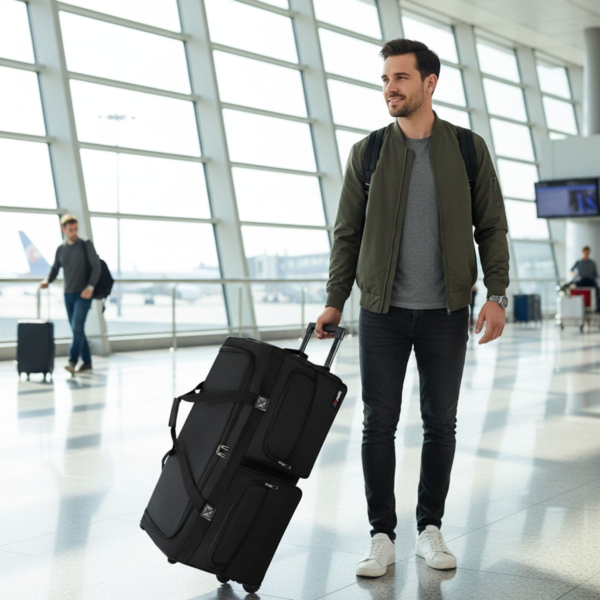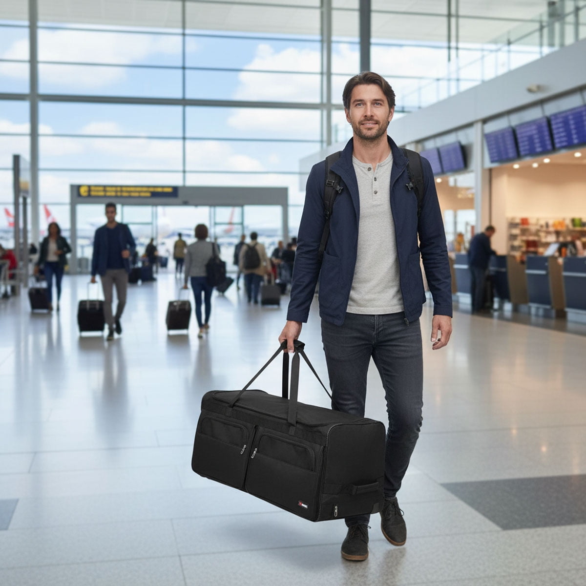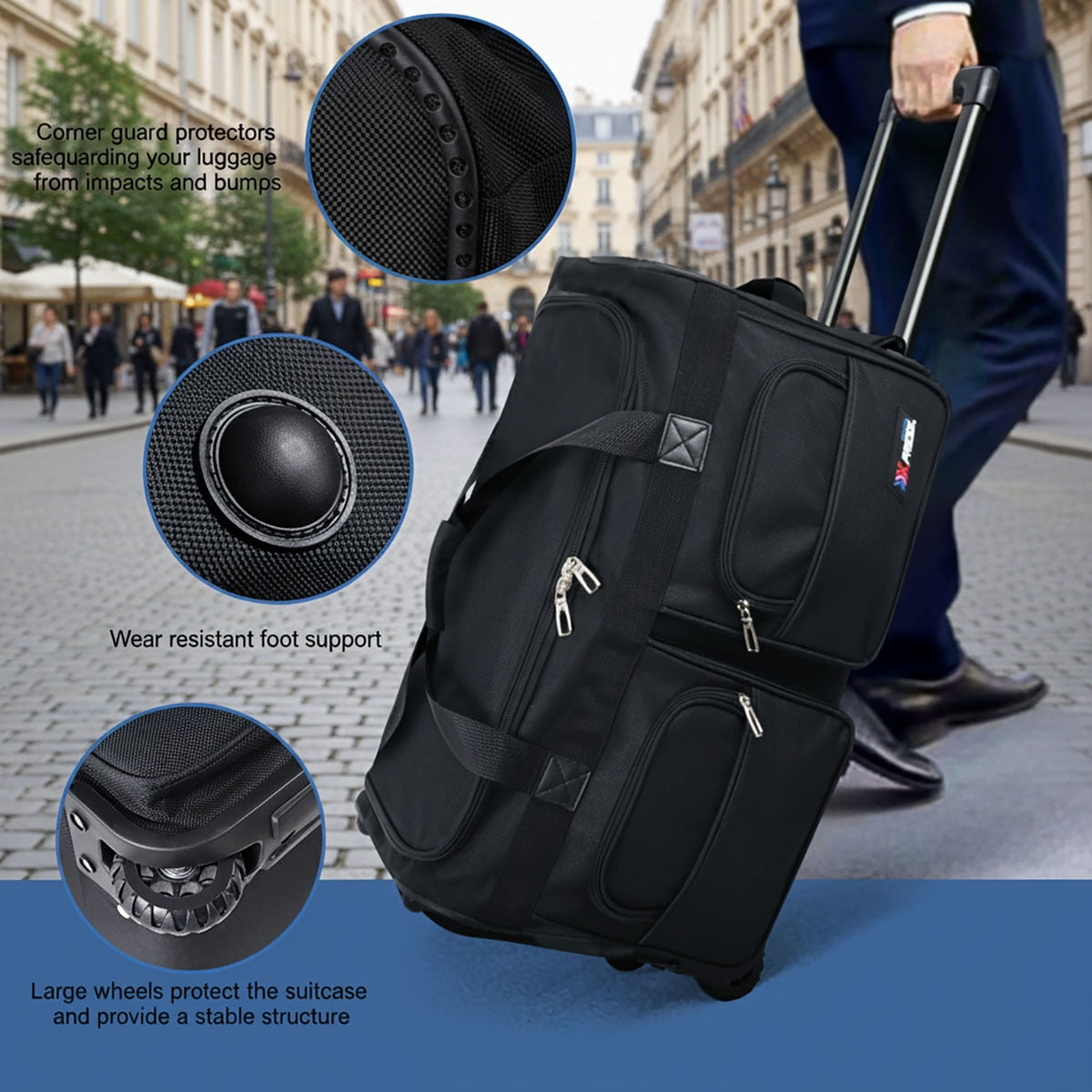 New York XPress rolling duffel bag is the perfect companion for the traveler and the outdoor adventurer.this duffel bag with wheels is made of durable, tear – resistant 600D polyester, which can protect your items during travel.Large rolling duffel bag features a spacious main compartment for your travel clothes or everything you need for your adventure, while two side pockets provide additional storage for smaller items and essentials.The duffle bag is equipped with a telescoping handle, a carry handle, and durable inline wheels , it combines the convenience of a suitcase with the flexibility of a traditional duffel bag and can easily stand upright.Our rolling duffel bags come in 4 sizes: 22″ carry-on, 30″/36″/40″ checked. Perfect for all travel, work, weekends, and outdoor adventures. Choose our versatile rolling duffel for effortless, organized trips. Dimensions: 22″:12.5*12*22 inch — weight:5.05lb 30″:13.5*14*30 inch — weight:6.45lb 36″:15*15*36 inch — weight:7.50lb 40″:15.5*15.5*40 inch — weight:7.70lb