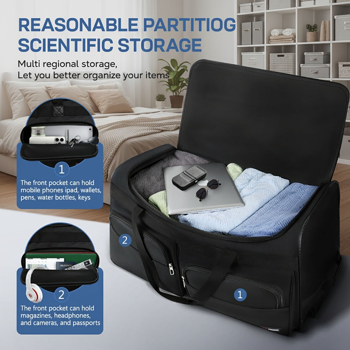 【MATERIAL】Wheeled duffel bag in 600D polyester is durable and able to withstand the wear and tear of everyday travel. 【LARGE CAPACITY】The rolling duffel bag features a large U-shaped zippered end opening for easy access and two external front zippered pockets for quick organization. 【MULTIPLE GRIPS】The duffel bag is designed with a telescoping handle for easy pushing/pulling and a carry handle for lifting or going through security. 【STURDY WHEELS 】Two smoothly rolling wheels glide effortlessly on different surfaces. 【PORTABLE 】When not in use, the duffel bag can be folded into a compact size, taking up minimal space. 【VERSATILE 】This rolling duffle bag with trolley for short trips, weekend getaways, outdoor adventures, business, school and outdoor activities.