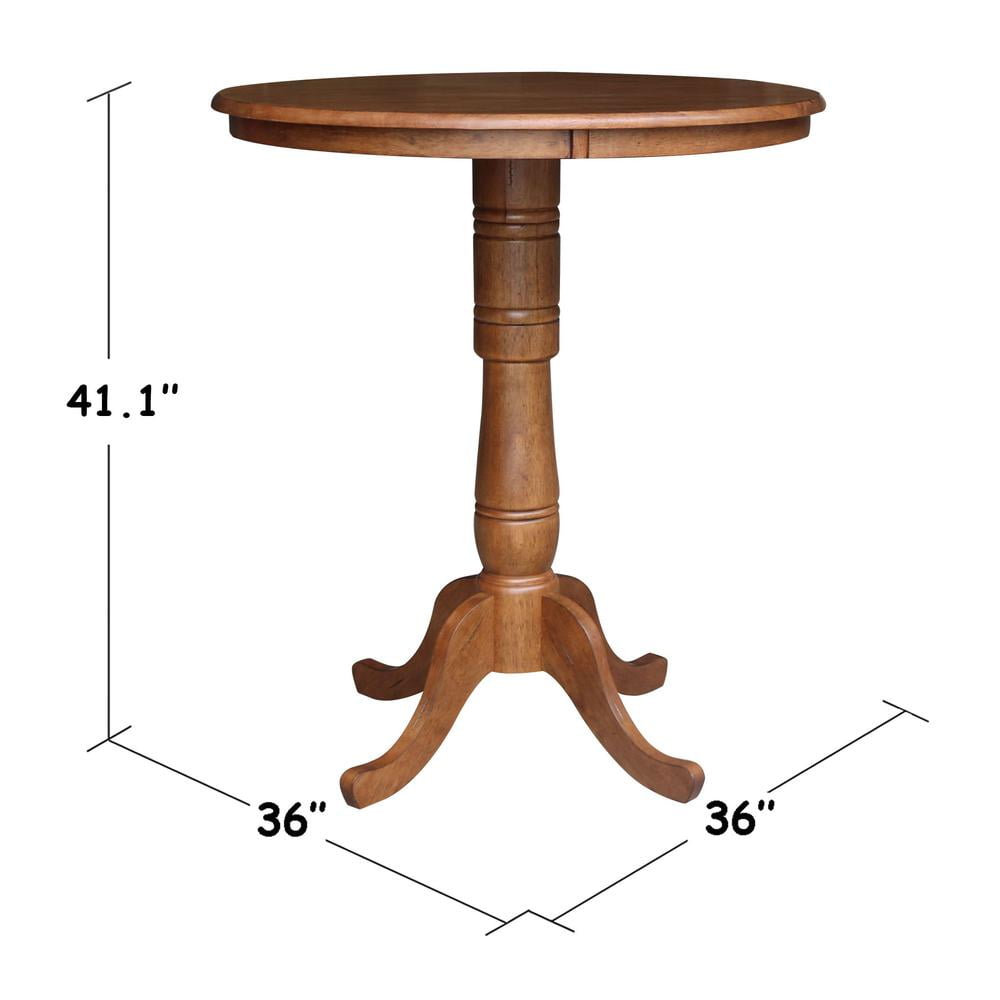 International Concepts home furniture is for those who appreciate high quality, wood furniture with a traditional and elegant look. This beautifully designed 30″ Round Top Pedestal Table constructed in solid wood in a Distressed Oak finish, will easily complement any decor in your home. This 41.1″ Height table would be a perfect addition to your kitchen, dining room or bar area. Features: Dimensions: 36″W x 36″D x 41.1″H Made from solid wood For use with bar height stools with a 30″ seat height Includes pedestal base with two 6″ extensions to convert to bar height table Distance from top to bottom of apron is 2.5″ Includes butcher block top Not rated for commercial use, for residential use only Specifications: Table Dimensions: 36″W x 36″D x 41.1″H Product Weight: 54.5 lbs.