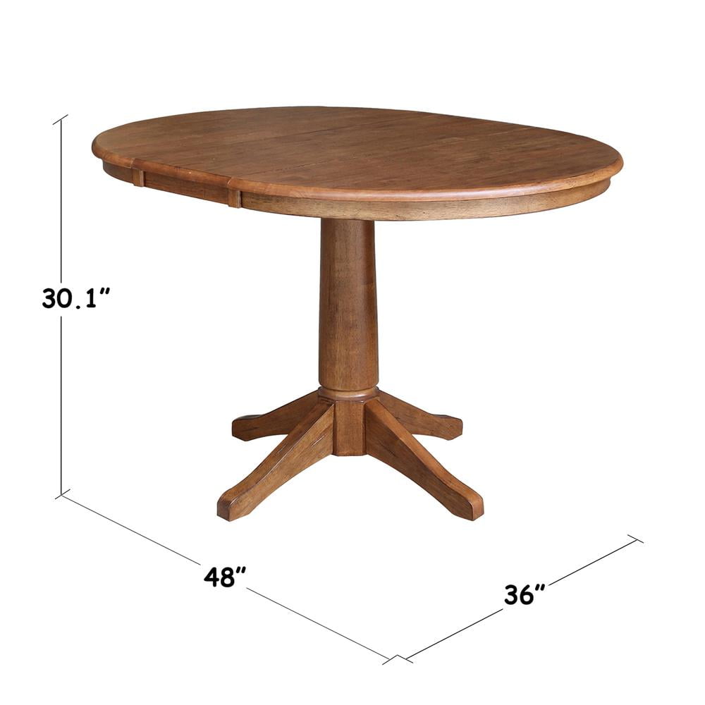 Table Dimensions: 36″W x 48″D x 30.1″H 36″ round top tableWith 12″ leaf Elegant pedestal base Butcher block top Easy assembly Not rated for commercial use, for residential use only