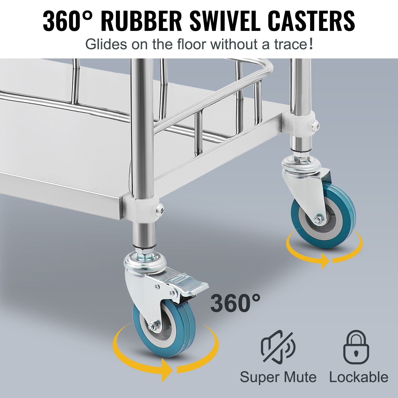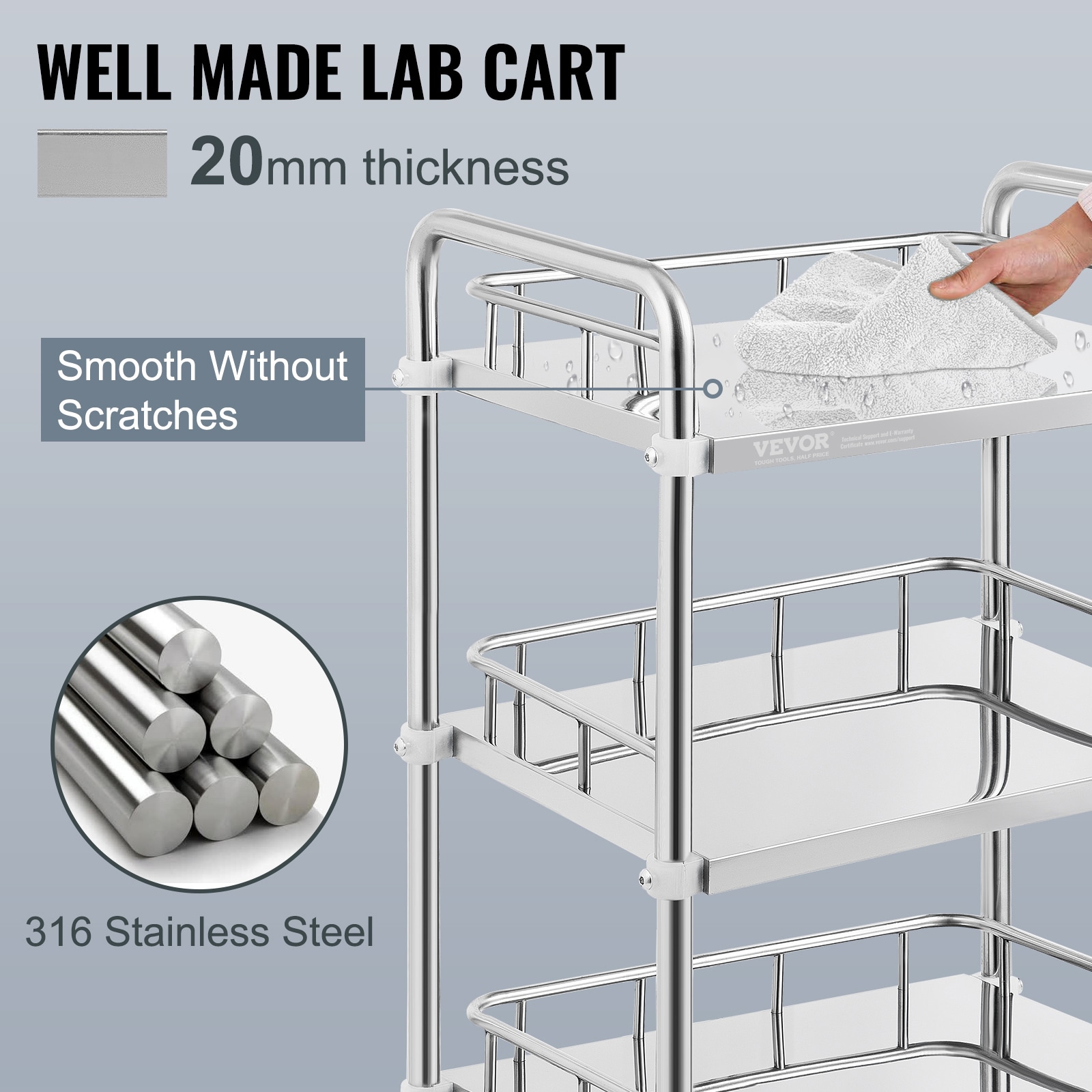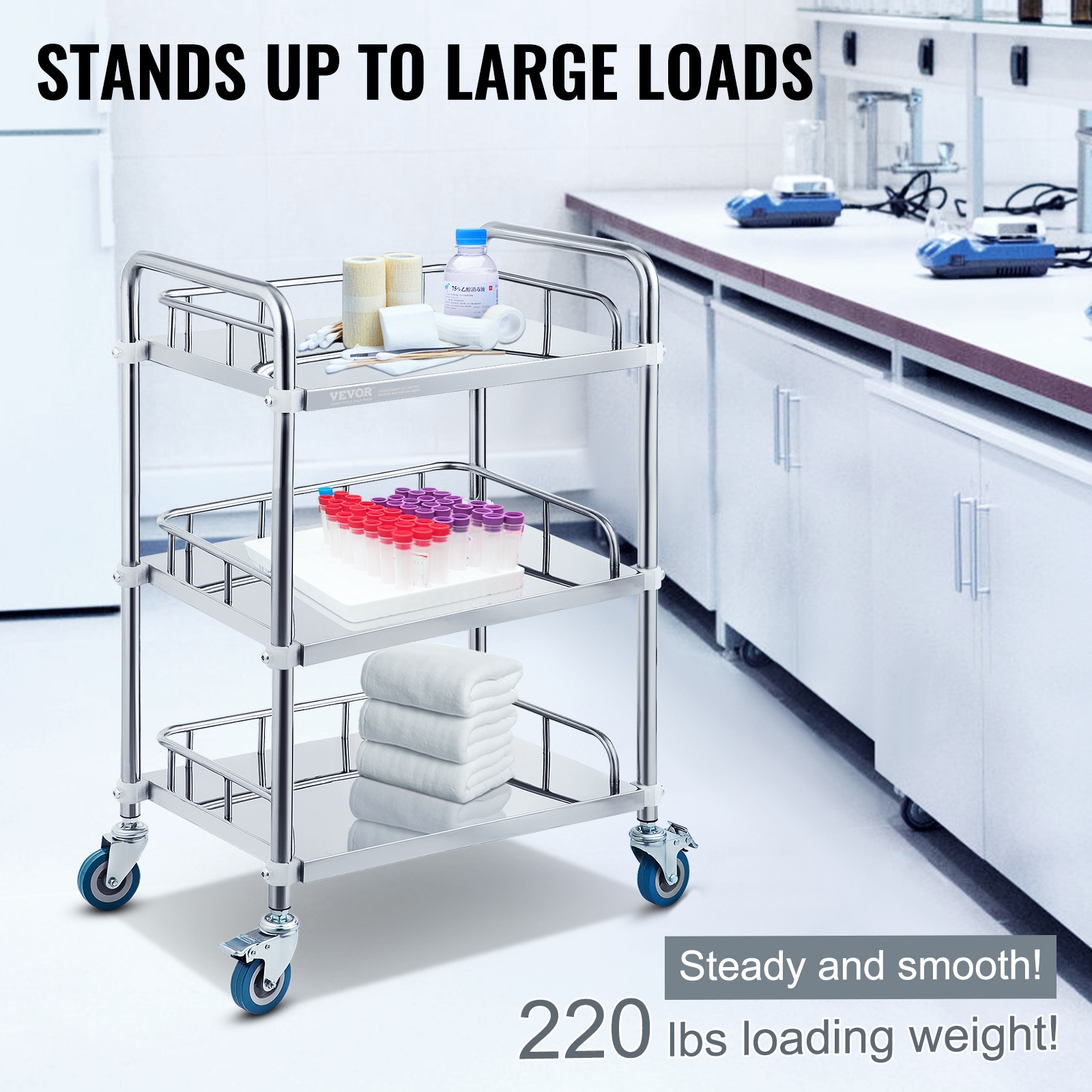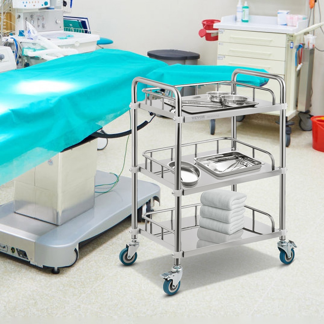 3 Shelves Mobile Lab Cart: The stainless steel laboratory trolley supports up to 220 lbs; This laboratory rolling cart is designed with 3 shelves, which optimizes your storage solutions; 4 rolling casters (2 lockable) provide smooth mobility; Suitable for laboratories, clinics, SPAs, beauty salons, etc;; [Package Content] 1 x Lab Medical Cart