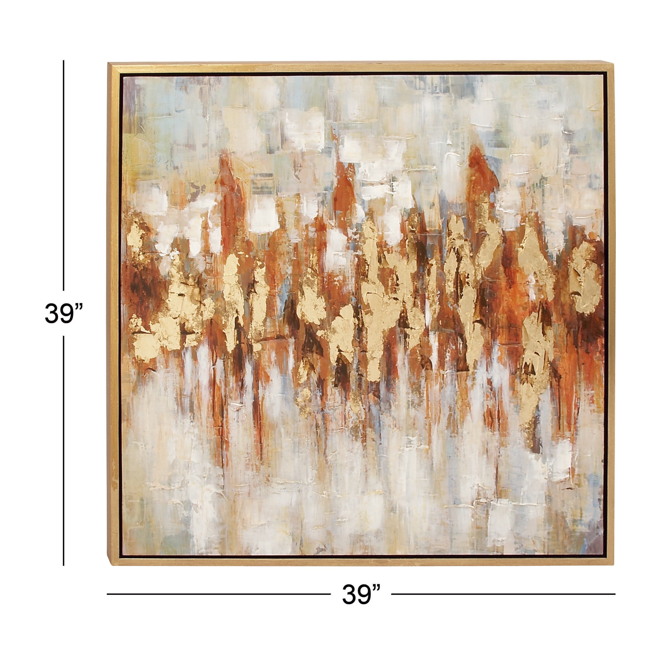 39″ x 39″ Abstract Framed Wall Art with Gold Frame, by DecMode is a unique addition to your stylish home. This wall art exude natural beauty and sophistication in both color and composition. Showcase your personality and turn your walls into an art gallery with this impressive wall art. Add personality to your traditional-themed home spaces with this golden-brown abstract wall art displayed in your living room, bedroom, or office. This item ships in 1 carton. The frame is made from Chinese fir and polystone with a light gold finish. Can be hung vertically using the sawtooths; nails and screws not included. Suitable for indoor use only. This item ships fully assembled in one piece. This is a single gold colored canvas wall art. Traditional style.