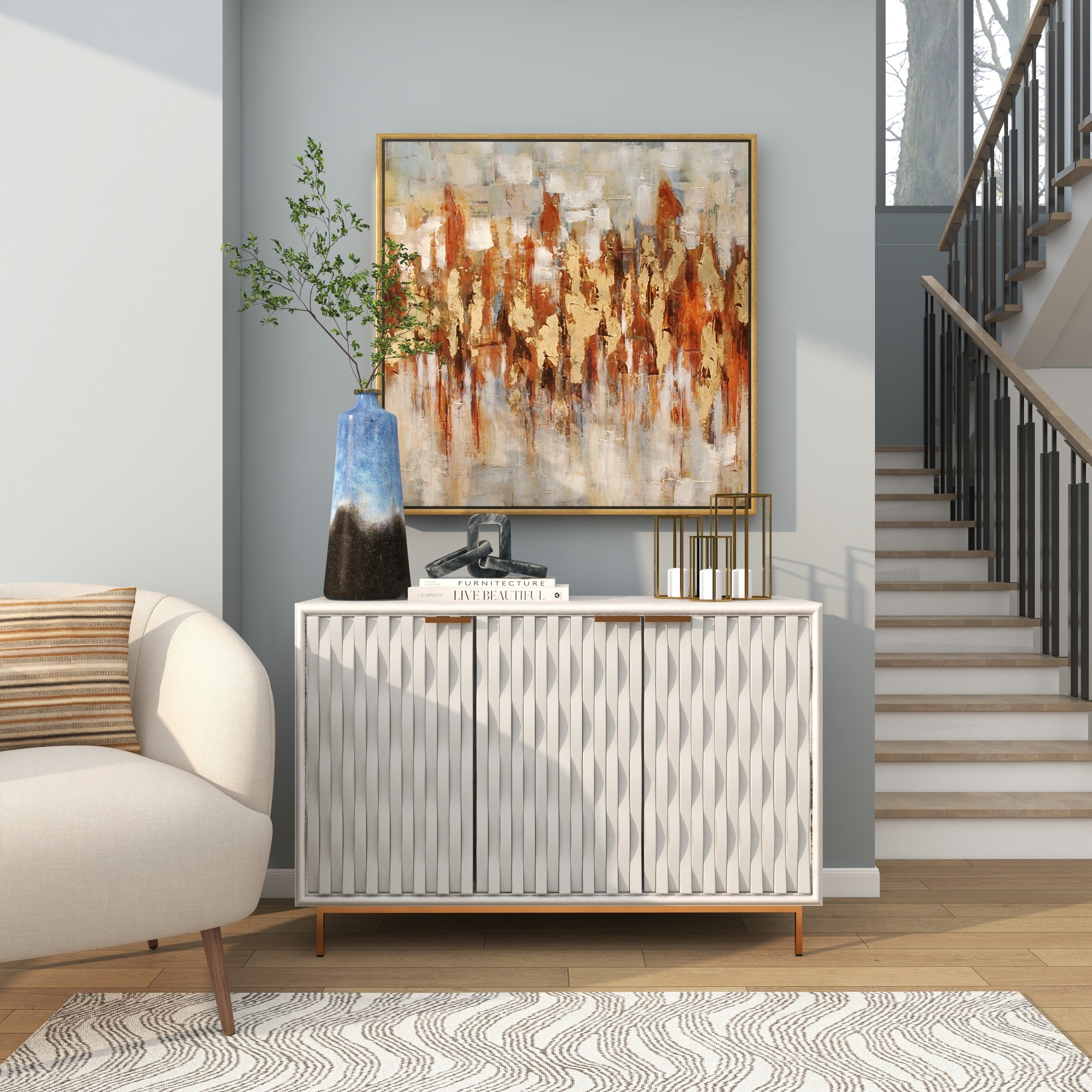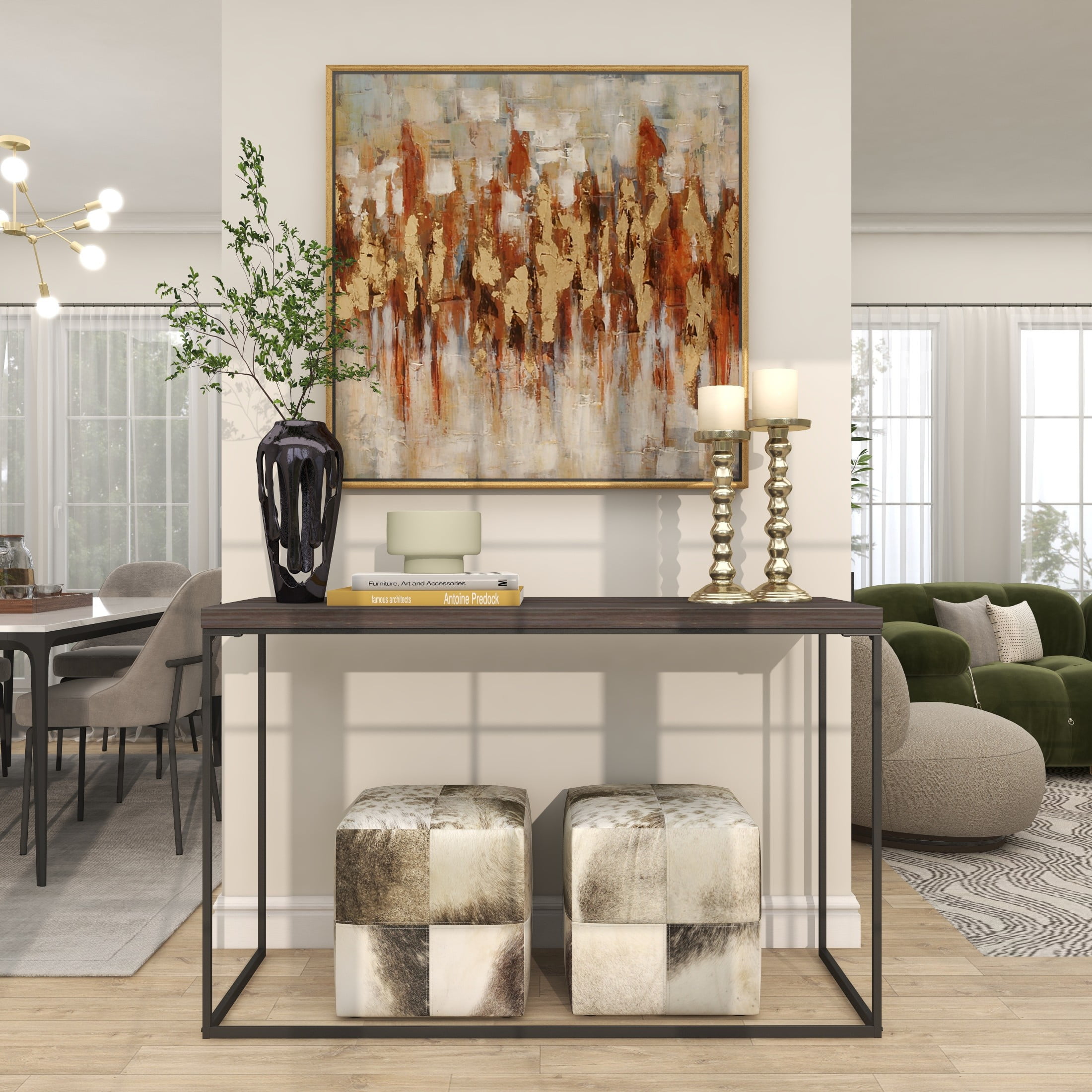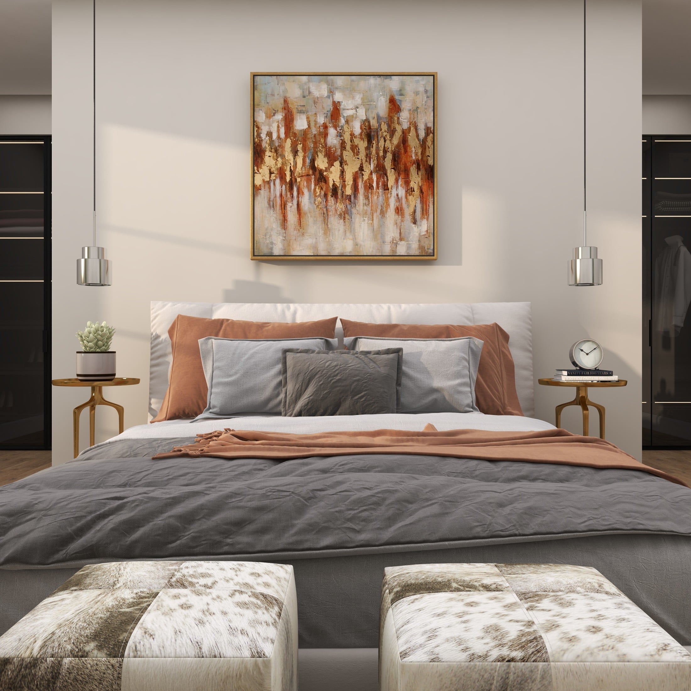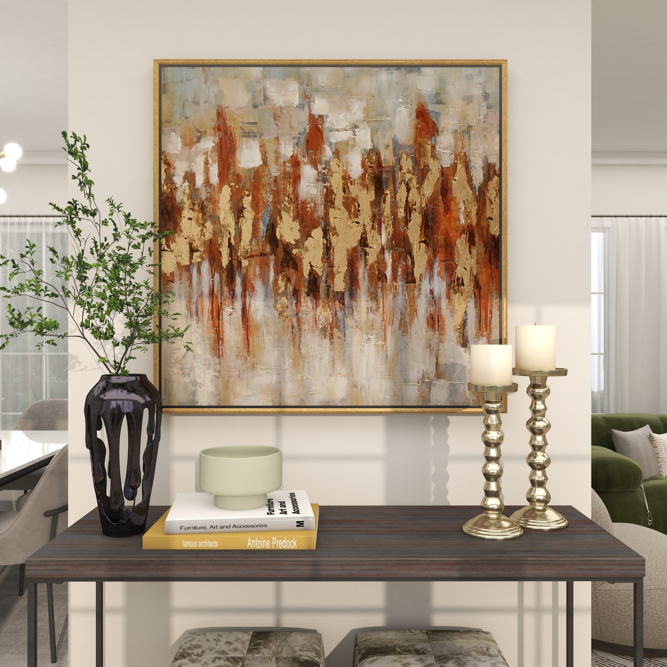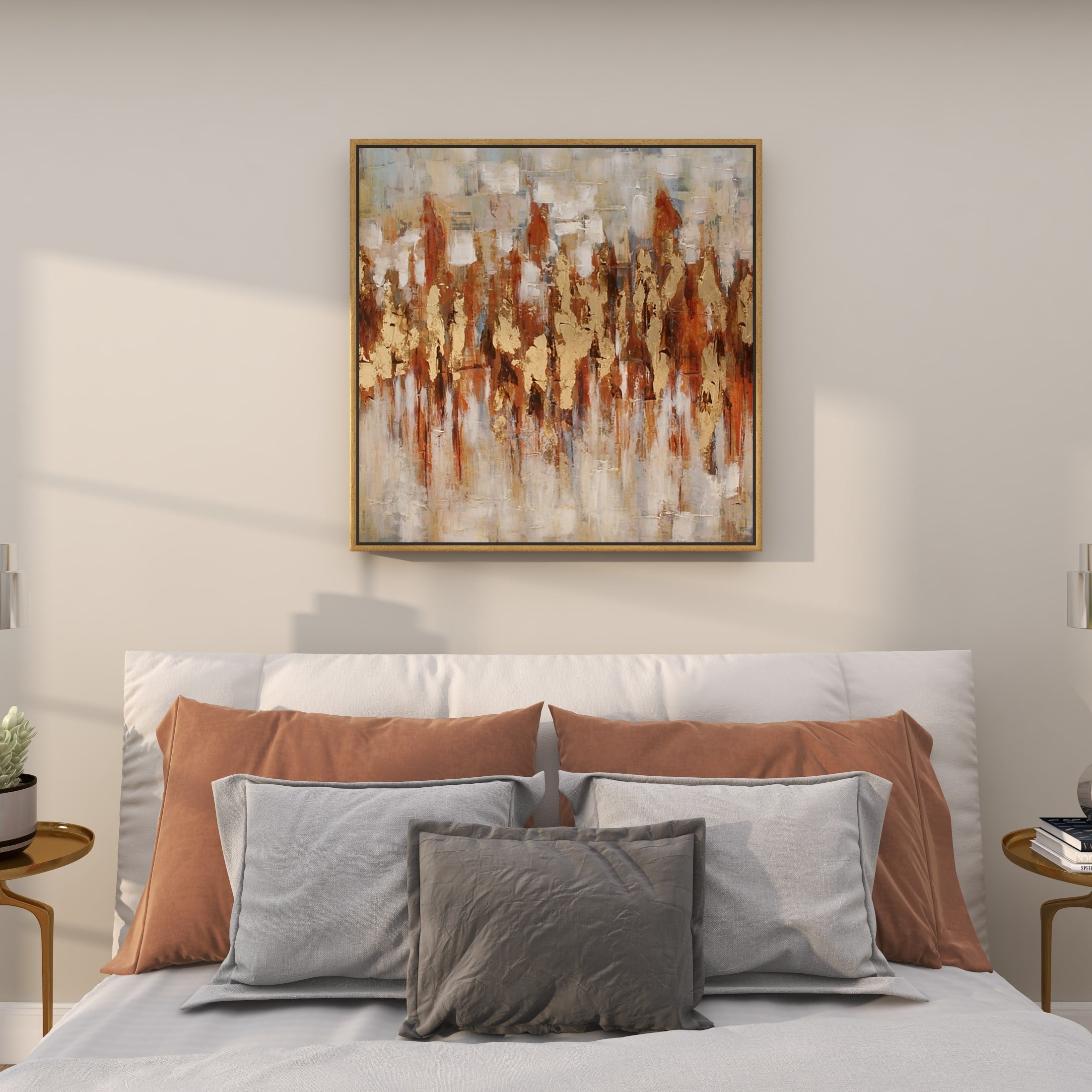 Designed with timeless sophistication, rich old-world textures and warm hues come together for a refined classic taste of luxury This gold living room framed wall art is crafted from polystone, fir wood, and canvas materials This square decorative framed wall art highlights a textured finish with gold, red, brown, white, and gray colors in a gold frame The canvas framed wall art features large abstract brushstrokes and impasto dollops, evoking an artistic landscape The gold canvas framed wall art measures 39L x 2W x 39H inches, and weighs 7.48 lbs This textured gold wall framed art showcases an impressionistic design with a horizontal zigzag pattern within a square frame Wipe clean with a dry cloth The traditional framed canvas art was crafted with a slightly embossed horizontal zigzag pattern on a canvas and enclosed inside a mitered fir frame Traditional style 39″ x 39″ Abstract Framed Wall Art with Gold Frame, by DecMode makes a perfect addition to any home