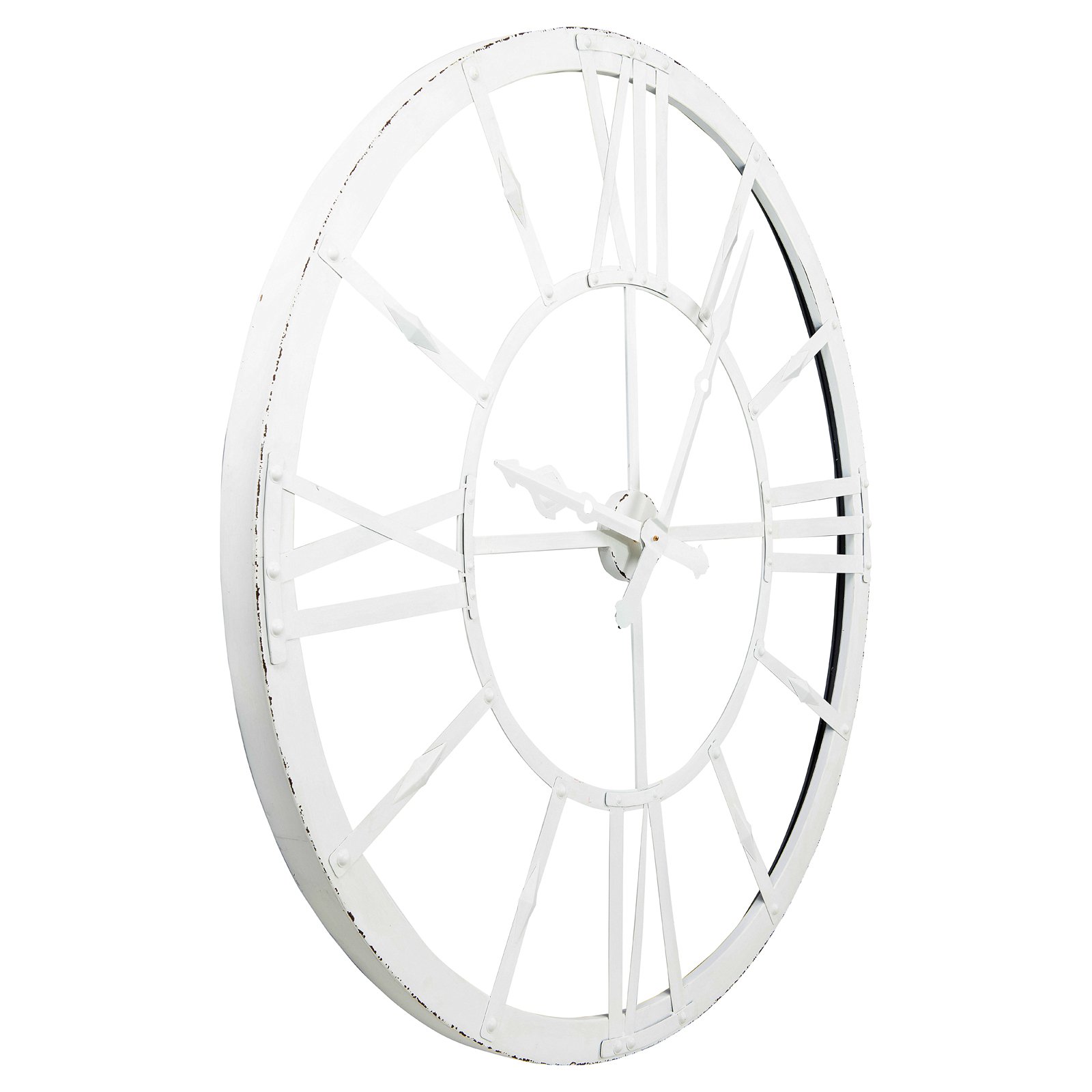 Dimensions: 47.63 diam. x 3.5H in. Choose from available finishes Large Roman numerals Subtle bolt detailing C battery operated (not included)