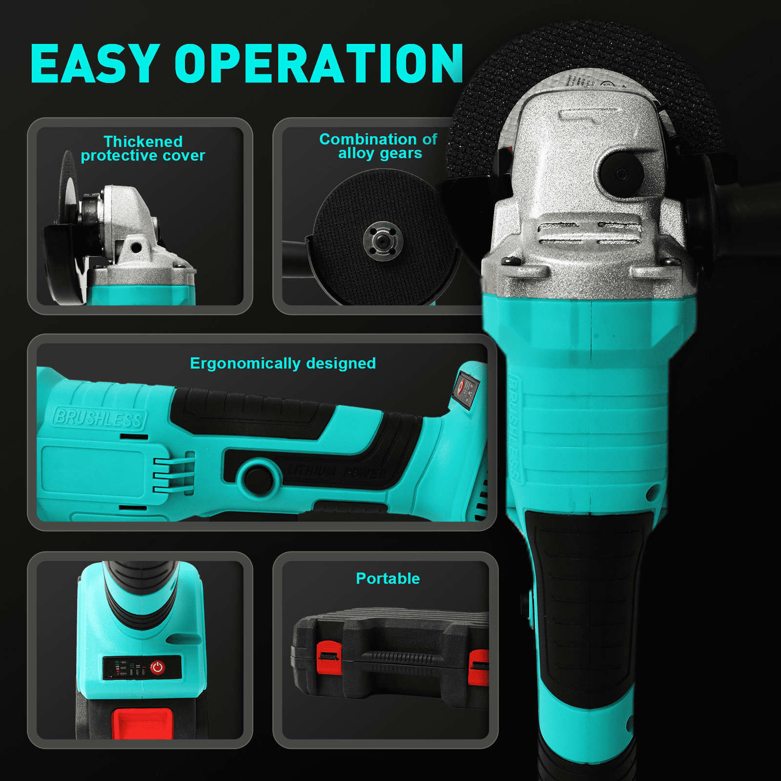 【Pure Copper Brushless Motor, Peak Power】Featuring a top-tier pure copper brushless motor, delivering unlimited powerful performance! Made with 200℃ high-temperature resistant oxygen-free copper material, the motor remains stable under extreme conditions, ensuring efficient work without stalling. Whether cutting, grinding, or polishing, each start is a challenge to the extreme, and each rotation proves its power. 【Detachable Auxiliary Handle, Comfortable Grip】Ergonomically designed, the detachable auxiliary handle is versatile, meeting different operational angle requirements. Whether for long-term work or precise operations, it provides the best gripping experience, effectively reducing hand fatigue and making every operation effortless. 【Alloy Gears and Precision Steel Bearings, Durable Choice】With a combination of selected alloy gears and precision steel bearings, it ensures high wear resistance and efficient transmission. Every detail is meticulously crafted to ensure stable operation under high-intensity work, significantly extending the tool’s lifespan, making it a reliable assistant for long-term use. 【Thickened Protective Cover, Safety Guaranteed】Equipped with a thickened protective cover made of high-strength materials, it effectively prevents spark splashes, ensuring every bit of your safety during work. Attention to detail provides comprehensive safety assurance while you pursue efficiency. 【Strong Heat Dissipation, Long-lasting Operation】The innovative design with enlarged ventilation holes, combined with an efficient cooling system, ensures the motor quickly dissipates heat during high-load operation, effectively avoiding overheating, guaranteeing stable long-term operation without burning out, making your work smoother. 【Toolbox Storage, Convenient Travel】Equipped with a thoughtful toolbox, all accessories and tools are neatly stored, making it not only convenient to carry but also allowing quick access during outdoor work, saving valuable time. Whether for DIY home projects or professional construction tasks, it can easily handle them, turning your toolbox into a true mobile workstation.