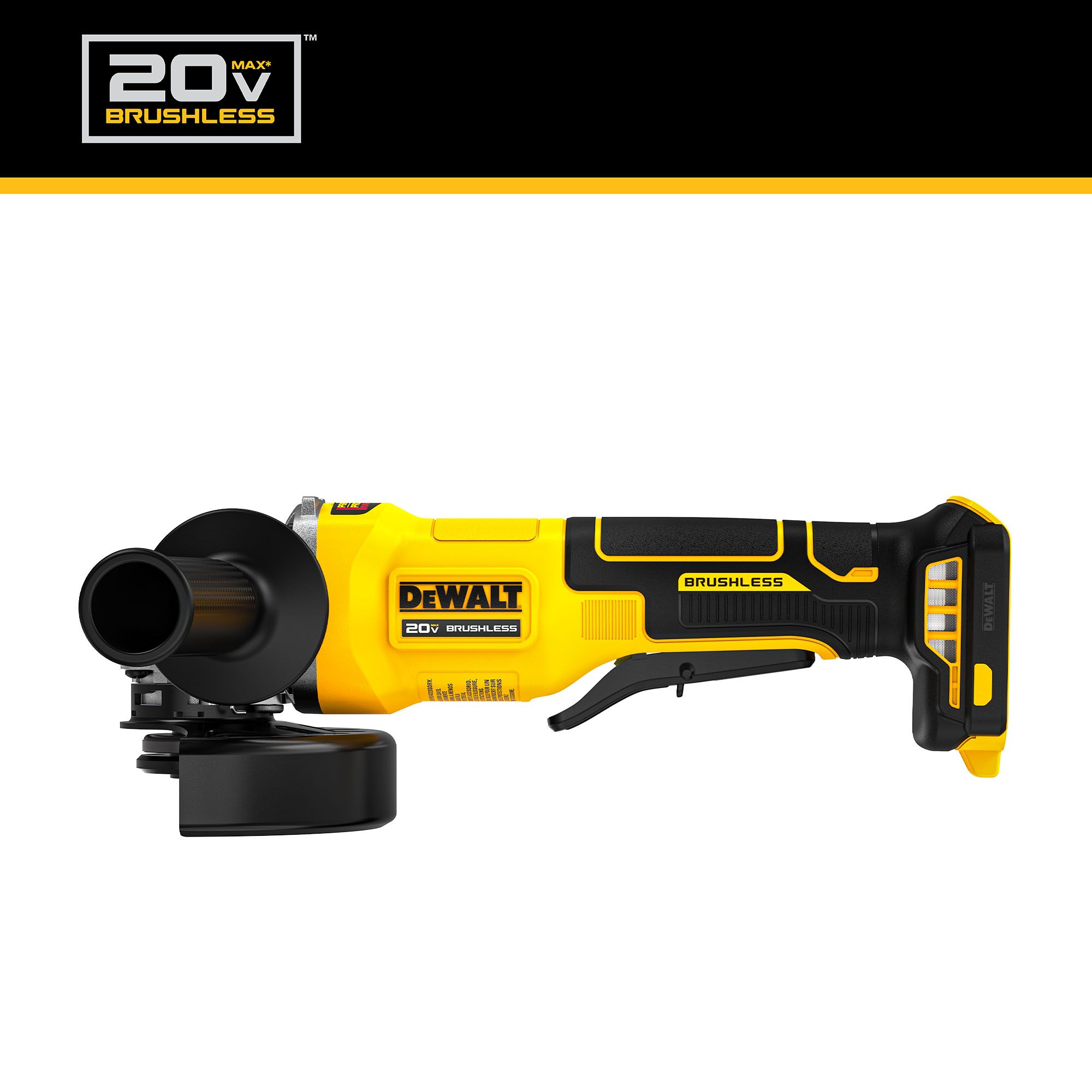 Complete grinding applications with the 20V MAX* Brushless Cordless 4.5 in. Paddle-Switch Angle Grinder that maintains constant speed under load. Equipped with overload protection and an efficient brushless motor, this cordless tool accommodates 4 in. – 5 in. wheels and includes both Type A and Type B guards to help provide 62841 Compliance. Designed for versatility and durability, this grinder features mesh screens that help prevent debris that can cause damage from entering internal components. Offering paddle-switch operation that allows the user to conveniently start and stop their grinder, the 20V MAX* Brushless Cordless 4.5 in. Paddle-Switch Angle Grinder is ideal for tough days on the job (battery and charger are sold separately).||Complete grinding applications with the 20V MAX* Brushless Cordless 4.5 in. Paddle-Switch Angle Grinder that maintains constant speed under load. Equipped with overload protection and an efficient brushless motor, this cordless tool accommodates 4 in. – 5 in. wheels and includes both Type A and Type B guards to help provide 62841 Compliance. Designed for versatility and durability, this grinder features mesh screens that help prevent debris that can cause damage from entering internal components. Offering paddle-switch operation that allows the user to conveniently start and stop their grinder, the 20V MAX* Brushless Cordless 4.5 in. Paddle-Switch Angle Grinder is ideal for tough days on the job (battery and charger are sold separately).