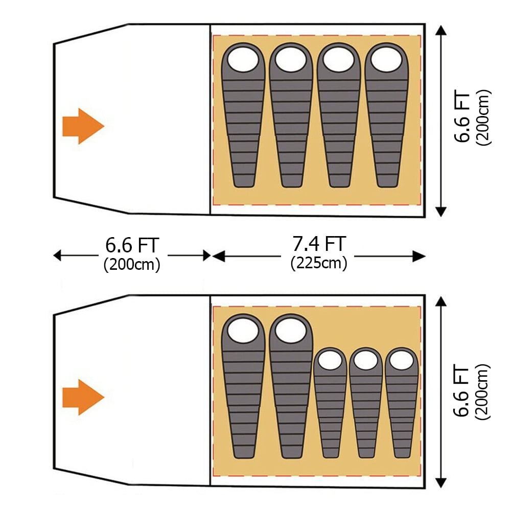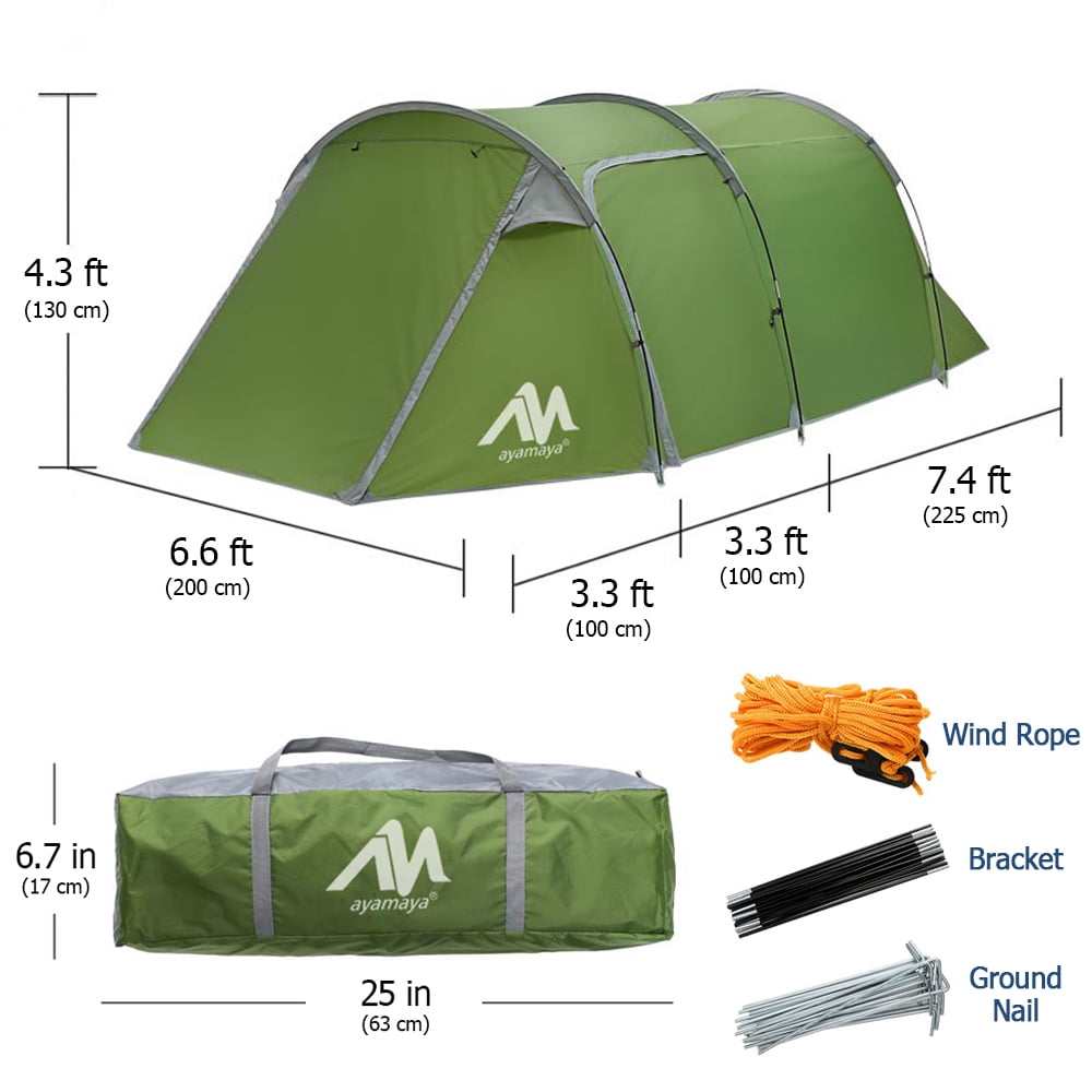 Why a Tunnel Tent? Tunnel tents are usually winners when it comes to low weight and a bit more spacious. Geodesic or inner tents are freestanding, so offer good stability, but with a tunnel tent you need to peg it in the ground as its structure relies on the traction that you create when doing this Features [2 DOOR VESTIBULE] – The bike tent offers 2 doors in the vestibule to provide excellent ventilation, there are two vents in the front door corner, so you won’t feel stuffy even without the door open. And the vestibule in front is a wonderful storage space, you can store your shoes or some other things under it to the left and right side of the door and have enough room for a dog to join you. [Waterproof] – The waterproof tent consists of 2 functional layers, the liner is made of B3 mesh and 190T breathable Polyester, the outer tent is made of 210T Rip-stop Polyester, it has passed the waterproof test with a rating above 3000mm, offers high performance in extreme weather conditions. [ROOMY ENOUGH FOR 4-5 PERSONS] – The size of the entire camping tent is 14ft x 6.6ft x 4.3ft, the sleeping area is 7.4ft x 6.6ft x 4.3ft, it can accommodate up to 4-5 people, the vestibule is 6.6ft x 6.6ft x 4.3ft, the spacious space enlarges your activity area and storage area. [UPGRADE FIBERGLASS] – 3 shock-absorbing poles can support most heavy wind rain and snow. Stay secure. [D-STYLE MESH DOOR] – Inner tent has a large 2-way zipper D-style door with full mosquito mesh protection and improved ventilation. Front and D-shaped side doors allow you to enter or return without crossing over your partner. [EASY SETUP] – The setup of this tunnel tent is easy and fast, insert the 3 shock-absorbing poles into each sleeve, then fix them with tent stakes, the outer tent is set up, then hang on the inner tent, the setup is finished, it could be done within 5minutes by just one person. Specification Tent Size: 14ft x 6.6ft x 4.3ft Sleeping Room Size: 7.4ft x 6.6ft x 4.3ft Material: Made of upgraded 190T polyester and PU2500 special waterproof coating Weight: 11.3lb Capacity: 4/5 Person Layers: Double Season: 4 Season 2 Rooms: One-bedroom and One-living room Multiple Doors: More convenient and more ventilated Application: Camping, backpacking, travel, hiking, mountaineering, survival, fishing, outing Package included 1 x Tunnel Tent 1 x Storage Bag
