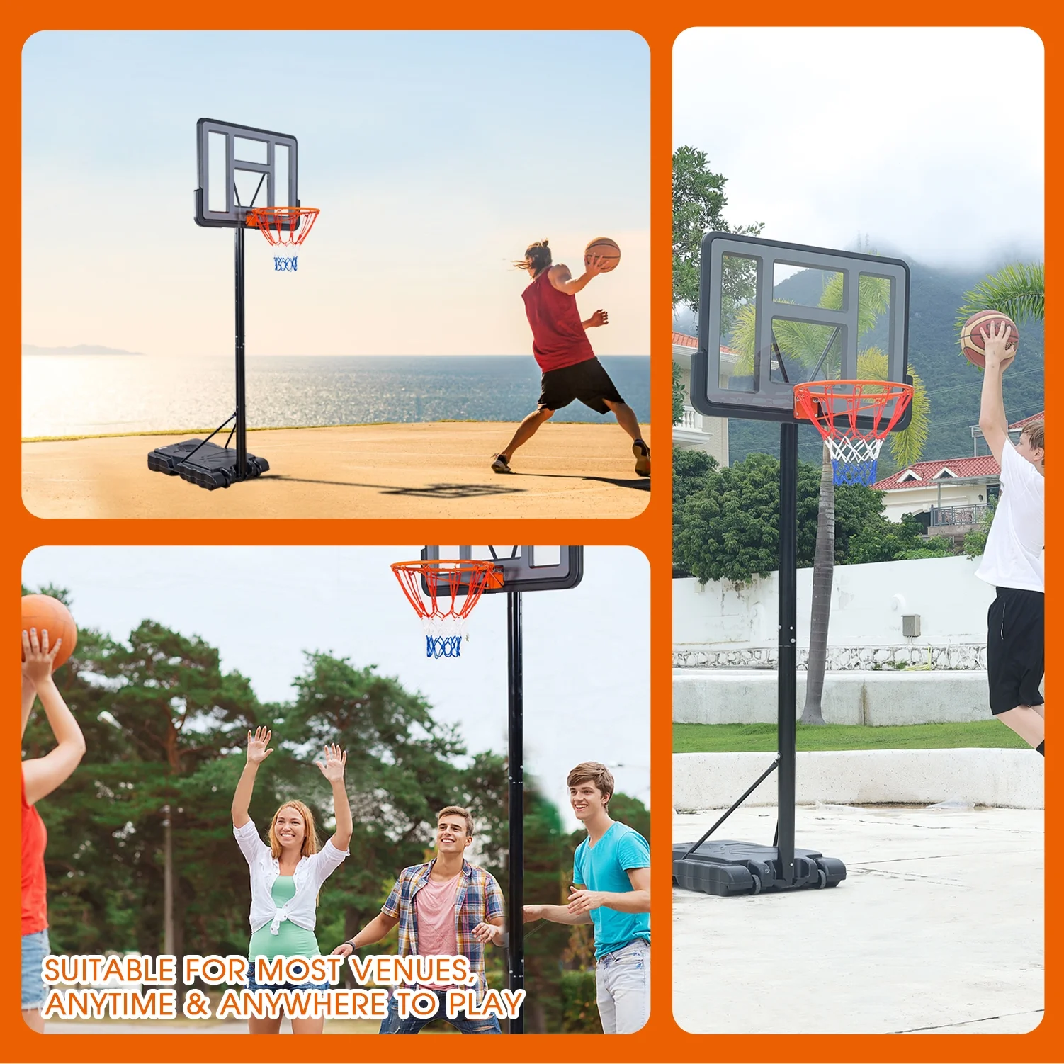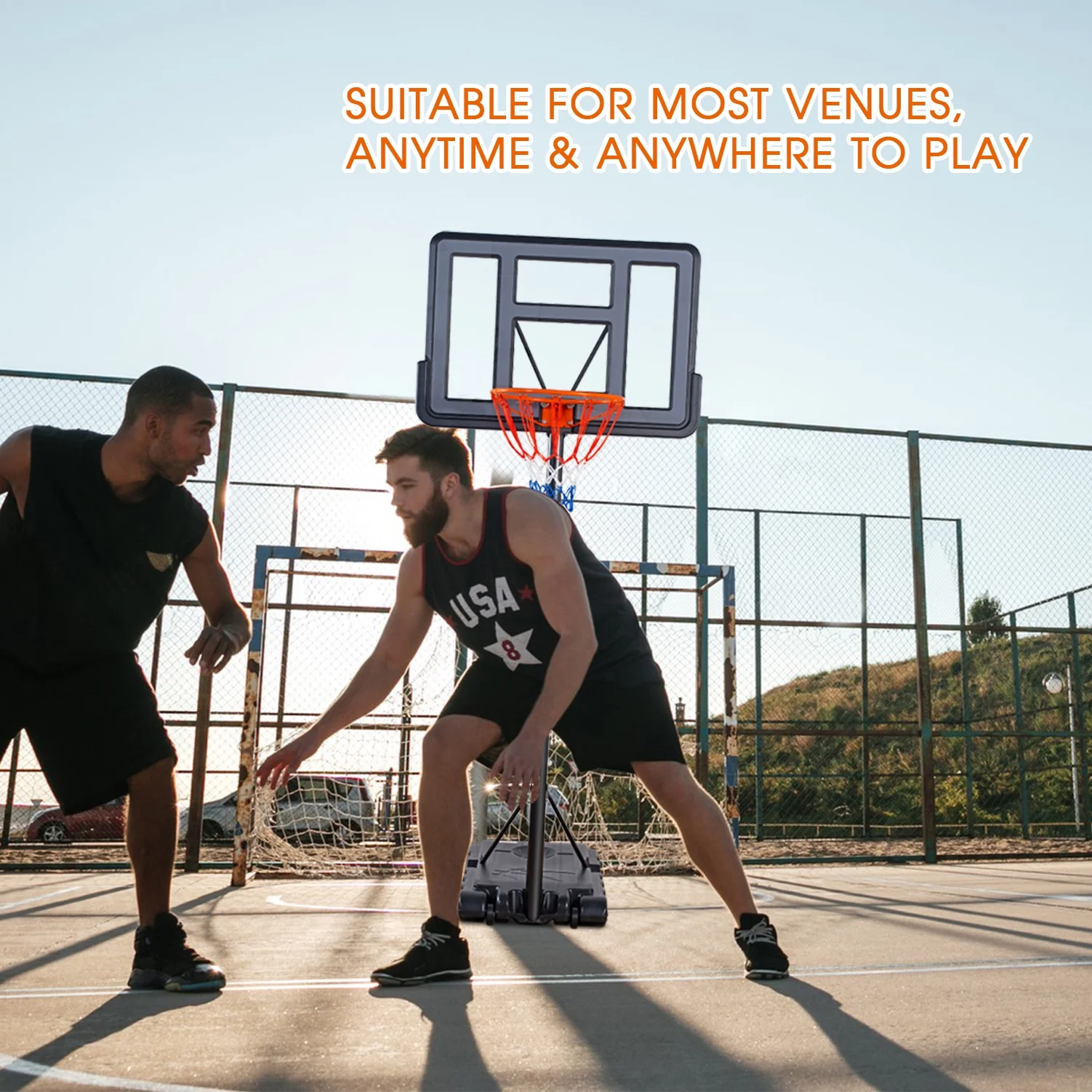4.8ft-10ft Adjustable Height 44″ Shatterproof Outdoor Portable Basketball System (Adult) Backboard Size: 44-inch Polycarbonate Backboard for enhanced durability and performance Rim Diameter: 18 inches, designed for standard play Goal Height: Adjustable from 4.8 to 10 feet, accommodating various age groups and skill levels Portable Design: Equipped with two wheels for easy mobility, allowing for convenient setup indoors or outdoors Stable Base: Features a strong and extra-large base that can be filled with sand (154 lbs) or water (52 liters) for added stability during play Weather Resistant: Constructed to withstand bad weather and intense games, ensuring long-term use