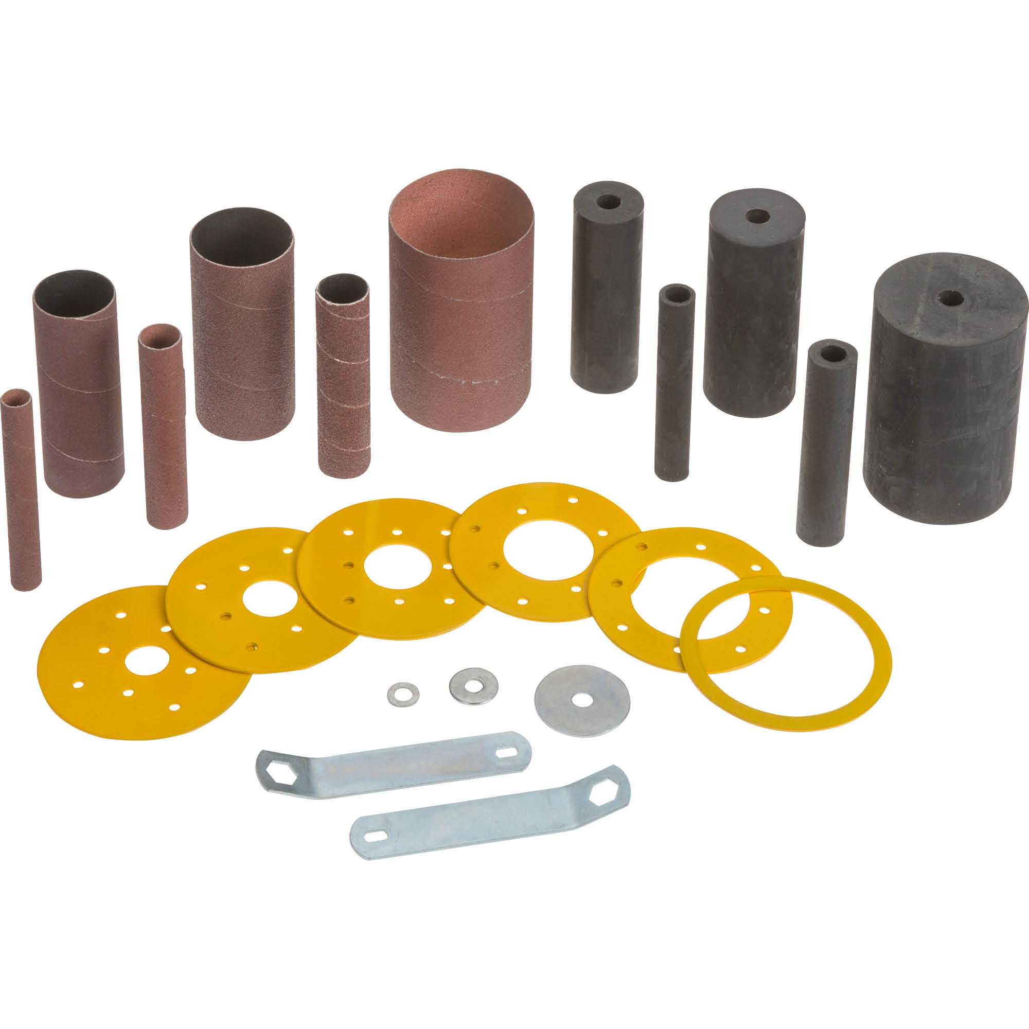 Accessories Included: (5) Rubber sanding drums with a sanding sleeve: 3/4″, 1″, 1-1/2″, 2″, 3″ dia. (6) Table inserts.