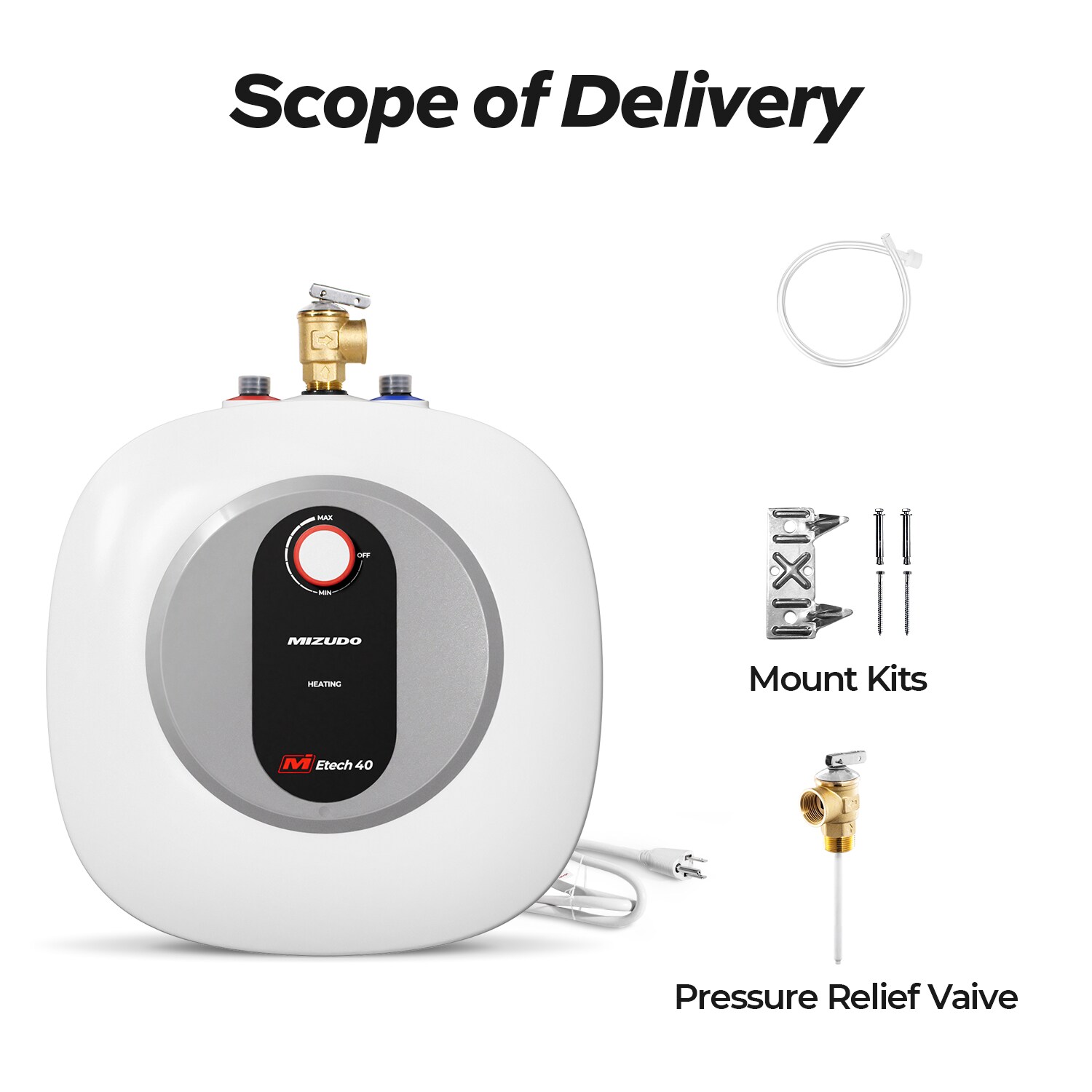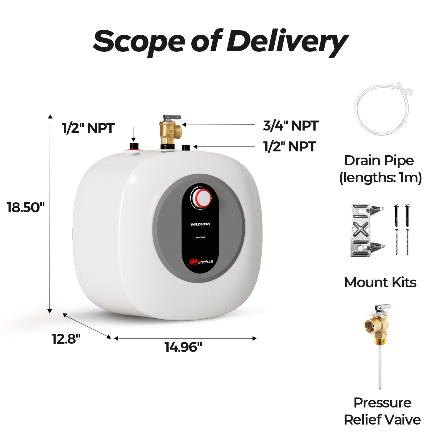MIZUDO Electric mini-tank water heater is perfect for garages, workshops, RVs, and food trucks. Ideal for cupboards, bathroom cabinets and washing machine cabinets. Coated with enamel make it durable and long-lasting. When it reaches 167 F, the high temperature limiting device will shut off the heat and provide protection.