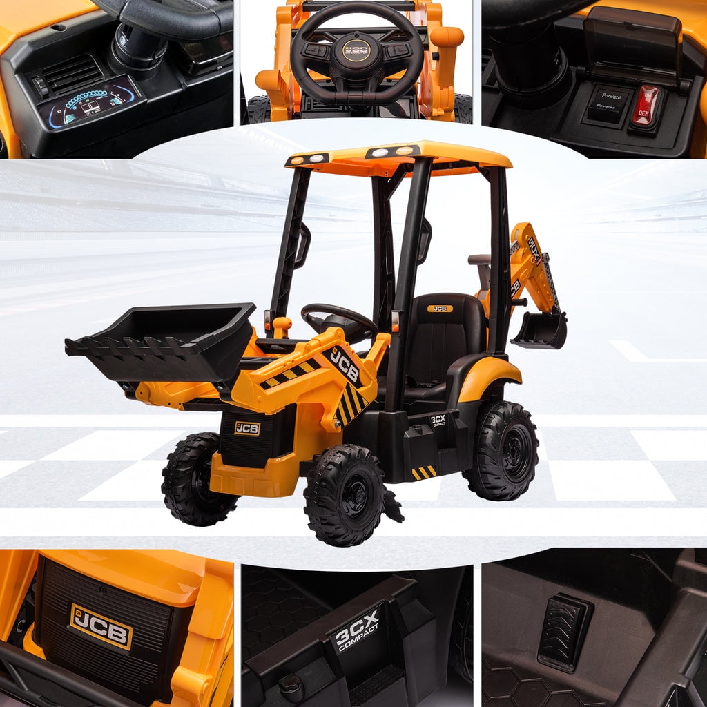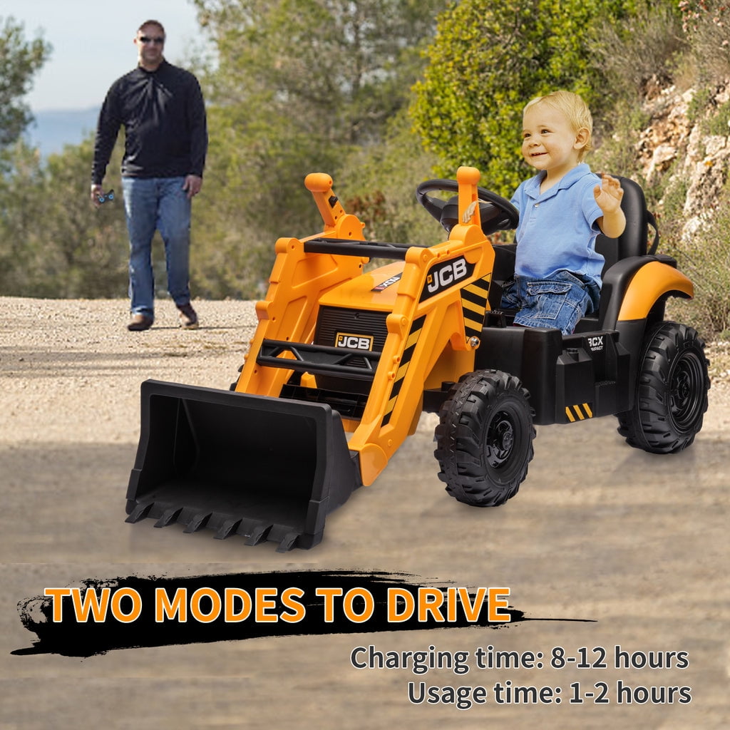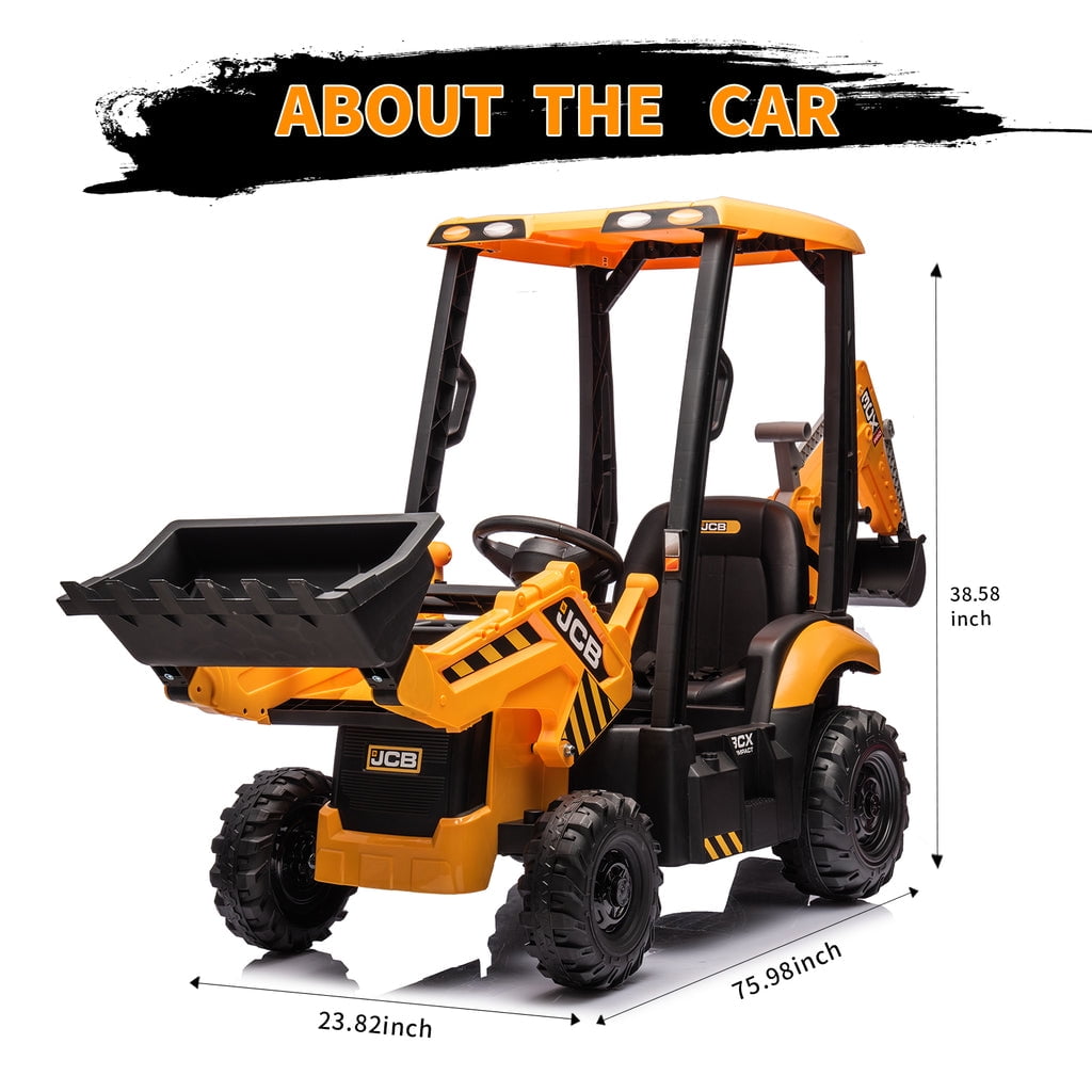 KEENSTONE 12V kids ride-on construction car licensed JCB equipped with a front loader, kids can control the bucket to move up/down, shovel and dump freely through the handle. Changing the direction of the seat can be used as an excavator, and kids can easily operate the handle to make the digging bucket move, dig and dump freely. Through this 2-in-1 car, kids can clean the garden with their parents and also improve their operational and coordination abilities. 2 in 1 Excavator & Bulldozer KEENSTONE 12V kids ride-on construction car licensed JCB equipped with a front loader, kids can control the bucket to move up/down, shovel and dump freely through the handle. Changing the direction of the seat can be used as an excavator, and kids can easily operate the handle to make the digging bucket move, dig and dump freely. Through this 2-in-1 car, kids can clean the garden with their parents and also improve their operational and coordination abilities. Dual Driving Modes The kids electric excavator supports dual driving modes: Parental remote control & Kids manual operation. The electric car can be operated through a 2.4G remote control. If the kid is too young, parents can use the highly sensitive remote control to adjust speed and direction to ensure safety and also enjoy playing with the kid. In addition, children can drive independently through the steering wheel and pedal for a realistic excavator driving experience. 12V Powerful Motors This kids ride-on excavator is equipped with 12V engine and dual rear motors power configuration. Its powerful rear motors and wear-resistant wheels can support a variety of terrain. The quality materials provide a durable construction and provide the kid with a strong weight capacity of 66 lbs for reliable use. Safe Performance & Realistic Design This 12V kids ride on toys is equipped with a ceiling that is not only more realistic but also provides additional protection for children, and the ceiling is detachable, providing a dual driving experience for kids. The spring suspension system to ensure a smooth and comfortable ride. Reinforced three-point seat belts ensure maximum safety for your little one. Rechargeable Battery The package includes a 12V rechargeable battery and two motors, which can be fully charged within 8-12 hours, providing your child with 1-2 hours of playing time. Watch your kids immerse themselves in endless fun. A ride-on car makes an exciting surprise gift for children ages 3-7. Specification Color: Yellow Dimensions: 76*23.82*38.58in Volts: 12V Speed: Maximum 4 Km/h Weight Capacity: Maximum 110 lbs Recommended Age: 3-7 Years Number of Seats: 1 seat Charging Time: About 8-12 h Use Time: About 1-2 h Remote Control: 2.4Ghz, Need 2*1.5V AAA (Not incl.) Remote Control Range: 80-160inch Steering Wheel: Need 2*1.5V AA (Not incl.) Note!!! 1. Children under the age of 6 should drive under the supervision of their parents 2. Due to manual measurement, please allow 1-3cm error 3. Due to display reasons, please allow errors in the actual color and picture