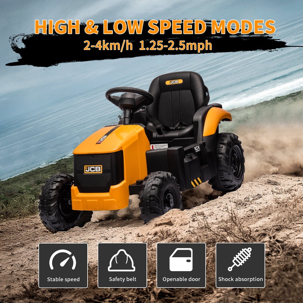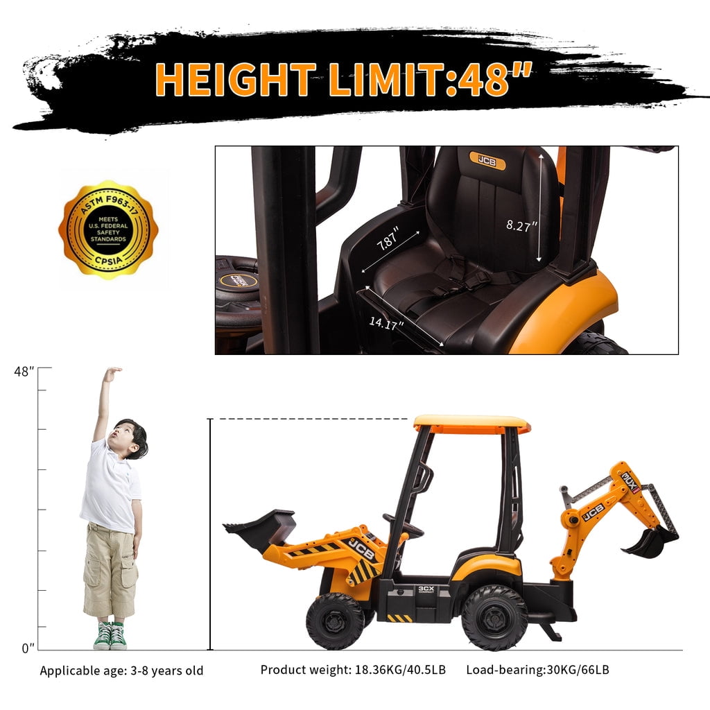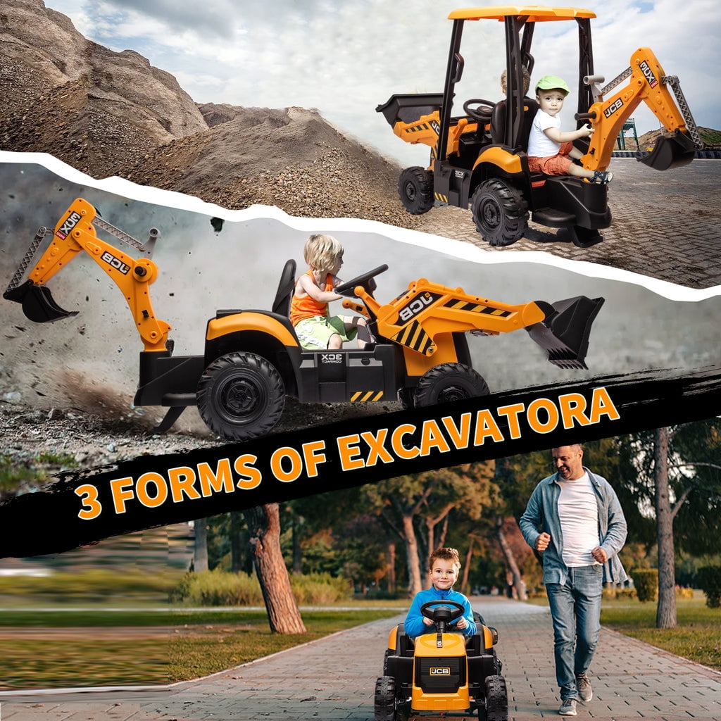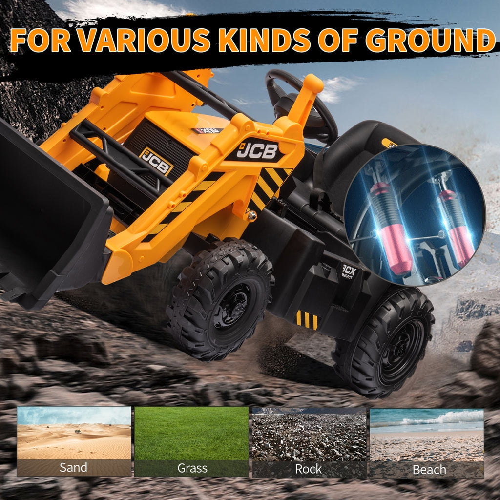 KEENSTONE 12V kids ride-on construction car licensed JCB equipped with a front loader, kids can control the bucket to move up/down, shovel and dump freely through the handle. Changing the direction of the seat can be used as an excavator, and kids can easily operate the handle to make the digging bucket move, dig and dump freely. Through this 2-in-1 car, kids can clean the garden with their parents and also improve their operational and coordination abilities. 2 in 1 Excavator & Bulldozer KEENSTONE 12V kids ride-on construction car licensed JCB equipped with a front loader, kids can control the bucket to move up/down, shovel and dump freely through the handle. Changing the direction of the seat can be used as an excavator, and kids can easily operate the handle to make the digging bucket move, dig and dump freely. Through this 2-in-1 car, kids can clean the garden with their parents and also improve their operational and coordination abilities. Dual Driving Modes The kids electric excavator supports dual driving modes: Parental remote control & Kids manual operation. The electric car can be operated through a 2.4G remote control. If the kid is too young, parents can use the highly sensitive remote control to adjust speed and direction to ensure safety and also enjoy playing with the kid. In addition, children can drive independently through the steering wheel and pedal for a realistic excavator driving experience. 12V Powerful Motors This kids ride-on excavator is equipped with 12V engine and dual rear motors power configuration. Its powerful rear motors and wear-resistant wheels can support a variety of terrain. The quality materials provide a durable construction and provide the kid with a strong weight capacity of 66 lbs for reliable use. Safe Performance & Realistic Design This 12V kids ride on toys is equipped with a ceiling that is not only more realistic but also provides additional protection for children, and the ceiling is detachable, providing a dual driving experience for kids. The spring suspension system to ensure a smooth and comfortable ride. Reinforced three-point seat belts ensure maximum safety for your little one. Rechargeable Battery The package includes a 12V rechargeable battery and two motors, which can be fully charged within 8-12 hours, providing your child with 1-2 hours of playing time. Watch your kids immerse themselves in endless fun. A ride-on car makes an exciting surprise gift for children ages 3-7. Specification Color: Yellow Dimensions: 76*23.82*38.58in Volts: 12V Speed: Maximum 4 Km/h Weight Capacity: Maximum 110 lbs Recommended Age: 3-7 Years Number of Seats: 1 seat Charging Time: About 8-12 h Use Time: About 1-2 h Remote Control: 2.4Ghz, Need 2*1.5V AAA (Not incl.) Remote Control Range: 80-160inch Steering Wheel: Need 2*1.5V AA (Not incl.) Note!!! 1. Children under the age of 6 should drive under the supervision of their parents 2. Due to manual measurement, please allow 1-3cm error 3. Due to display reasons, please allow errors in the actual color and picture