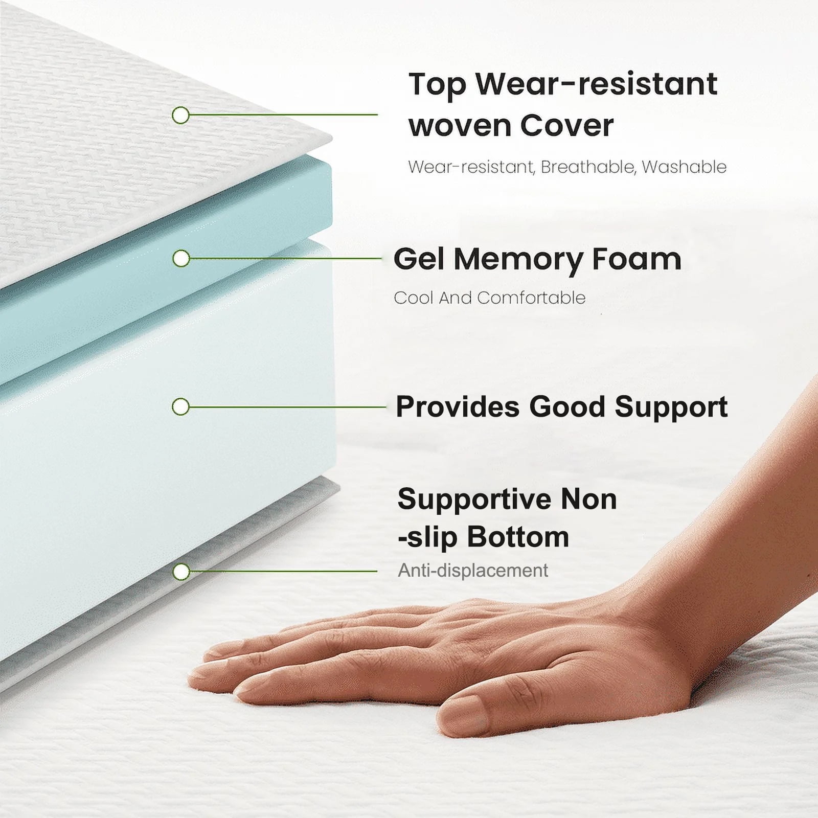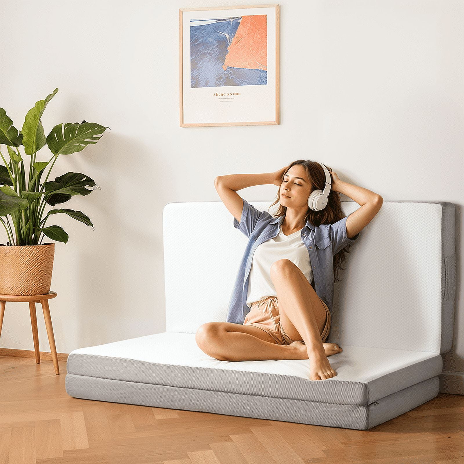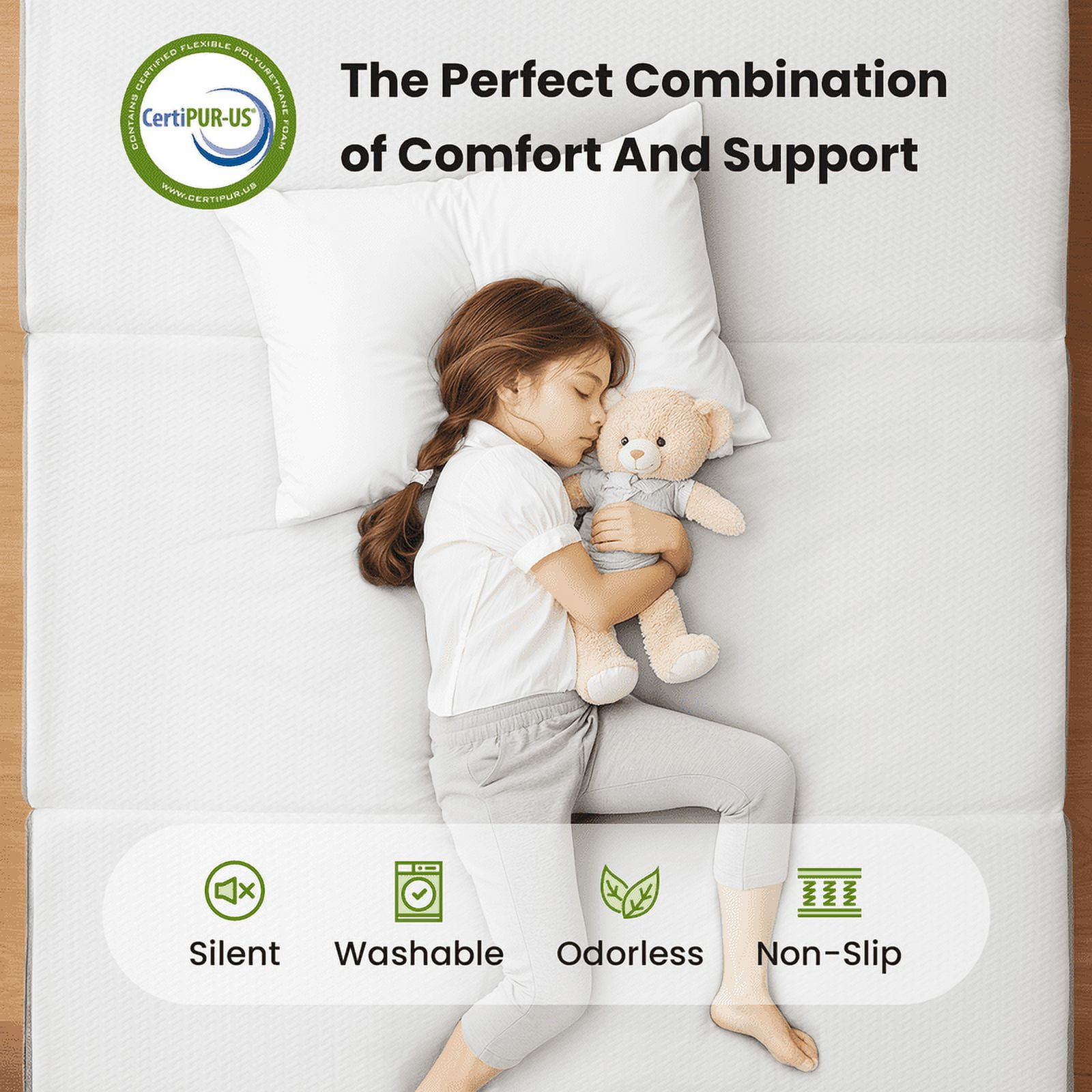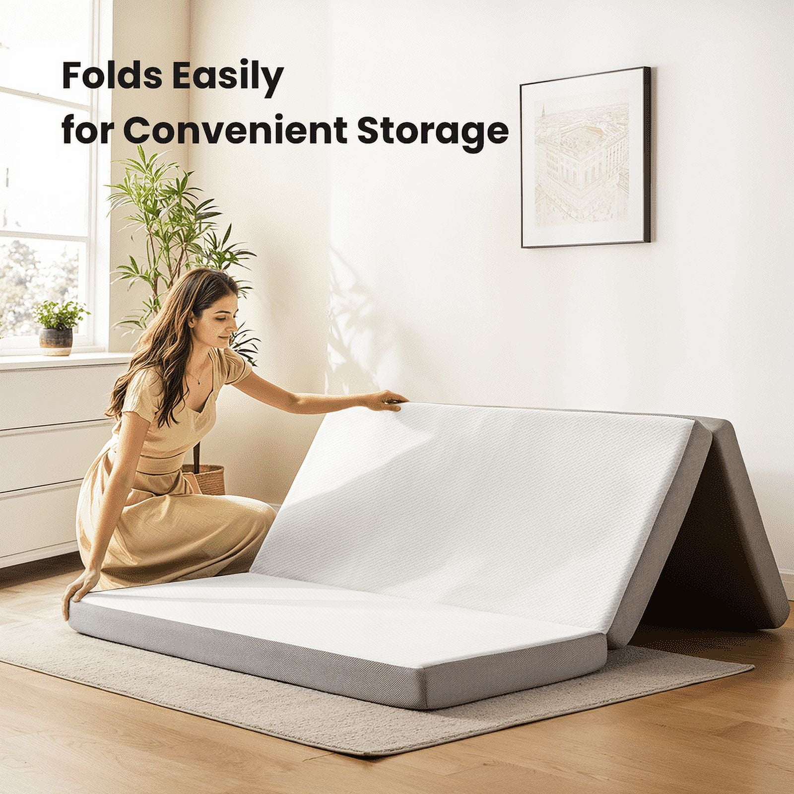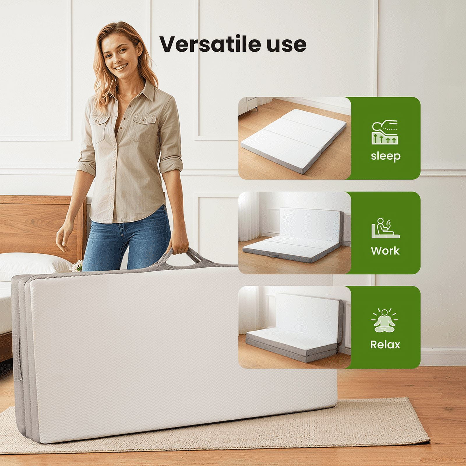 【Tri-Fold Design for Versatile Use】Our tri-fold memory foam mattress topper is the perfect solution for temporary sleeping arrangements, offering instant comfort for unexpected guests or travel. Easily unfolds into a full-size sleeping surface and folds compactly for storage—ideal for small spaces and on-the-go lifestyles. 【Multi-Functional & Space-Saving】Designed for convenience, this mattress topper can be folded into a compact cushion when not in use, saving space in closets or under beds. Take it outdoors as a picnic mat or camping pad—its washable cover ensures easy cleaning after use. 【Premium Comfort with Advanced Support】Layered with 1.5″ cooling gel-infused memory foam for temperature regulation and pressure relief, plus a 2.5″ high-density support base to prevent sagging and keep you elevated off the floor. Enjoy a cool, supportive sleep experience anywhere. 【Easy to Store & Transport】Lightweight and split into three portable sections, this topper sets up or folds away in seconds. Perfect for dorm rooms, apartments, RVs, or travel—stores effortlessly in tight spaces. 【CertiPUR-US Certified for Safety】Made with premium foam that meets rigorous standards for durability, emissions, and content—free from harmful chemicals. Rest assured with a healthier, eco-conscious sleep solution.