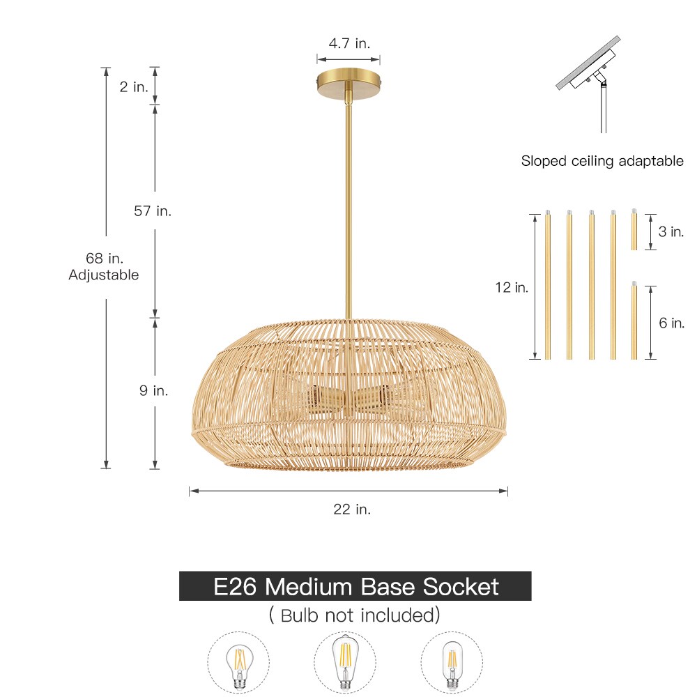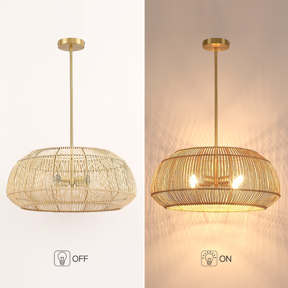 Make a style statement with the coastal-inspired chandelier pendant light. It features brass/gold hardware and hand-woven cage shade which is crafted of natural bamboo and rattan. It’s an unique blend of eclectic nautical and coastal style. Filtering the light from within, each piece creates a play of light and subtle shadow in a room, adding an inviting ambience. This collection can work with a variety of boho decors and even work in homes with coastal or modern styling, which is an ideal selection for over your kitchen island, living room, hall way, foyer, or suspended above your kitchen breakfast bar, dinning room table or bedrooms of any kind